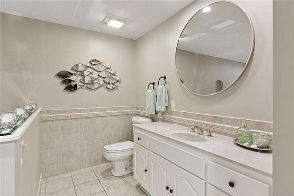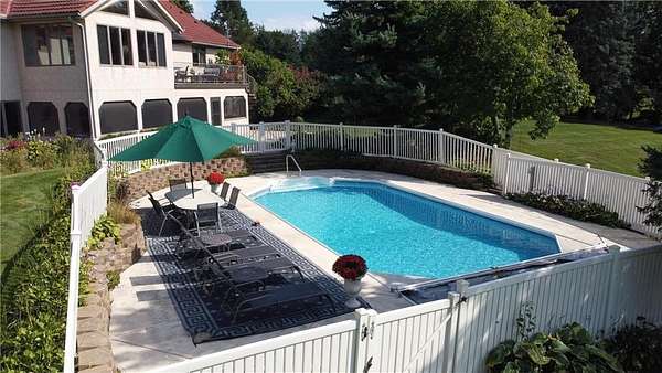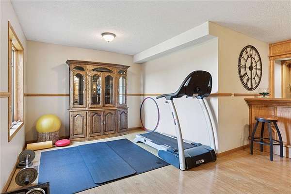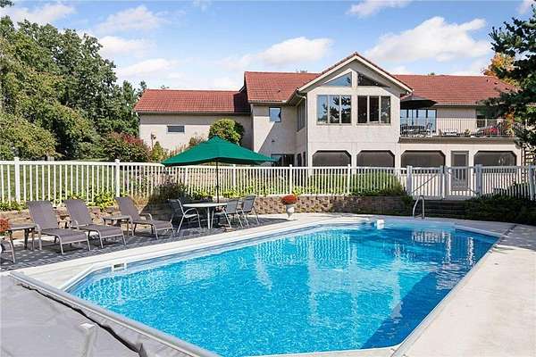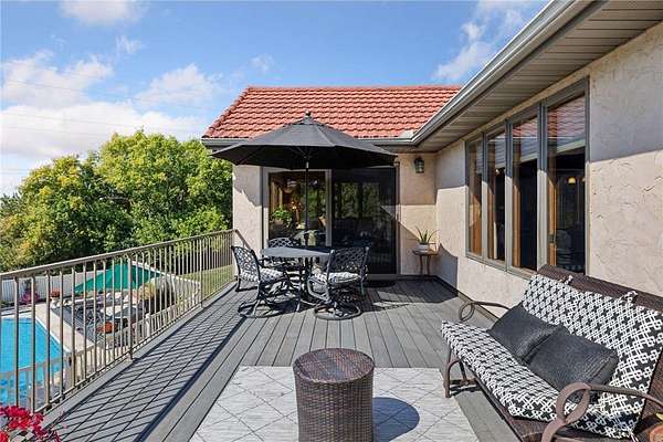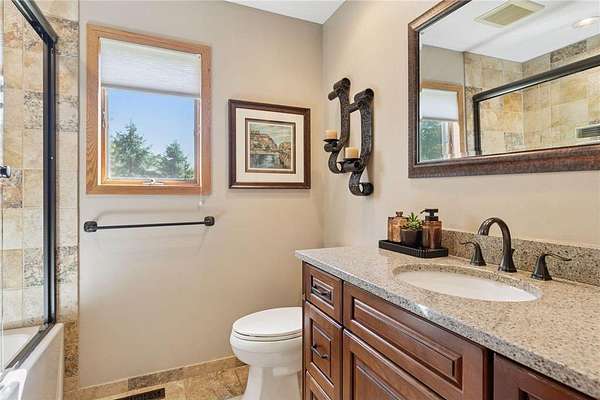 The lower level expands your living and entertaining space with a generous family room featuring a cozy gas fireplace, wet bar, and dedicated wine cellar. A fourth bedroom and full bath, highlighted by a separate jetted tub and large shower with multiple shower heads, offer ideal accommodations for guests or extended living. Just off the family room, a three-season porch creates the perfect transition from the backyard and in-ground pool, making it a natural hub for summer meals and gatherings.