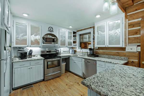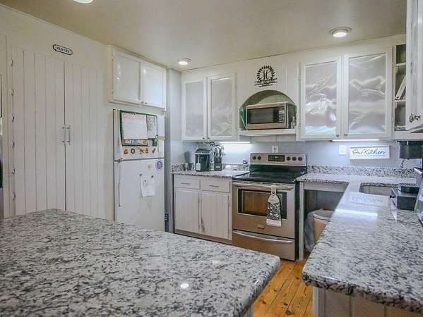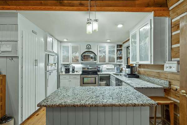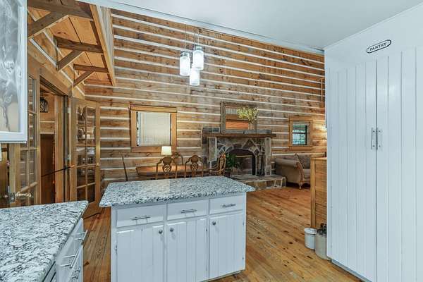 - Beamed Ceilings, Bookcases, Built-In Features, Cathedral Ceiling(s), Ceiling Fan(s), Granite Counters, High Ceilings, High Speed Internet, Kitchen Island, Open Floorplan, Pantry, Split Bedrooms, Stone Counters