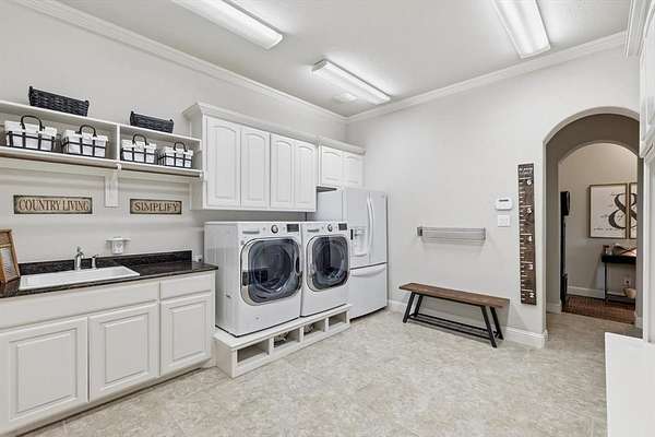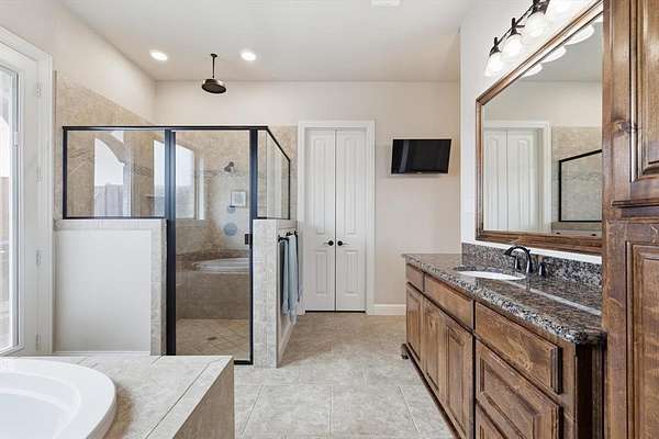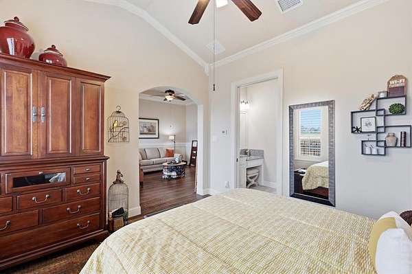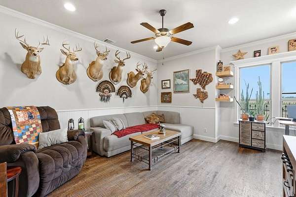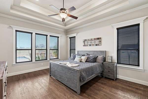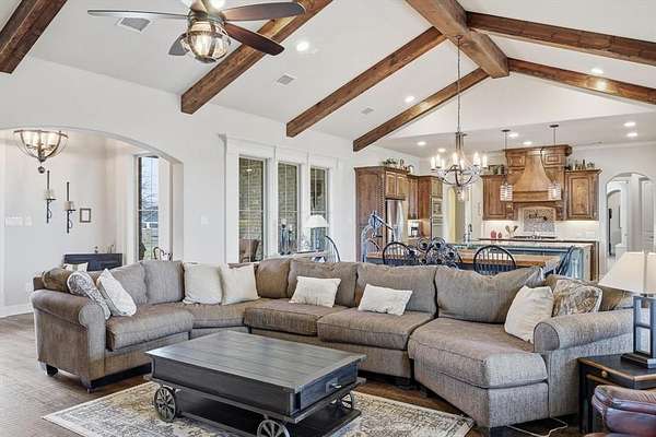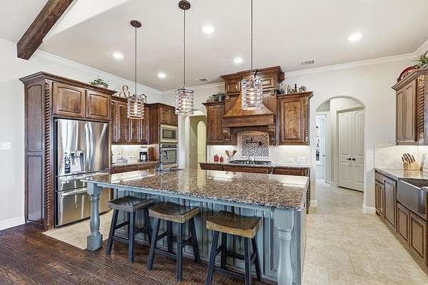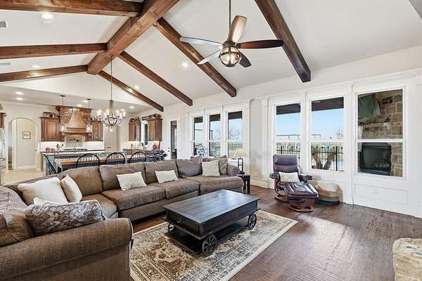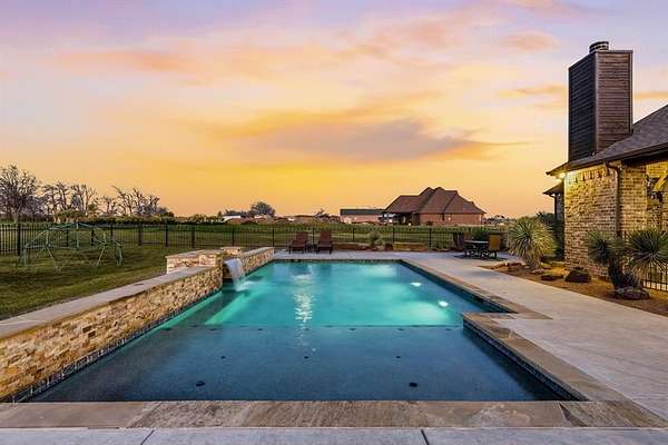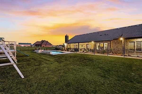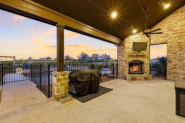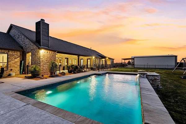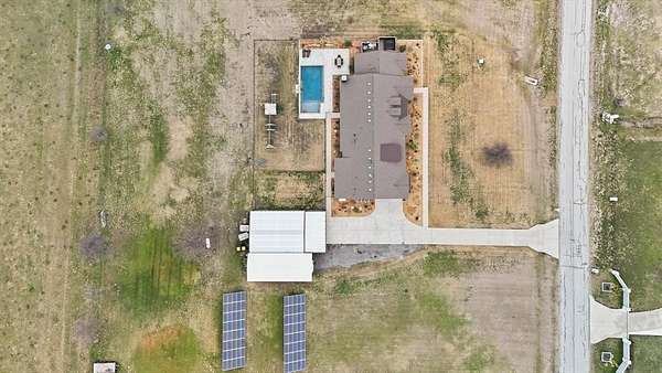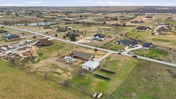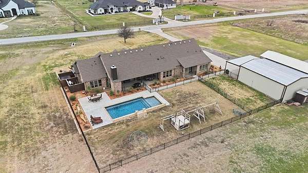 Some homes are built. This one was designed. Custom by Our Country Homes, this home blends craftsmanship, flexibility & wide-open Texas living in a way that feels intentional at every turn. The extended front porch sets the stage for slow, peaceful morning conversations. Inside, the home opens into a true great room where soaring ceilings with exposed beams, rich wood floors, a fireplace, & walls of windows create a space that feels both grand & grounded. The kitchen anchors it all with custom cabinetry, an oversized island & effortless flow into the dining & family areas; perfect for gathering without feeling crowded. Just off the main living space, a custom bar alcove is the perfect addition for entertaining, celebrating, or simply ending the day well. A private bedroom suite offers its own ensuite bath, separate living area, & porch access. Ideal for multi-generational living, long-term guests, or anyone needing a little extra independence within the home. The primary suite is a retreat of its own, complete with its own ensuite bathroom & patio access. Flexibility continues throughout with rooms that easily adapt to work-from-home needs, hobby space, or additional living space. An expansive laundry room provides not just utility, but storage, organization & room to move without feeling tucked away. Step outside & the lifestyle expands even further. The covered back patio, anchored by a stone wood-burning fireplace, creates a year-round outdoor living space overlooking the pool & views beyond. There’s additional patio space for entertaining, dining, & soaking in the quiet. And for those who need space to build, store, or create, the 30x40 insulated workshop with electricity offers the freedom to do just that, whether it's projects, equipment, hobbies, or business. This property was built for freedom. Room to gather. Room to retreat. Room to grow. Wide open land. Custom craftsmanship. This isn't just a home, it's a legacy property!
