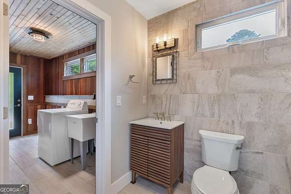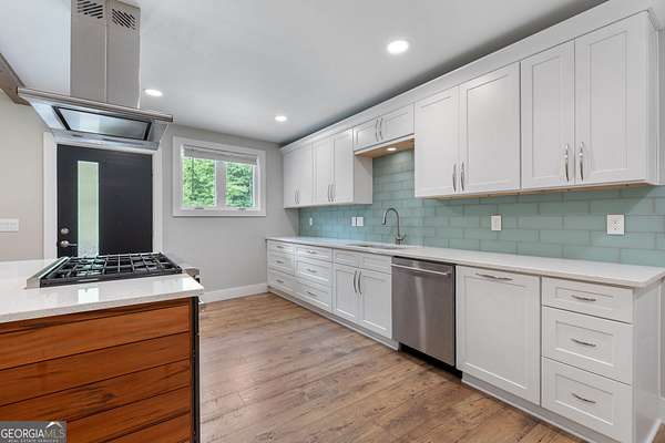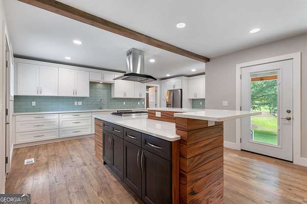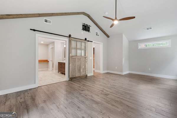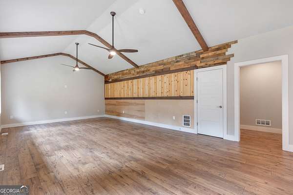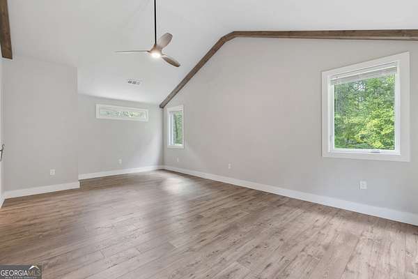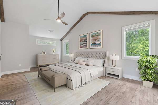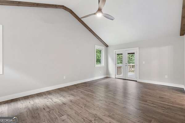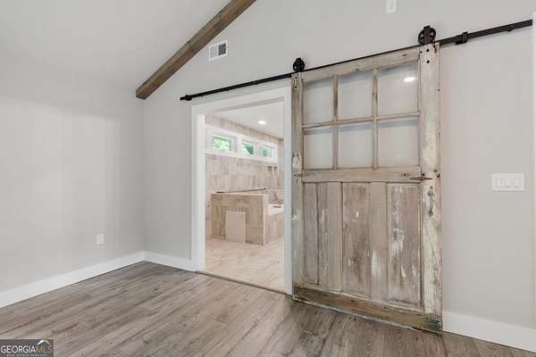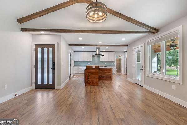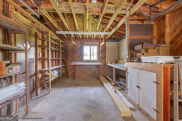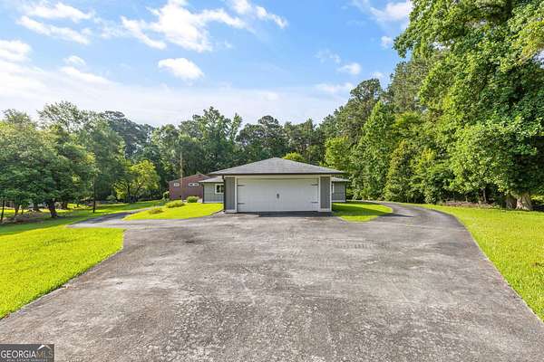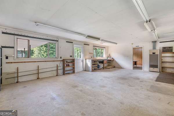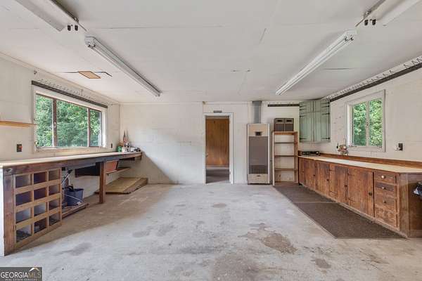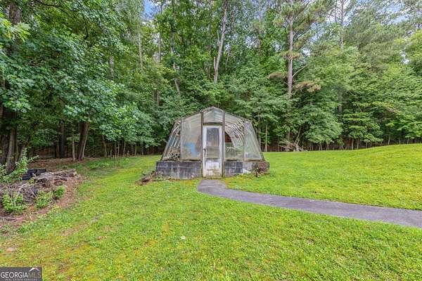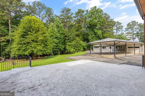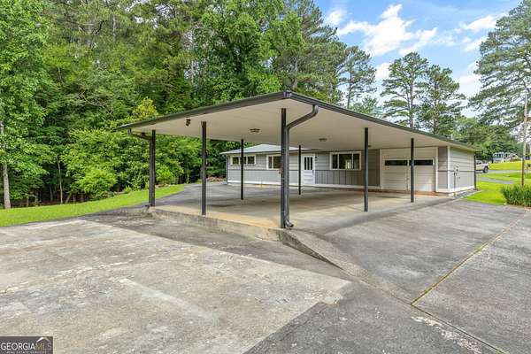 This beautifully remodeled home is set on a serene 3.52-acre oasis with mature holly trees, relaxing views, and no HOA. By appointment only, as this is private property. A true masterpiece, the property features new hardy plank siding, windows, doors, roof, and gutters, accentuated by an exterior Brazilian Tiger wood wall. The home also has impressive 5.5 inch baseboards for a modern touch. ALL NEW: plumbing, electrical, insulation, lighting, flooring, sheetrock, and paint. Step inside to discover a spacious open-concept kitchen and living area, boasting new flooring, stainless steel appliances, a 36-inch professional oven, beautiful quartz countertops, and custom new cabinetry. The centerpiece is a tiger wood wrapped bar/island, perfect for entertaining. Conveniently located off the kitchen is a combined bathroom and laundry room.The sizable primary suite impresses with vaulted ceilings, exposed beams, and French doors that open to a private deck that overlooks beautiful greenery. The luxurious primary bathroom offers a generous shower, air jet soaking tub, double sink vanity, a striking tile accent wall. Outside, a three-car covered carport and a 360-degree driveway with pull-through access provide ample parking. There is room for an RV or work vehicles. Adjacent to the carport is a versatile workshop featuring a large open workspace, an office, and garage door access, ideal for a home business or personal projects. From the workshop, a covered breezeway leads to an enclosed garage perfect for storage, a car, or a boat. There is also a high ceiling unfinished basement with windows. Located in a prime area for Lake Allatoona adventures, with Dallas Landing just around the corner, and close proximity to Historic Acworth, Main Street, and Logan Park, with quick access to I-75.