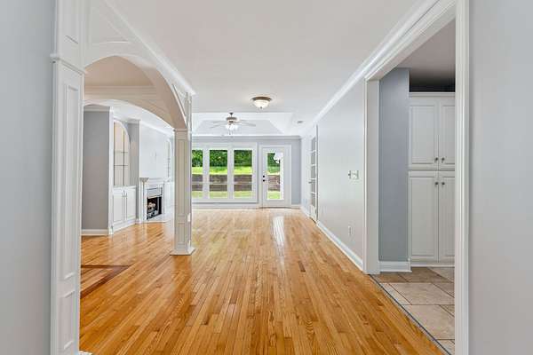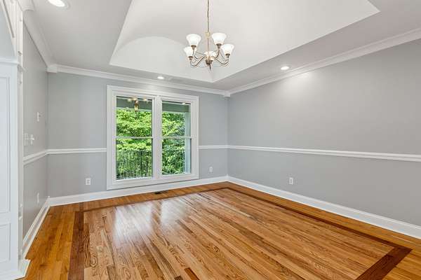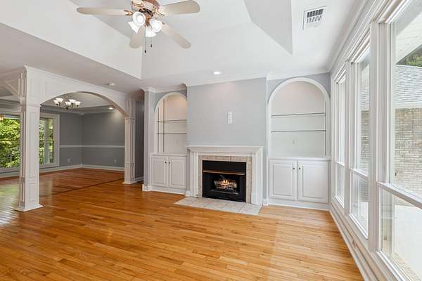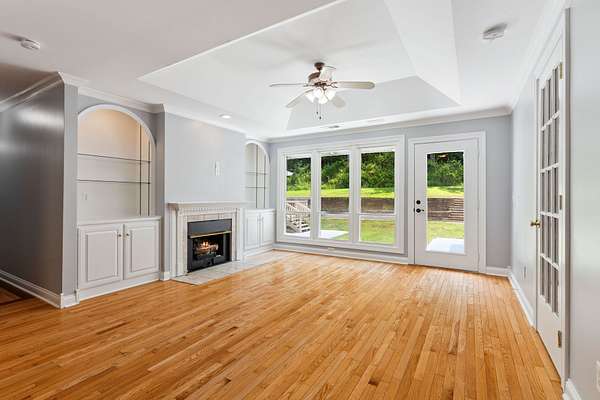 Home features a formal dining room w/ tray ceiling and living room w/ built in book shelves and fireplace, both with beautiful hardwood floors.