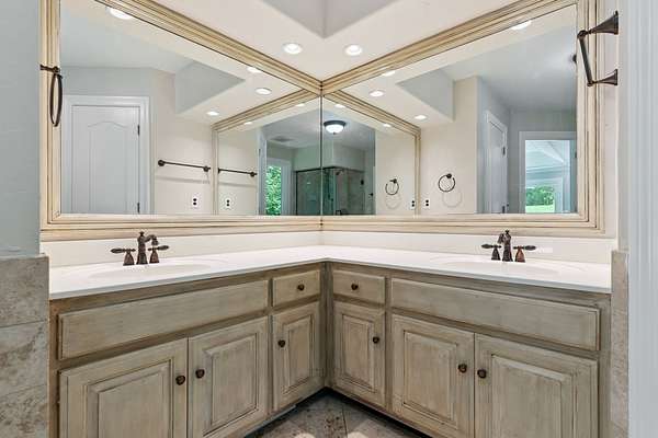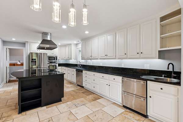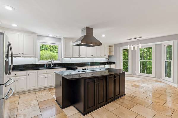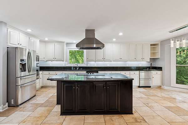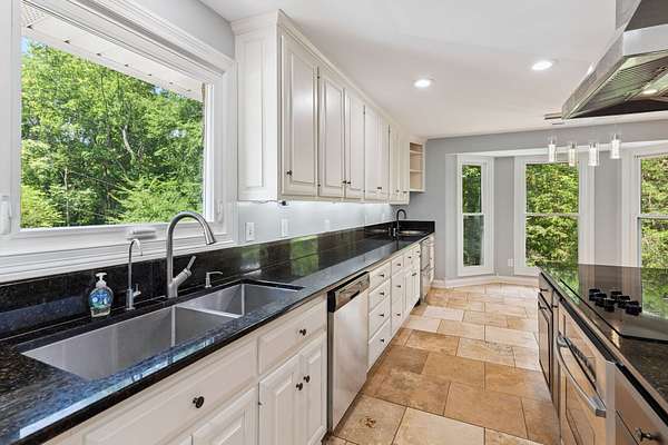 A chef's dream kitchen with endless counter space and cabinets, a large cooktop, two sinks (you'll wonder how you lived with only one before), granite countertops, stainless-steel appliances, and a large bright eat-in area overlooking the forest.