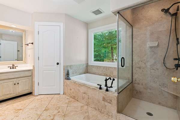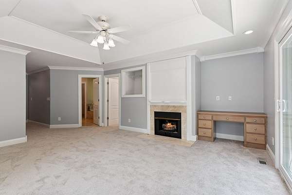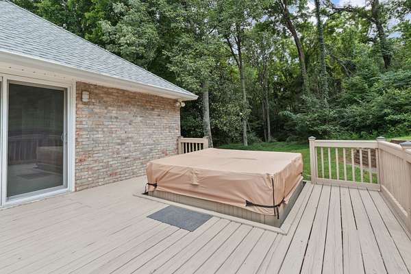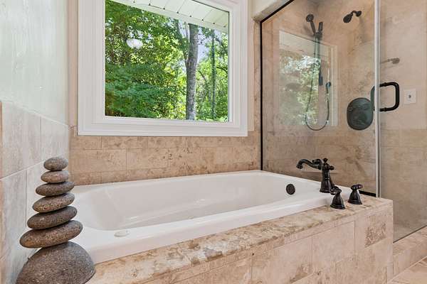 Primary suite with walk-in closet, jetted tub, fireplace, and sliding glass door that opens to a large deck with hot tub.
