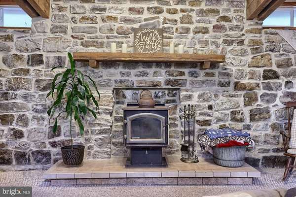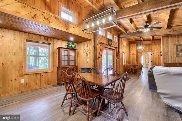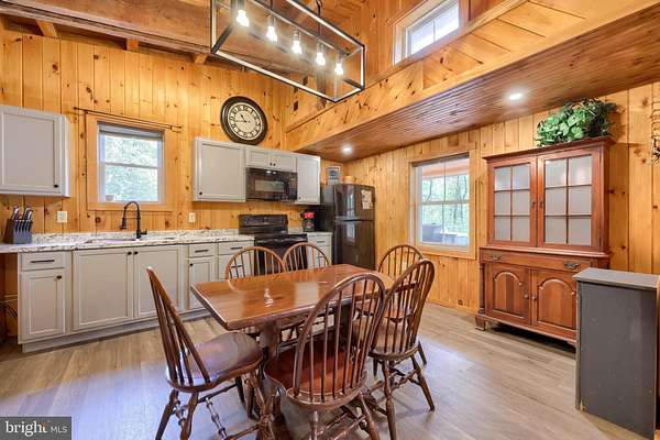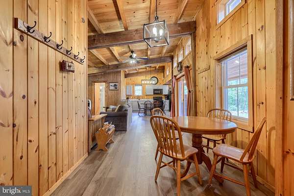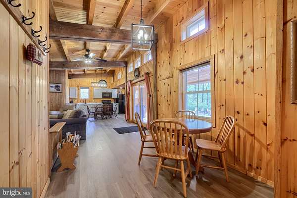 - Combination Kitchen/Dining, Dining Area, Entry Level Bedroom, Exposed Beams, Family Room Off Kitchen, Open Floor Plan, Wood Stove