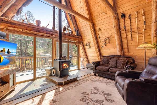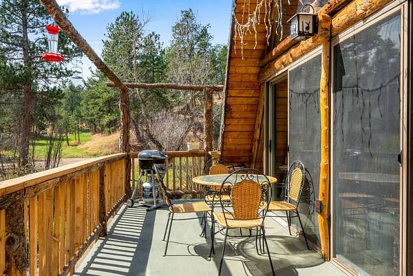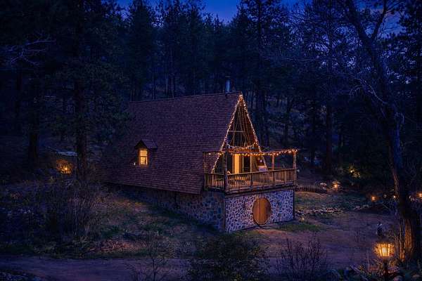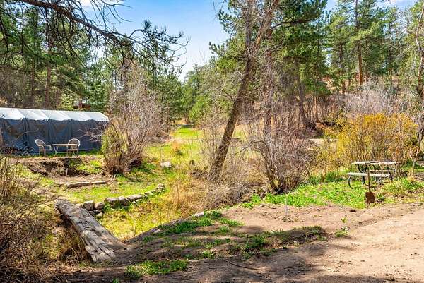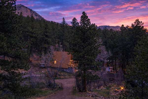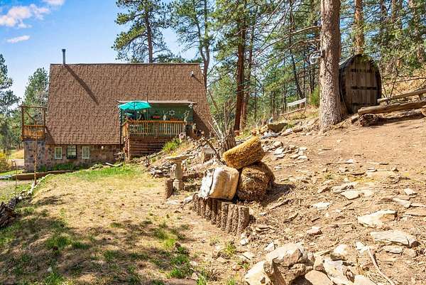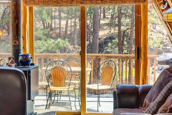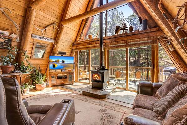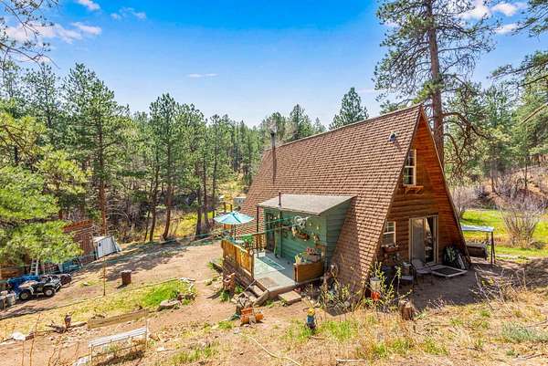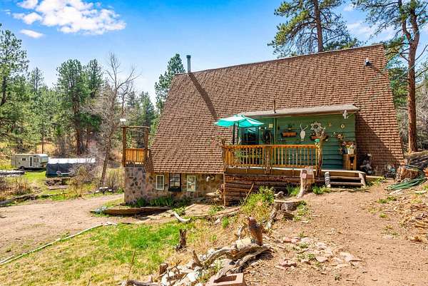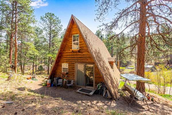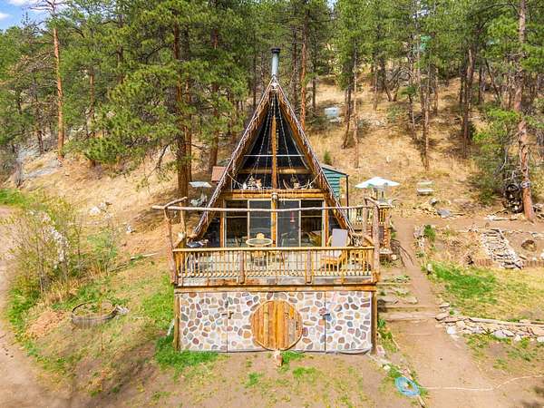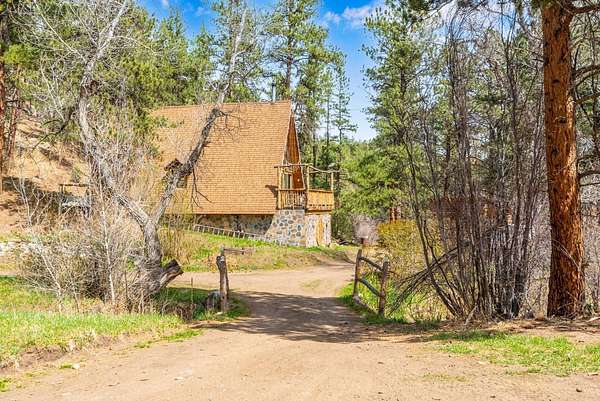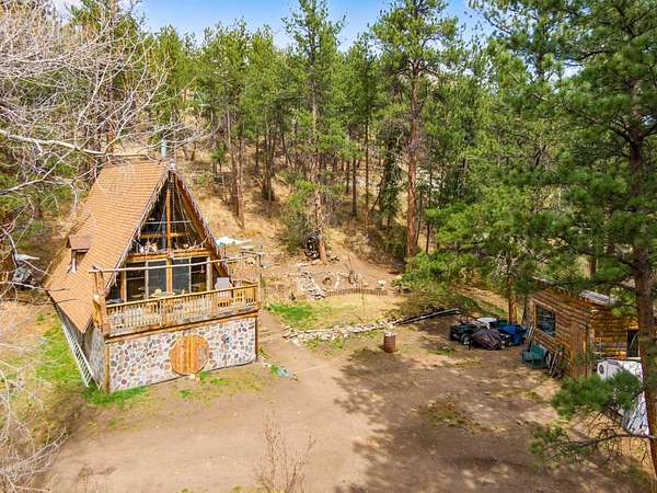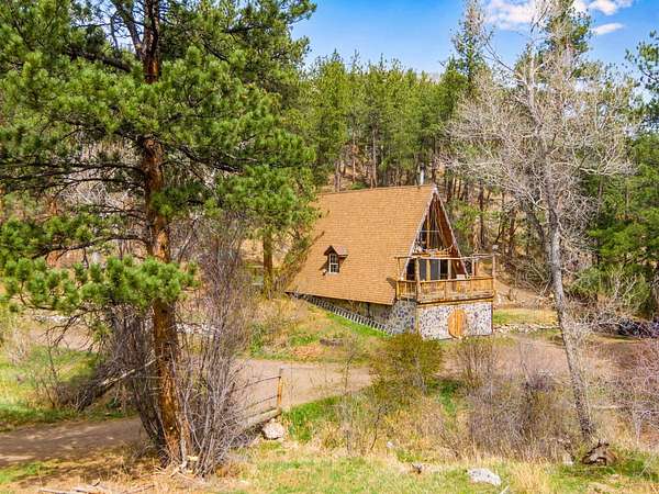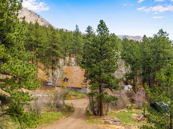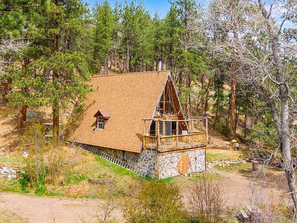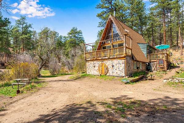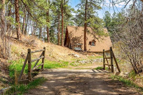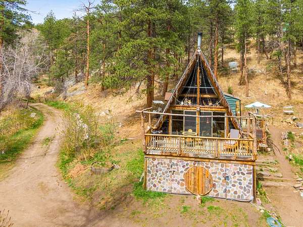 Set at the end of a quiet road on 1.65 private acres, this unforgettable A-frame is the kind of property buyers dream about but rarely find. Surrounded by towering pines, a seasonal stream, and peaceful forest views, this absolute gem delivers the perfect blend of architectural character, privacy, and year-round accessibility. Whether you are searching for a weekend escape, a creative retreat, a remote-work hideaway, or a place to unplug and reconnect with nature, this cabin offers a lifestyle that feels worlds away while still being within easy reach of Loveland and Estes Park. Inside, the home lives far larger than its 834 square feet, with soaring vaulted ceilings, warm wood accents, an open-concept layout, and a lofted upper level that gives the home its iconic cabin feel. The updated kitchen, remodeled bath, natural stone hearth, and high-efficiency Quadra-Fire wood stove create the perfect balance of rustic charm and modern comfort. Large windows and expansive decks blur the line between indoors and out, making the surrounding landscape part of everyday life. Spend your mornings with coffee overlooking the trees, your afternoons working remotely with mountain views outside your window, and your evenings listening to the sounds of the seasonal stream under a sky full of stars. A private half-mile trail leads to a secluded lake and seasonal cascades, while National Forest access sits less than half a mile away. Additional features including supplemental solar, a workshop/shed, forced-air heating, and year-round road access make this a true all-season retreat. This is more than a cabin. It is a storybook mountain escape with timeless A-frame architecture and the kind of setting that makes buyers fall in love the moment they arrive. Touring this beautiful home? You are invited to sit on the deck for a moment and take in the scenery while you are there. Breathe in the fresh mountain air and experience the rare opportunity that could be yours!