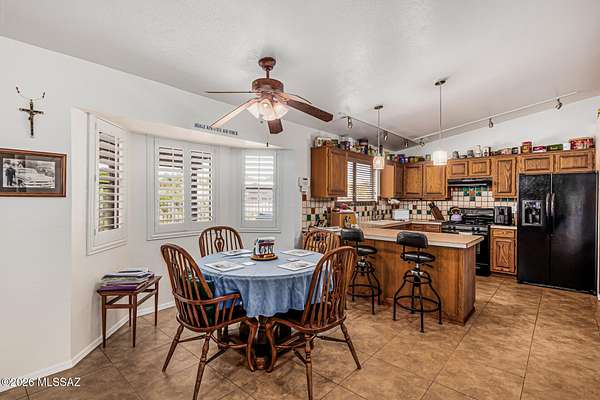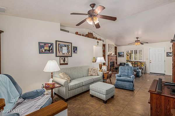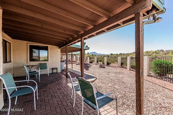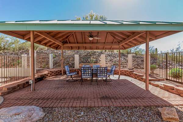 The search is finally over! This delightful 3-bedroom, 2-bath property features a circular driveway, a 5-car garage, and a lovely desert landscape. Inside, you'll find a serene living room with vaulted ceilings, a soothing palette, plantation shutters, durable tile flooring, and an inviting fireplace for cozy moments. The eat-in kitchen comes with ample wood cabinetry, a tile backsplash, pendant/track lighting, built-in appliances, a pantry, and a peninsula with a breakfast bar for quick meals. The main bedroom includes a private bathroom with dual sinks and a walk-in closet. Imagine enchanting evenings in the backyard, complete with a covered patio, a charming gazebo, stylish pavers, a refreshing pool, and breathtaking mountain views for a picturesque backdrop. Make this gem yours!