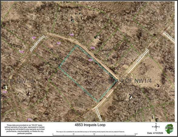 From Motley, north on hwy 64 for 13.5 miles to right onto 76th Street SW, take King Richard Ave SW, Robin Hood Lane SW and Eastgate Road SW to Iroquois Loop.