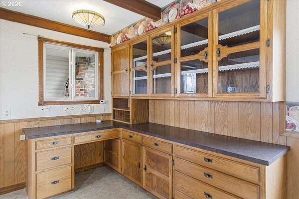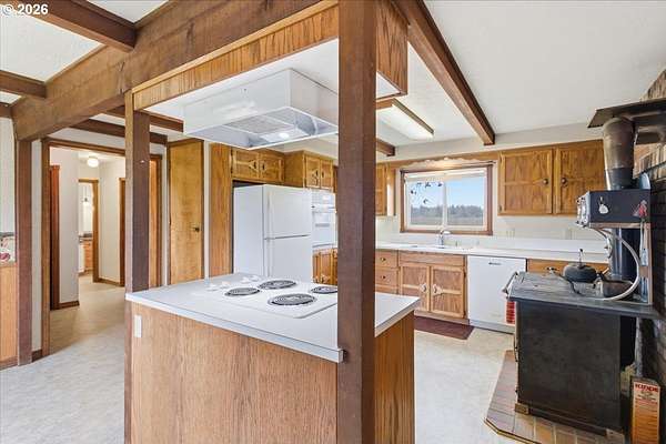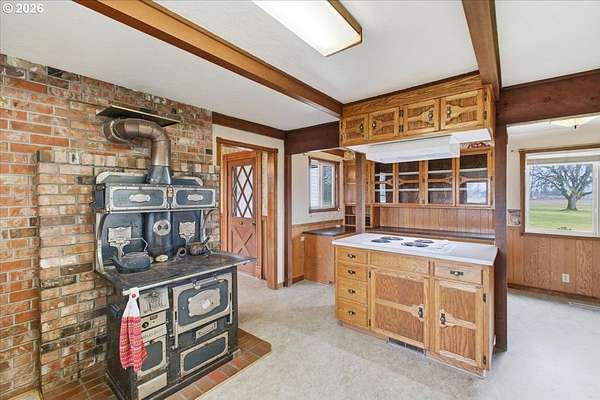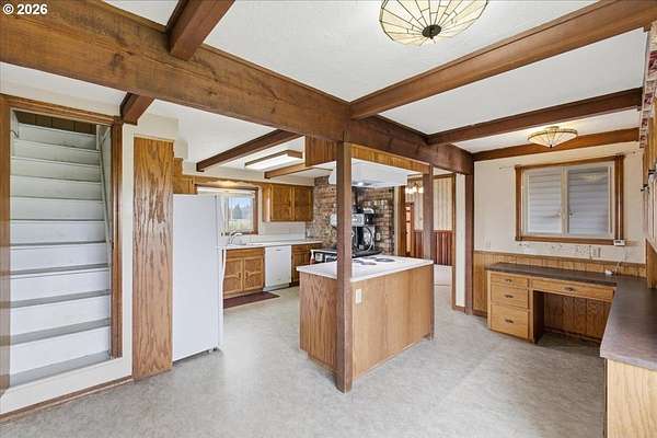 - Builtin Oven, Cooktop, Dishwasher, Free Standing Refrigerator, Island, Pantry