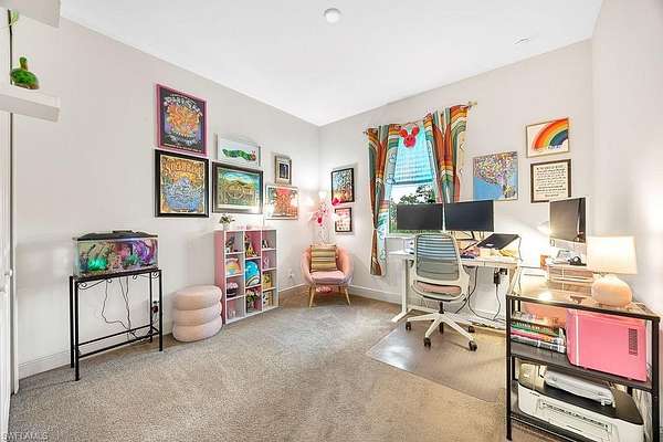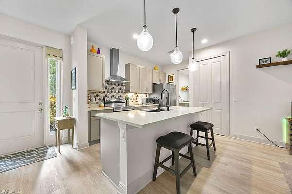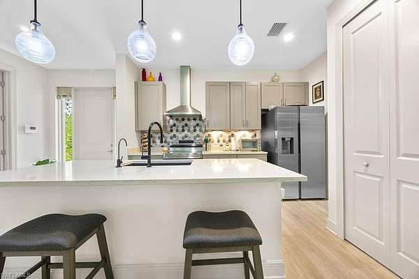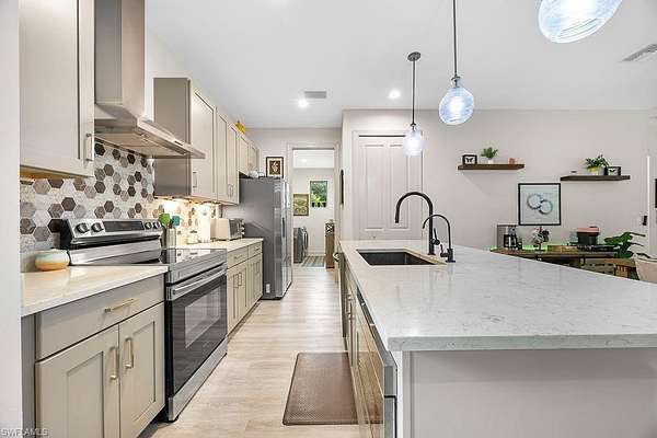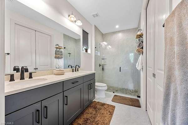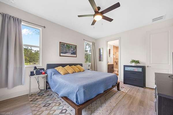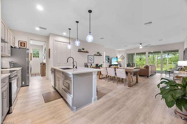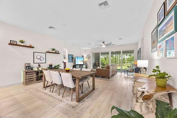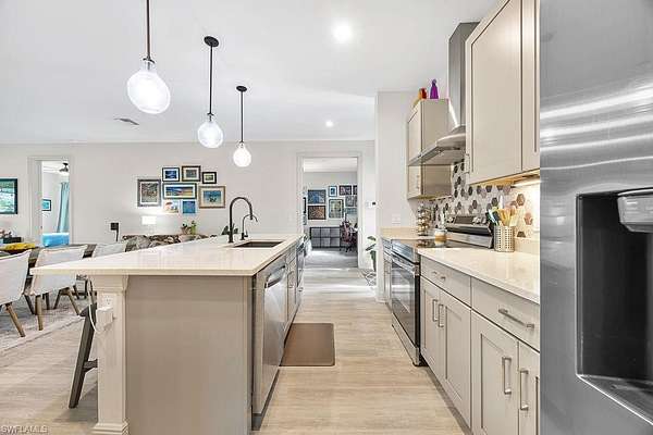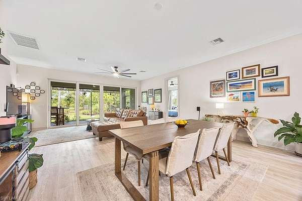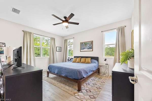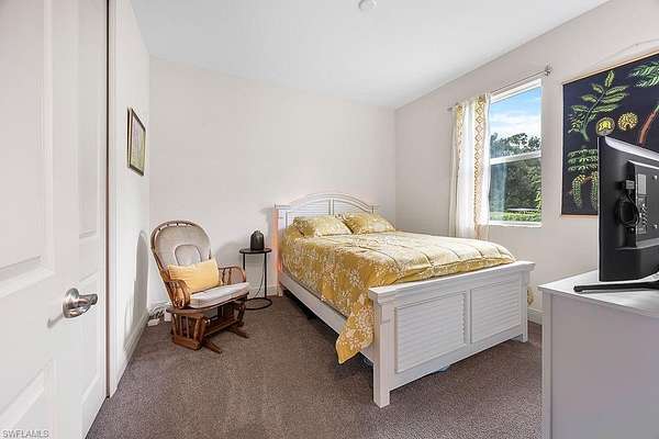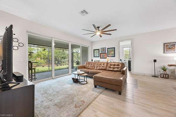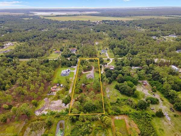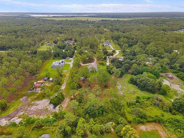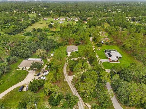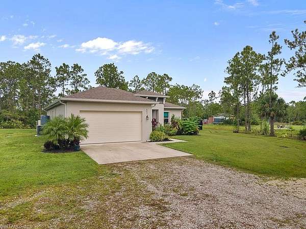 Built in 2023, this stunning 3-bedroom plus den home with a 2-car garage is tucked away on 2.27 acres (no wetlands) at the end of a quiet dead-end street in the desirable NE section of Golden Gate Estates in Naples, Florida, offering peace, privacy, and no traffic noise. Full of soothing color tones and warm wood accents, the home exudes a comfortable, cozy feeling while still offering modern elegance. Thoughtfully upgraded throughout, it features solid wood maple 41" cabinetry, quartz countertops, upgraded stainless steel Samsung appliances with drawer microwave and hood system, French doors to the den, frameless shower glass in the primary bathroom, an expanded primary closet, and smart design touches like a 40-amp outlet for EV charging, epoxy-coated garage floor, CAT5e wiring to every room, a whole-home surge protector, and a monthly serviced whole home reverse osmosis water system. Outdoor enhancements include gutters around the entire home, plumbing for a future outdoor kitchen, over 15 young fruit trees, a 320 sq ft storage container, and an expanded roundabout driveway. The property also carries a structural warranty through 2033. Ideally located just 15 minutes to Palmetto Ridge High School, Corkscrew Middle School, the new Publix shopping center with dining and retail, and Corkscrew Swamp Sanctuary where you can stroll through nature and wildlife, plus only 20 minutes to Seminole Casino, this home offers both modern comfort and the serenity of estate living.