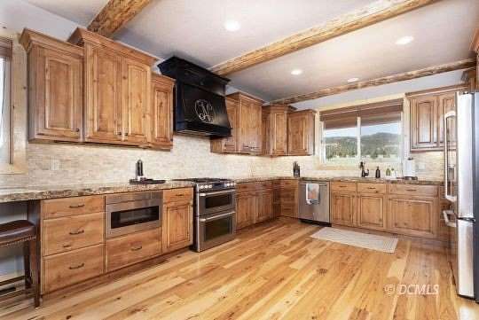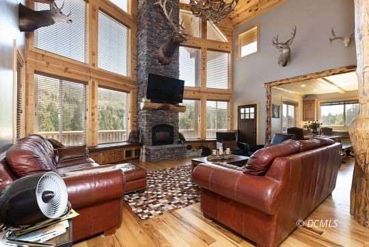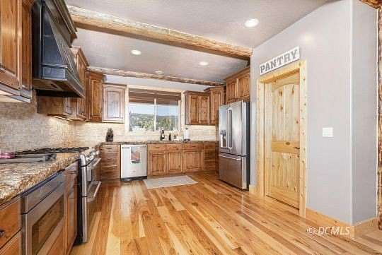 Welcome to a rare gem in Southern Utah-where natural beauty meets mountain elegance. This custom-built, three-level trophy cabin spans approximately 3,706 sq ft and sits on a sprawling 9.71-acre parcel with a private well (.5 Acre Ft). Designed with exceptional craftsmanship and attention to detail, the home offers an open, flowing layout and upscale finishes throughout.Soaring vaulted ceilings and a wall of windows flood the main-level living room with natural light, centered around a stunning rock-accented, wood-burning fireplace-perfect for cozy gatherings. The gourmet kitchen is a chef's dream, featuring stainless steel appliances, a gas double-oven range with hood, custom oak cabinetry, a walk-in pantry, 3" granite countertops, and a soft white stone backsplash. With 5 spacious bedrooms and 4 bathrooms, there's room for everyone. The main-level primary suite includes a luxurious en suite bathroom with dual sinks and a beautifully tiled walk-in shower. Unwind on the covered back deck and let the peaceful sounds of Mammoth Creek soothe you-nature's lullaby right outside your door. Meticulously maintained and built to last, this is mountain living at its absolute finest.