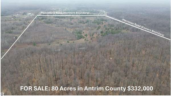 Exceptional Value. New price on this 80-acre corner parcel in the heart of Northern Michigan. Just a few miles east of Mancelona and the crossroads of US131 and M88. Township is unzoned, so consider residential, recreational and commercial opportunities. 445 yards frontage along Mancelona Road, and a depth of nearly twice that distance along Merrimac Road. Corner position allows additional access and privacy for residential or camping purposes. A mix of cleared spaces, pine and hardwoods. Quick drive to Bellaire, Torch Lake, Lakes of the North, Shanty Creek Resort. Easy distance to Traverse City and Petoskey. Antrim County is home to abundant four-season opportunities including boating, skiing, golf, snowmobiling and hunting.