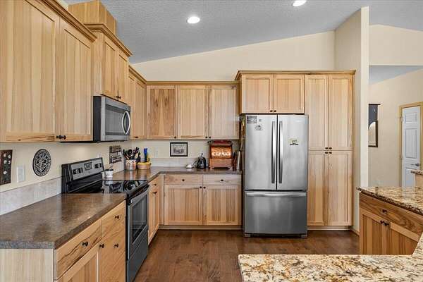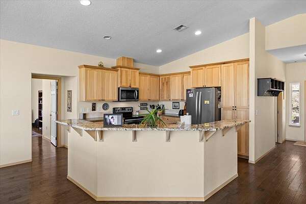 - Breakfast Bar, Ceiling Fan(s), Double Vanity, Granite Counters, High Speed Internet, Kitchen Island, Laminate Counters, Linen Closet, Open Floorplan, Pantry, Primary Downstairs, Shower/Tub Combo, Tile Shower, Vaulted Ceiling(s), Walk-In Closet(s)
