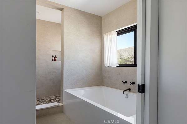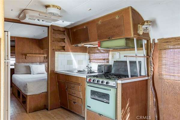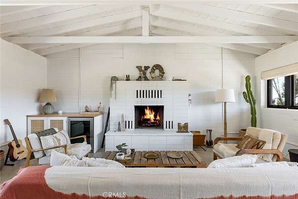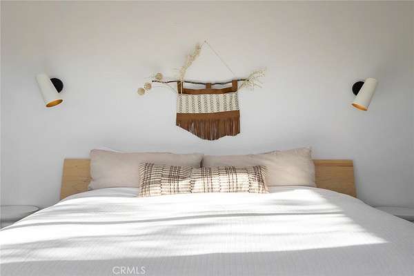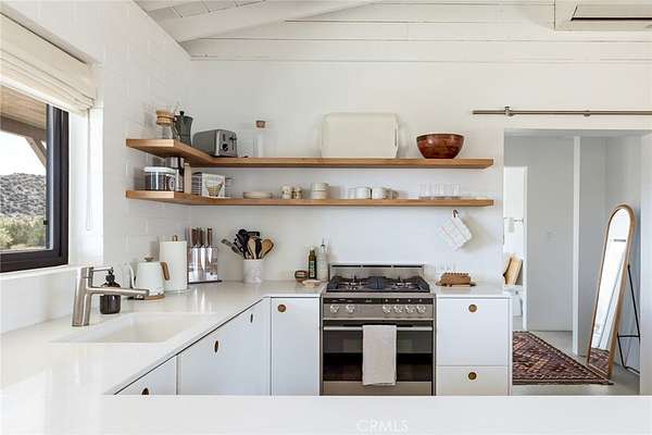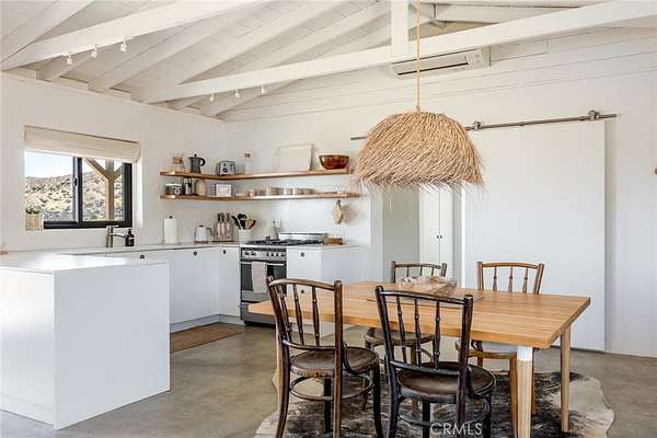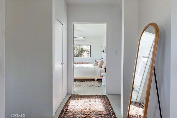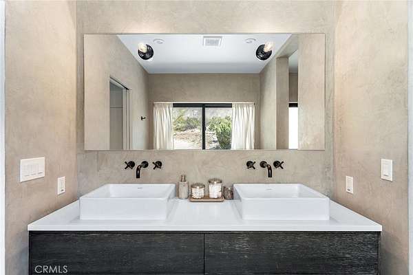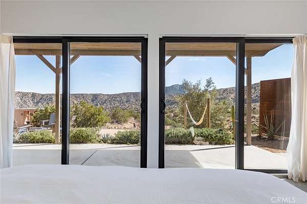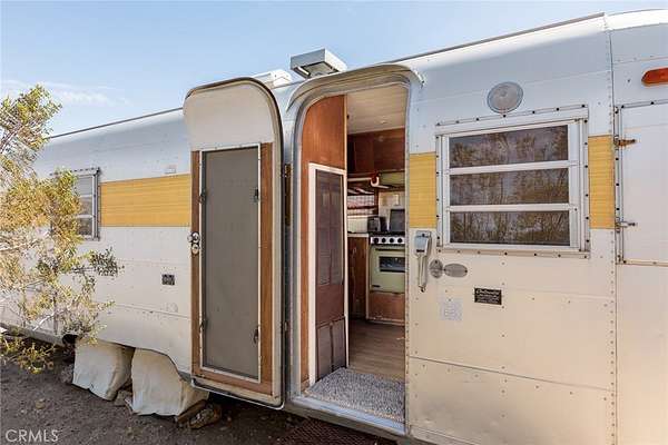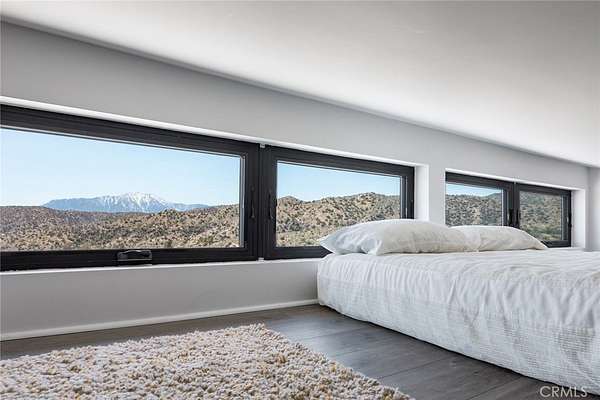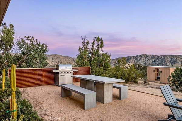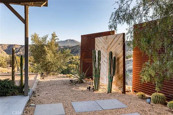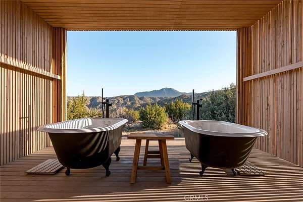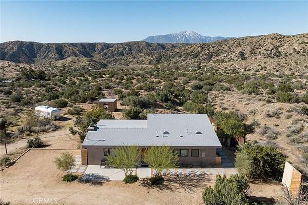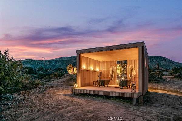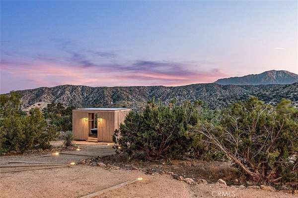 Dramatic mountain views envelop you from all directions in this artist-designed mid-century retreat spanning 5 serene acres under the majestic backdrop of Mt San Jacinto. The original 1959 brick cabin serves as an open concept living & dining area with soaring exposed beam ceilings, a cozy wood burning fireplace, built-ins, and a modern kitchen complete with quartz countertops, new copper plumbing, and a clever hidden under-counter fridge. A thoughtfully curated 2022 renovation introduces a chic new primary bedroom, oversized bathroom, bonus sleeping loft, and mini splits for climate control. The generously sized bedroom features a walk-in closet and built-in office nook, punctuated by a wall of glass sliders inviting you to take in the striking outdoor panorama. Down the hall you'll find a hidden stackable washer & dryer and a spa-like bathroom with venetian plaster, dual sinks, a soaking tub, a shower room, and a separate water closet. A ladder opens to a secret upstairs 300 sq ft sleeping loft with more impressive views, making a delightful guest bunk or a quirky clubhouse for the kids. A 384 sq ft covered outdoor patio spans the rear of the home, leading to an open-air lounge and dining area with a gas grill, propane fire pit, and built-in hammocks to unwind under the stars. Follow the professionally landscaped path down to the most instagrammable moment of them all - a bespoke wooden bathhouse where 2 vintage clawfoot tubs beckon you to enjoy a hot soak framed by yet another incredible view. An original 1968 Silver Streak trailer sits on the side of the property, serving as a fabulous potential guest space, clubhouse, or home office. Ideally situated less than 2 hours to LA, 15 minutes to Palm Springs, 20 minutes to Joshua Tree National Park, and surrounded by 154,000 acres of publicly accessible canyons, preserves, white waters, trails, and mountain peaks of the Sand to Snow National Monument, this property is the perfect home-base for everything from romantic getaways to family adventures. Sold turnkey so you can grab your suitcase and move right in, or take over the "guest favorite" airbnb account to start generating short term rental income right away. An adjacent buildable 5 acre parcel is available to purchase separately to create your own 10-acre multi-parcel dream compound.