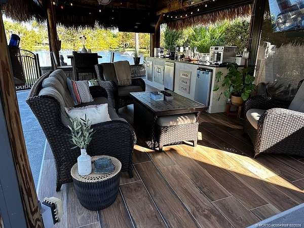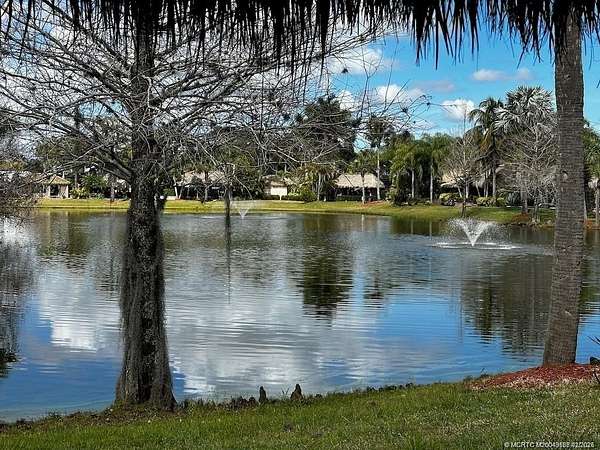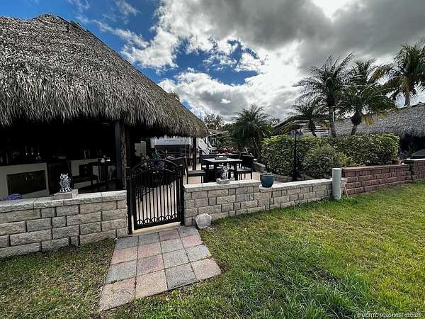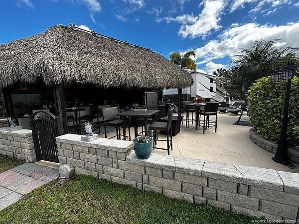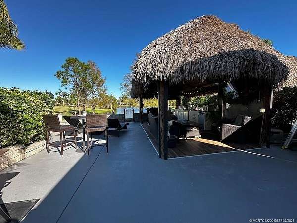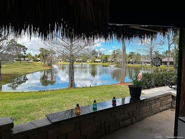 Welcome to this exceptional property, ideally situated in close proximity to the south satellite pool/spa, bathhouse, and laundry facilities for utmost convenience. Impeccably landscaped with lush mature plantings and elegant landscape walls, this lot exudes charm and sophistication, accentuated by a captivating decorative iron gate at the rear entrance. Enjoy panoramic views overlooking the picturesque 18th hole fairway and the tranquil expanse of the large lake adorned with two enchanting lighted fountains, creating a serene ambiance. Adding to the allure of outdoor living, the expansive tiki with motorized screens and granite kitchen with built in refrigerator and dishwasher provides ample space for relaxation and entertainment. This thoughtfully designed property comes fully furnished, offering a seamless transition into luxurious resort-style living. Experience the epitome of comfort and elegance in this meticulously maintained oasis.