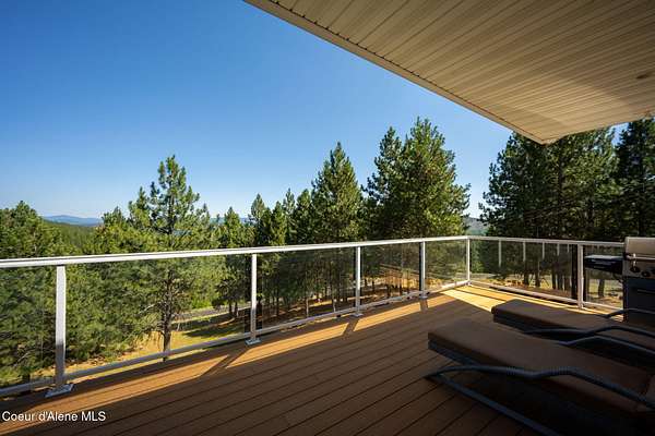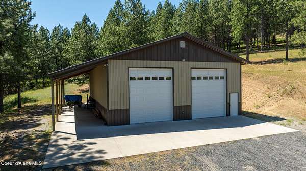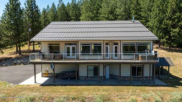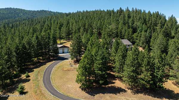 Nestled south of the Spokane River on 16.29 acres, this 2948 sq ft, 3-bed, 3.5-bath home (built 2003) is a serene oasis just 23 min from Coeur d'Alene's Sherman Ave, 13 min from Post Falls, and 40 min from Spokane Airport. Enjoy a grand double-door leaded glass entry, hardwood floors, 10' ceilings, and a gourmet kitchen with granite counters, cherry cabinets, and a large island. The primary suite stuns with a walk-in closet, jetted tub, and two-sided gas fireplace. Relax on the trex deck with million dollar views or in the 3-person spa. A 40x60 shop and 12x60 lean-to, spray foam insulation, and 220v power sits on a concrete slab. Updates include a 2019 metal roof, Hardie board siding, and asphalt driveway. With an elevator, zero-step entries, 4-car garage, 3-zone sprinklers, and a security system, this home is also wired for generator that offers luxury and accessibility. All appliances stay! Low taxes with timber exemption. Your dream retreat awaits!