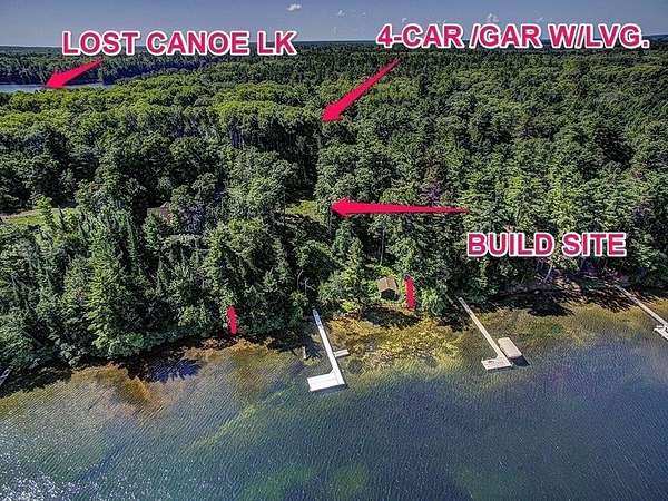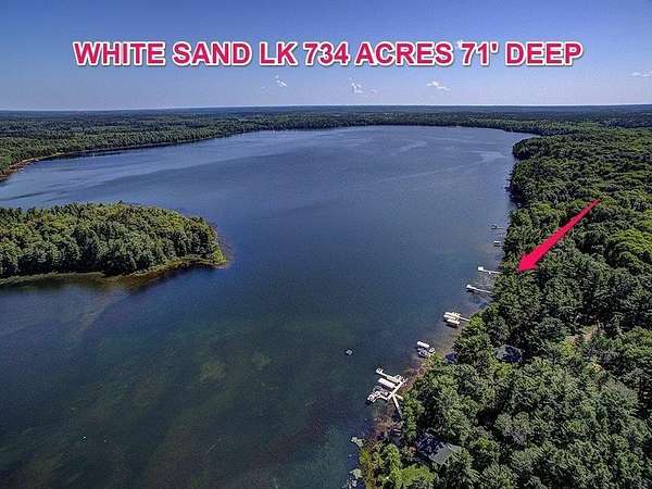One-of-a-kind opportunity! This is the only parcel available with an open lakeside building site on this rare body of water! 206' of sand frontage and 2 acres of improved land on 734 acre White Sand lake which is known for its clear deep waters, State owned shorelines, full rec and trophy fishing! Everything here is included for a total turnkey property to live in now and have the future home building location in place! On this land you will find a large 4 plus car gar. with beautiful living quarters above. Inside features vaulted ceilings, hickory T & G paneling, stone fireplace, open kit/din/living along with full bath and 2 bed rms with extra sleeping loft. Outside is a large deck, stone patio w/fire pit and improved drive to the lake overlook and the paver/grass walkway to the sandy lakeshore with dry boathouse, pier system with jet ski dock and a slide for the kiddies! This is a legacy property waiting for a legacy home on a lake that will support the investment!