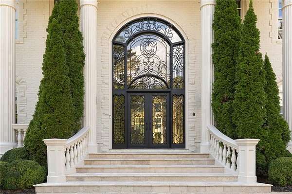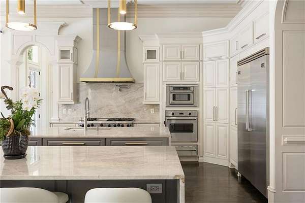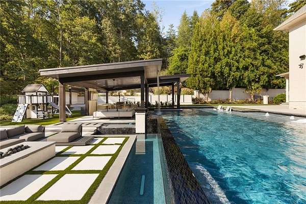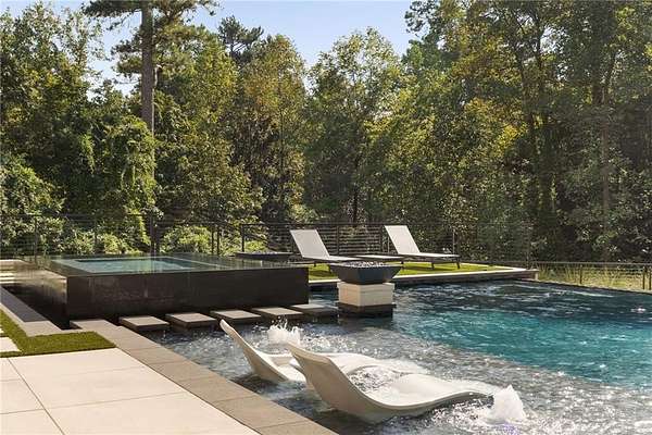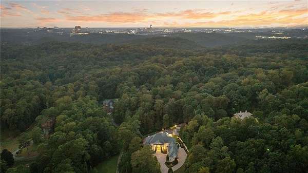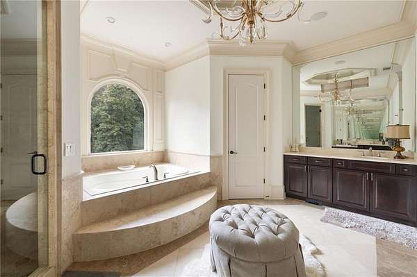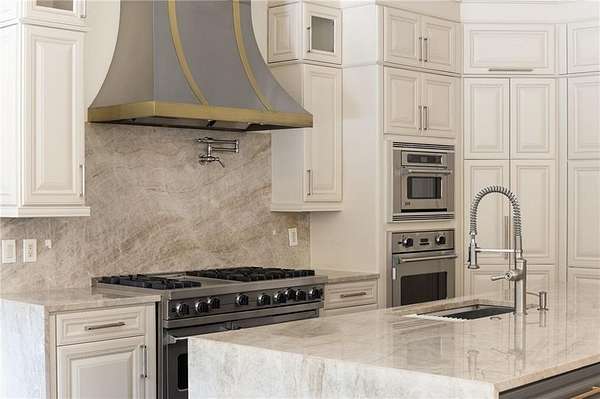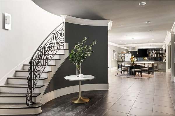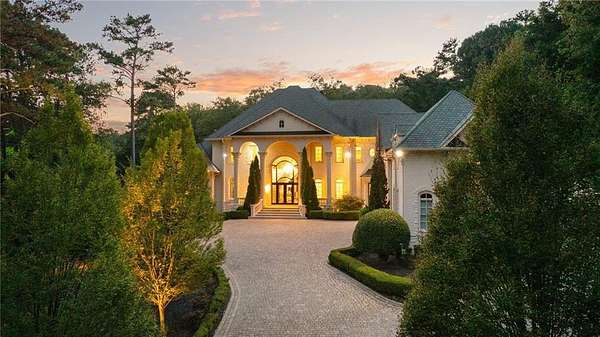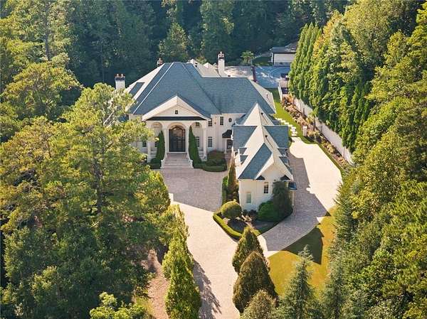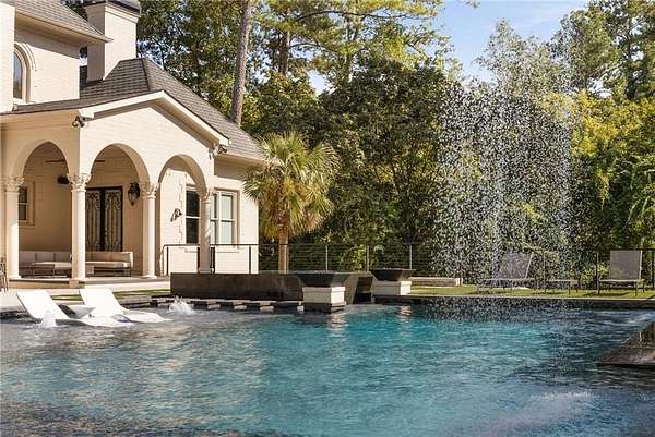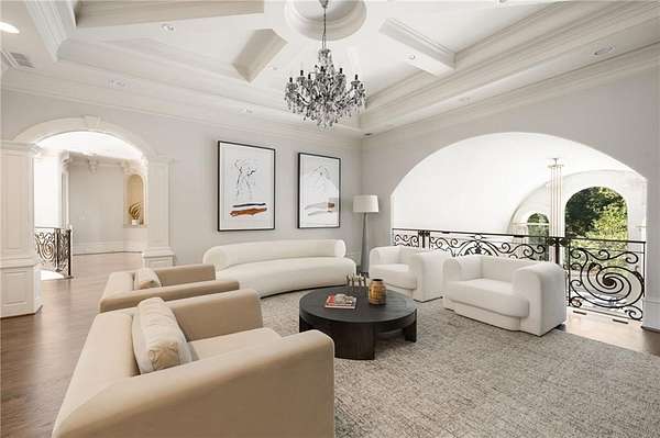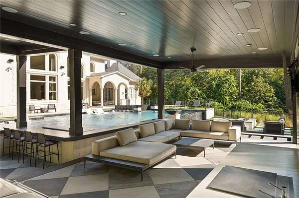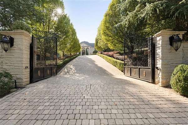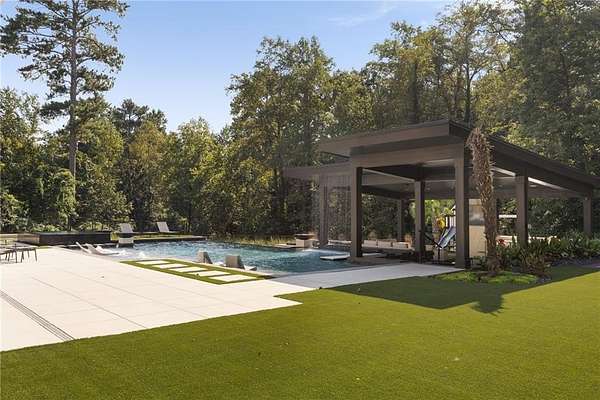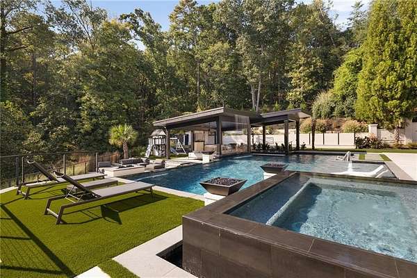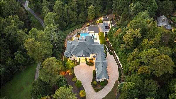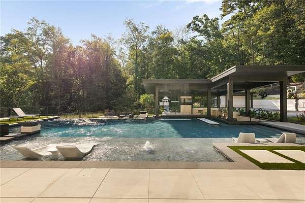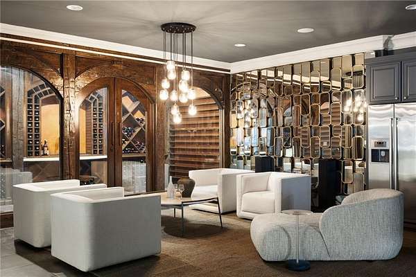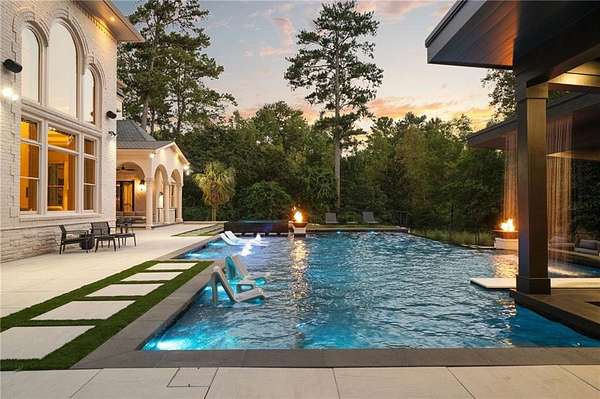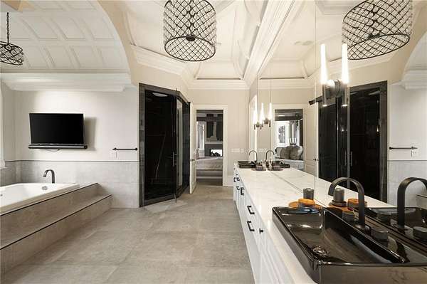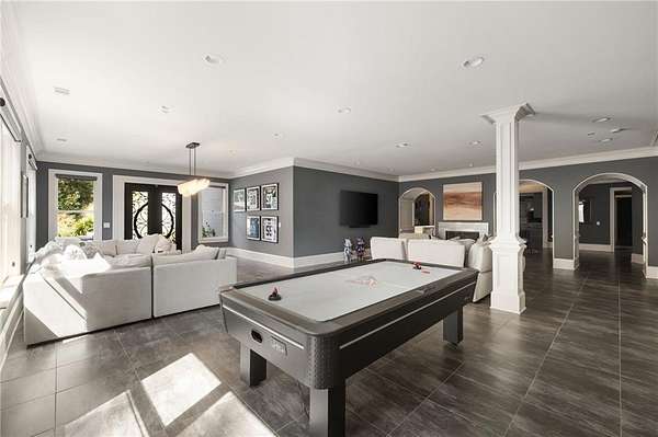 Set on 2.5+ wooded acres, this custom estate is designed for luxurious living and unforgettable entertaining, with soaring ceilings, intricate ironwork, natural stone accents, and dramatic statement features like a floor-to-ceiling backlit onyx fireplace. The open layout flows from the grand foyer and formal dining room into the living spaces and chef's kitchen, where dual islands topped with Taj Mahal quartz and premium stainless steel appliances set the stage for gatherings, complemented by an adjacent bar also finished in Taj Mahal quartz. The main-level primary suite offers a private retreat with a sitting room, double-sided fireplace, spa-style bath, and access to the covered patio overlooking the resort-inspired backyard with pool, spa, waterfalls, fire pits, and a fully equipped outdoor kitchen. Upstairs, a second primary suite, au pair suite with kitchenette and private entry, and additional en suites provide comfort for family and guests, while the terrace level brings entertainment to another level with its own backlit onyx bar, full second kitchen, climate-controlled wine room, home theater, private guest suite, and a recovery room complete with sauna, cold plunge, and hot tub. With turfed grounds, a basketball court, and a four-car garage, every detail of this estate combines elegance, comfort, and extraordinary amenities for both everyday living and large-scale entertaining.