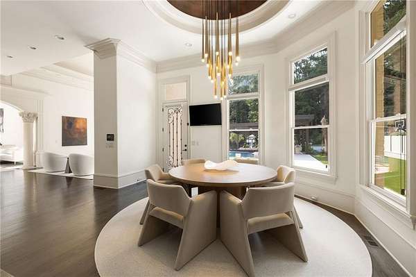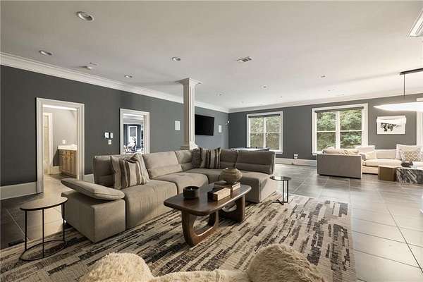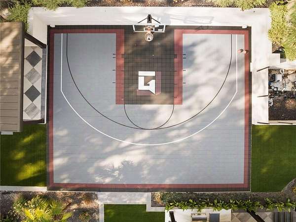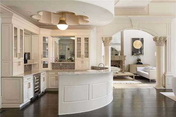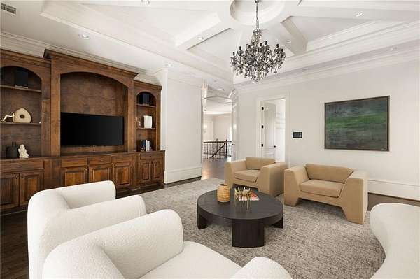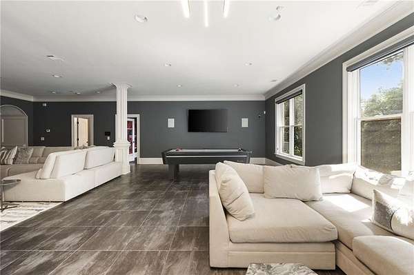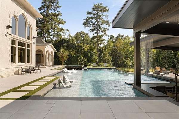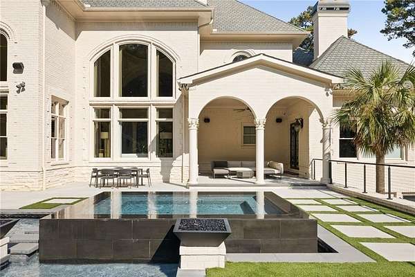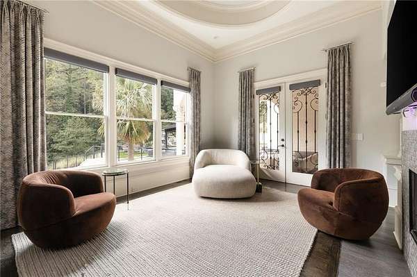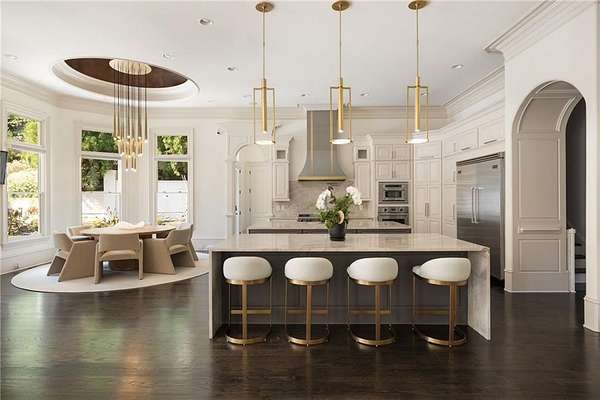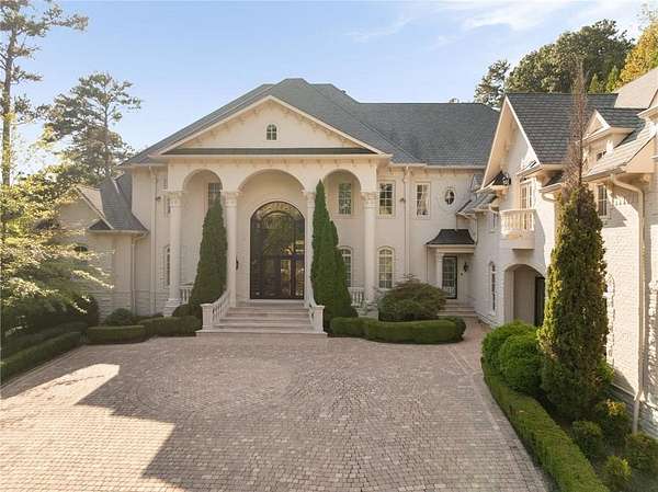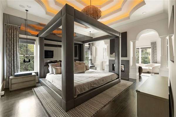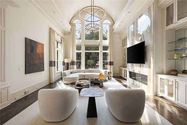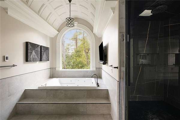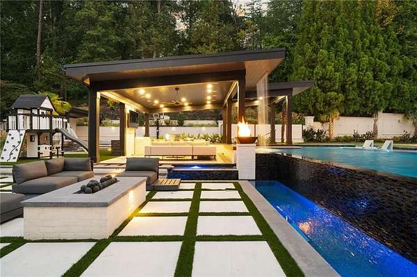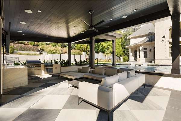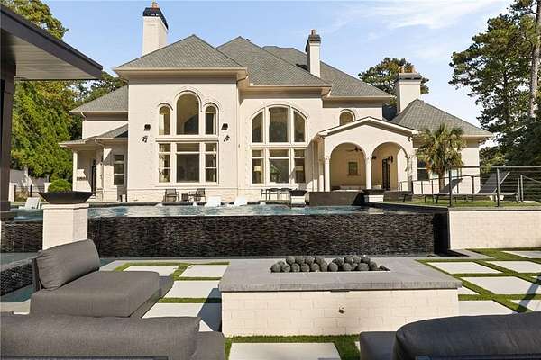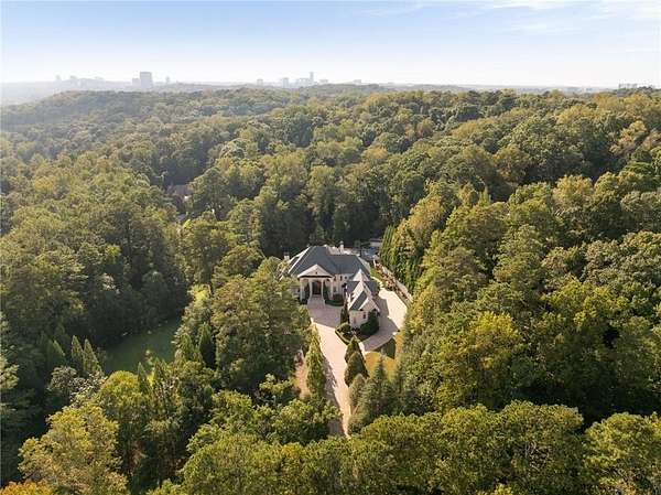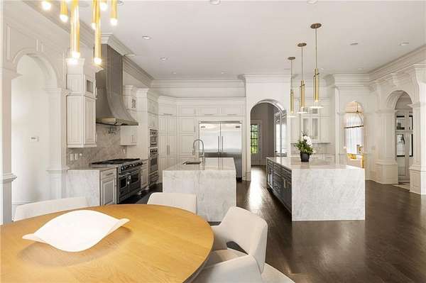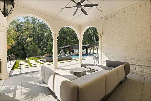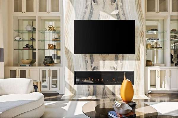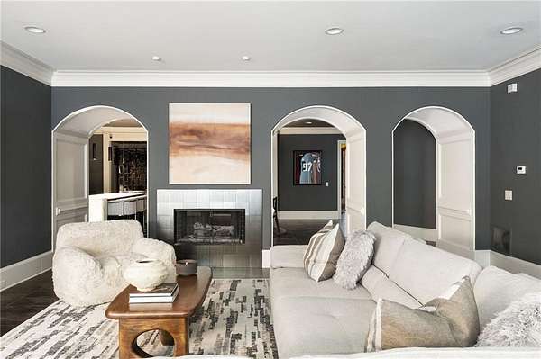 Set on 2.5+ wooded acres, this custom estate is designed for luxurious living and unforgettable entertaining, with soaring ceilings, intricate ironwork, natural stone accents, and dramatic statement features like a floor-to-ceiling backlit onyx fireplace. The open layout flows from the grand foyer and formal dining room into the living spaces and chef's kitchen, where dual islands topped with Taj Mahal quartz and premium stainless steel appliances set the stage for gatherings, complemented by an adjacent bar also finished in Taj Mahal quartz. The main-level primary suite offers a private retreat with a sitting room, double-sided fireplace, spa-style bath, and access to the covered patio overlooking the resort-inspired backyard with pool, spa, waterfalls, fire pits, and a fully equipped outdoor kitchen. Upstairs, a second primary suite, au pair suite with kitchenette and private entry, and additional en suites provide comfort for family and guests, while the terrace level brings entertainment to another level with its own backlit onyx bar, full second kitchen, climate-controlled wine room, home theater, private guest suite, and a recovery room complete with sauna, cold plunge, and hot tub. With turfed grounds, a basketball court, and a four-car garage, every detail of this estate combines elegance, comfort, and extraordinary amenities for both everyday living and large-scale entertaining.