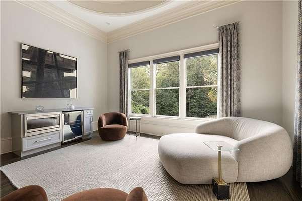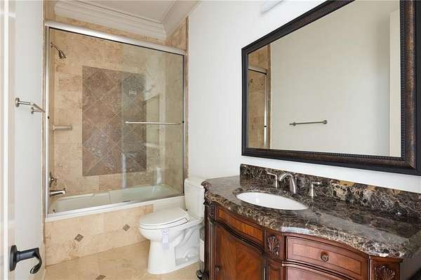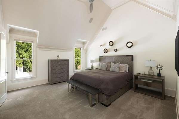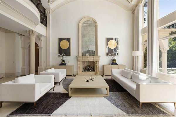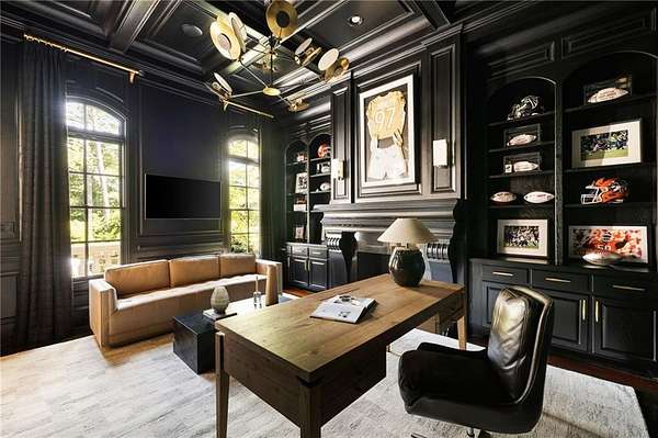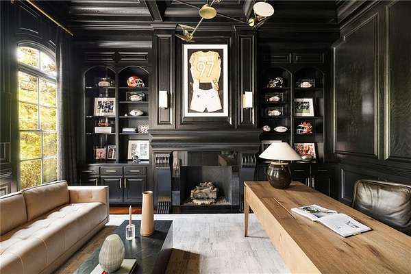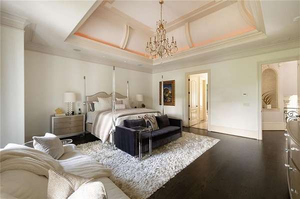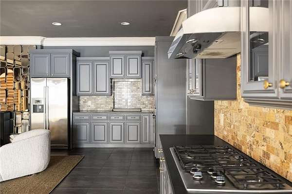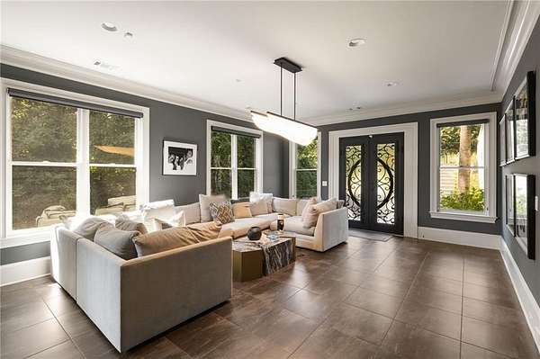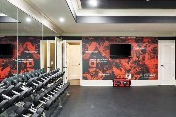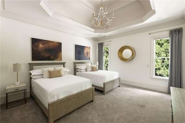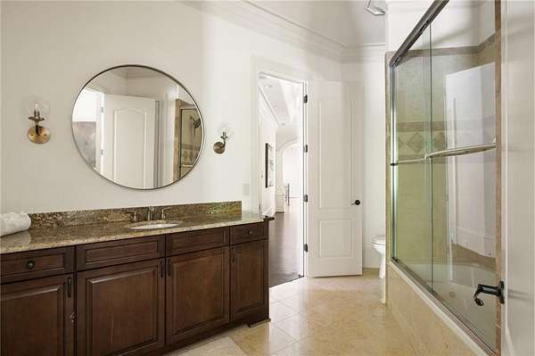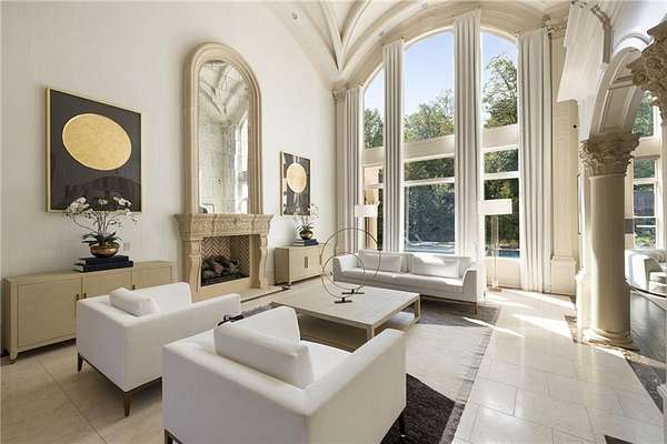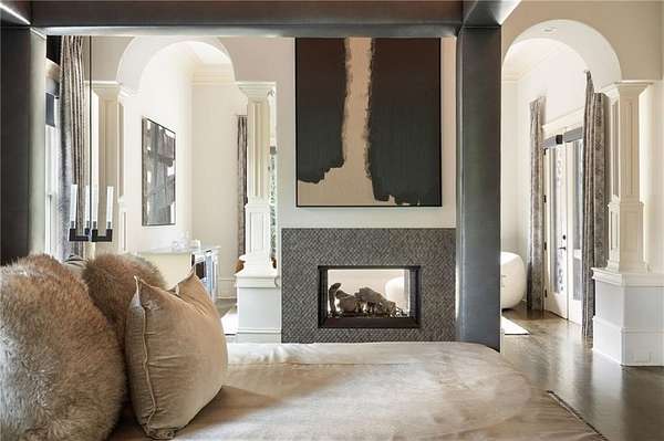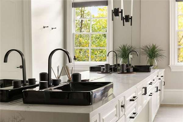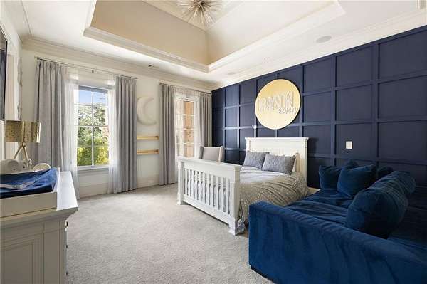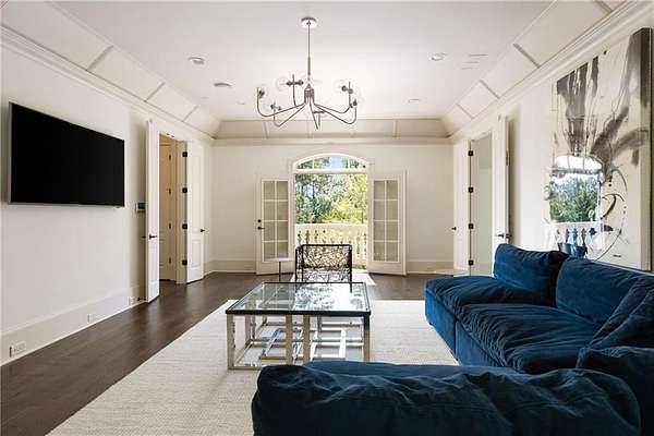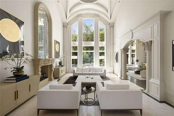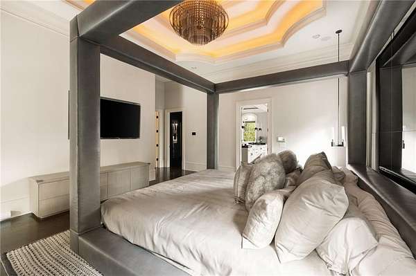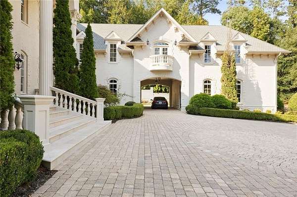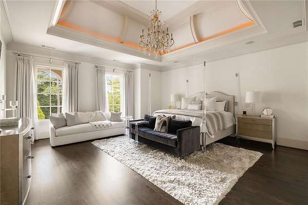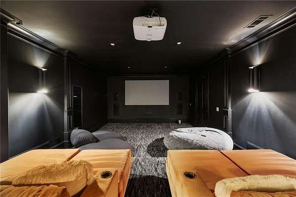 Set on 2.5+ wooded acres, this custom estate is designed for luxurious living and unforgettable entertaining, with soaring ceilings, intricate ironwork, natural stone accents, and dramatic statement features like a floor-to-ceiling backlit onyx fireplace. The open layout flows from the grand foyer and formal dining room into the living spaces and chef's kitchen, where dual islands topped with Taj Mahal quartz and premium stainless steel appliances set the stage for gatherings, complemented by an adjacent bar also finished in Taj Mahal quartz. The main-level primary suite offers a private retreat with a sitting room, double-sided fireplace, spa-style bath, and access to the covered patio overlooking the resort-inspired backyard with pool, spa, waterfalls, fire pits, and a fully equipped outdoor kitchen. Upstairs, a second primary suite, au pair suite with kitchenette and private entry, and additional en suites provide comfort for family and guests, while the terrace level brings entertainment to another level with its own backlit onyx bar, full second kitchen, climate-controlled wine room, home theater, private guest suite, and a recovery room complete with sauna, cold plunge, and hot tub. With turfed grounds, a basketball court, and a four-car garage, every detail of this estate combines elegance, comfort, and extraordinary amenities for both everyday living and large-scale entertaining.