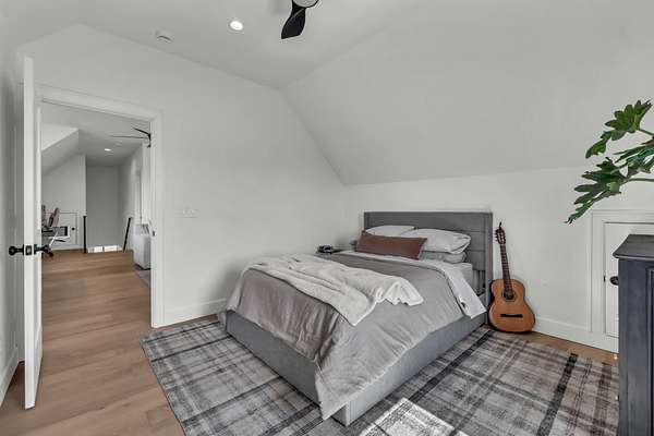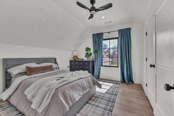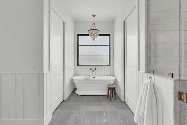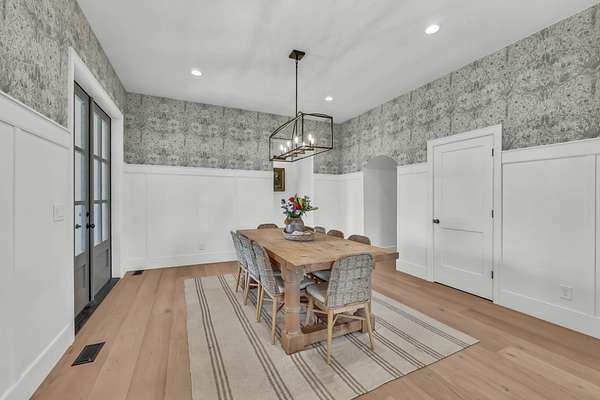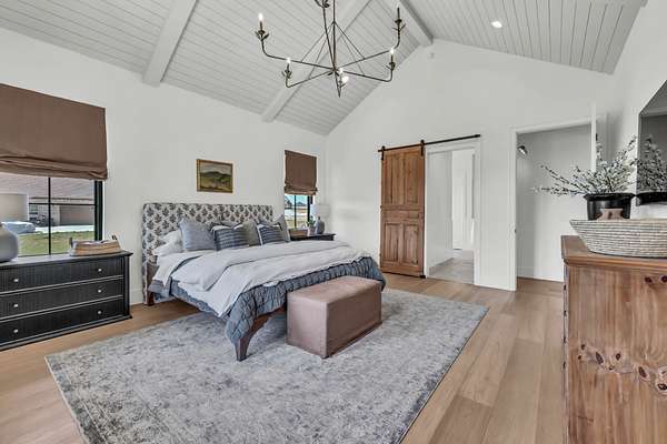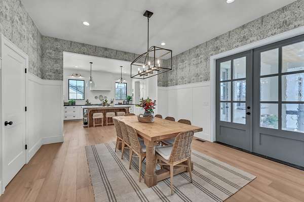 Entertain effortlessly in the formal dining room highlighted by French doors that open to a covered porch, blending indoor and outdoor living. The main-level primary suite is a private retreat with its own French doors to the porch, vaulted ceilings, dual oversized walk-in closets, and a spa-like en suite bath featuring a soaking tub, tile shower, and double vanities.