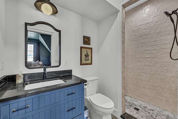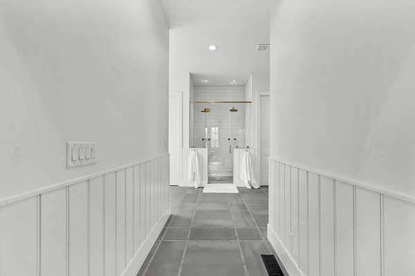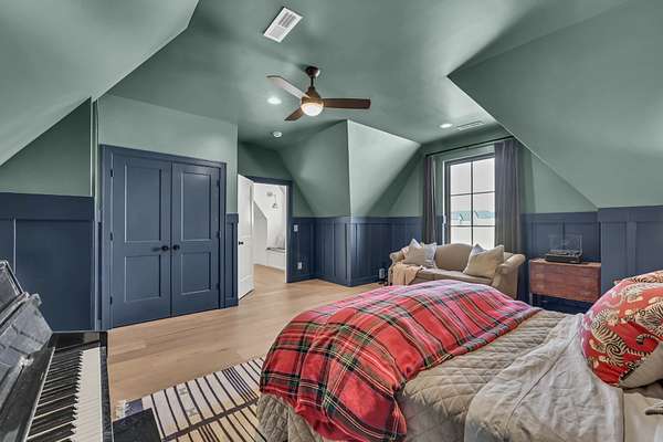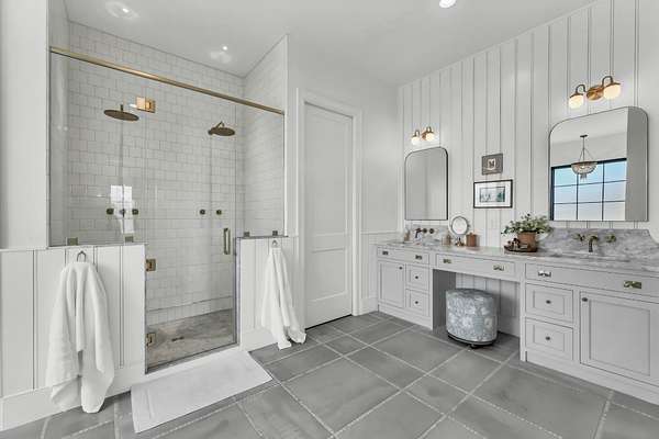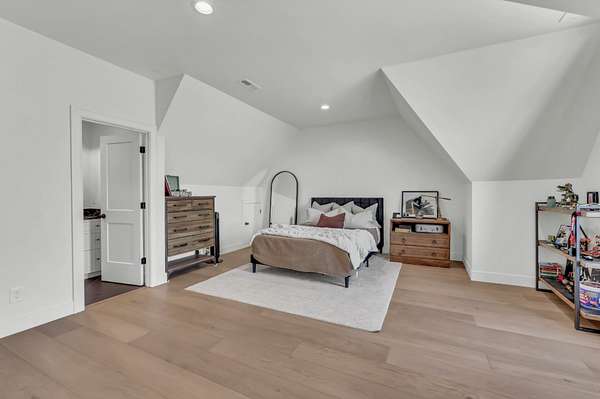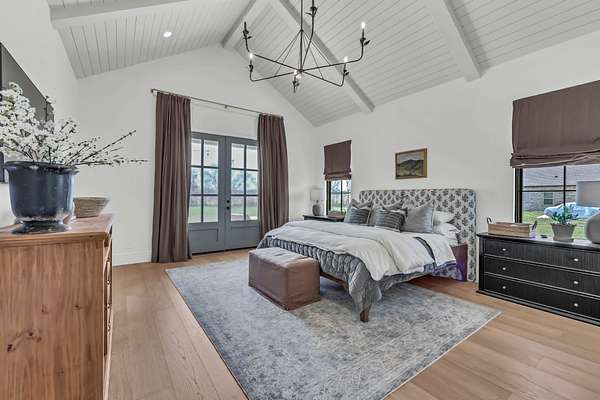 Entertain effortlessly in the formal dining room highlighted by French doors that open to a covered porch, blending indoor and outdoor living. The main-level primary suite is a private retreat with its own French doors to the porch, vaulted ceilings, dual oversized walk-in closets, and a spa-like en suite bath featuring a soaking tub, tile shower, and double vanities.