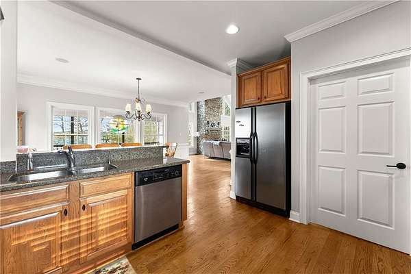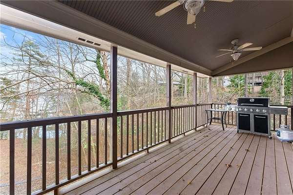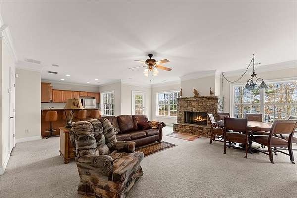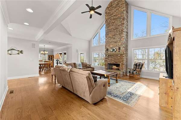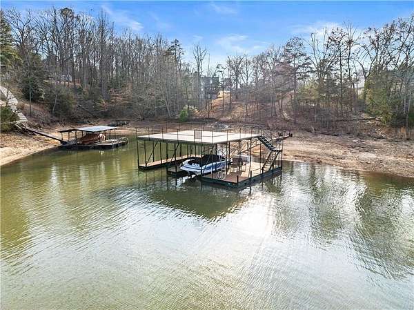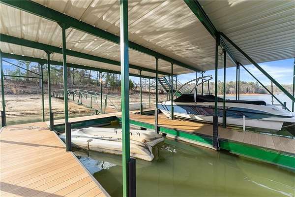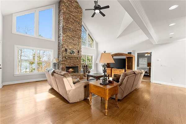 Welcome to your private three-level lake house retreat, perfectly positioned behind a gated entrance and surrounded by peaceful natural scenery. A long, driveway leads you to this beautifully designed home, offering both privacy and stunning curb appeal. This spacious residence features three levels of living, including a full basement, providing plenty of room for relaxation, entertaining, and everyday comfort. The main level welcomes you with an open layout, abundant natural light, warm hardwood floors, and a seamless flow between living spaces. The main level has an oversized master bedroom and bathroom with a walk in closet. The main level includes two separate covered porches with beautiful lake views! The kitchen is thoughtfully designed with rich wood cabinetry, generous counter space, and a functional breakfast bar that opens to the dining area-ideal for gatherings and lakeside entertaining. Large windows throughout the home frame serene views that bring the outdoors in. On the main level you will also find a spacious laundry room. Upstairs, you'll find two secondary bedrooms and two full bathrooms, while the basement level offers entertaining areas with a second kitchen area, bar and living room with stone fireplace, Second Master Bedroom and Bathroom, Second Laundry Room with Laundry room sink and additional storage. Take a walk out of the basement and step outside and enjoy the peaceful lake house lifestyle with room to relax, entertain, and take in the surrounding beauty. You will find a two story dock with two boat slips. Whether you're looking for a full-time residence or a weekend getaway, this three-level lake home with a basement combines privacy, space, and charm in a truly tranquil setting.