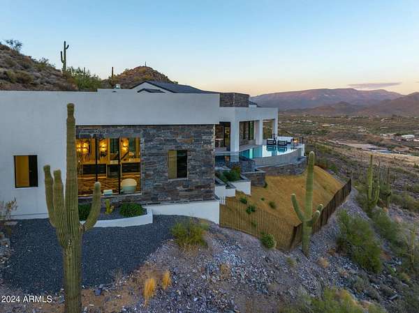 Desert Contemporary Masterpiece in Seven Sisters Estates Nestled in the gated enclave of Seven Sisters Estates, this new construction is perched high in the Cave Creek hills, offering an unparalleled private sanctuary. Surrounded by lush Sonoran Desert and commanding views of the Valley, sunsets, and sparkling city lights, this 5-bedroom, 7-car garage estate redefines desert luxury living, with the main living spaces thoughtfully designed on one level. SEE MLS DIRECTIONS Step into a world of elegance with a soaring great room, a chef's kitchen, and a dining area that opens seamlessly to a 270-degree view resort patio, perfect for entertaining or soaking in the breathtaking surroundings. The primary suite is a private retreat featuring a spa-inspired bath, a gym with steam room, and captivating views. Additional spaces include a dedicated office, an entertainer's bar, a hidden catering kitchen, and a guest wing with three en suite bedrooms. The lower level offers even more for the ultimate lifestyle, with a sports-style bar, a wine room, billiards area, and a game room. The fifth bedroom is versatile and can transform into a home theater. The 7-car garage, equipped to accommodate lifts, and a sleek elevator add to the home's thoughtful design. A serene interior courtyard is perfect for pets, morning meditation, or intimate evenings by the fire. The exterior's striking stone and stucco blend harmoniously with the home's streamlined modern lines, while walls of glass bring the desert's beauty indoors. The interior palette, curated by renowned Renee Christina Interior Design, features neutral tones, oak flooring, exquisite stone accents, designer lighting, luxury WOLF/SUBZERO appliances, and bespoke cabinetry. This exclusive property is the first of five custom homes by Diamond West in the coveted Seven Sisters Estates. Each home is situated on a 4+ acre site amidst pristine desert flora, stunning rock outcroppings, and iconic landmarks such as Elephant Butte, the Seven Sisters, and views extending to Camelback Mountain and the McDowell range.
