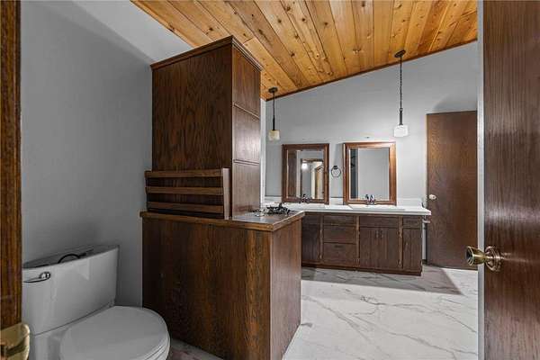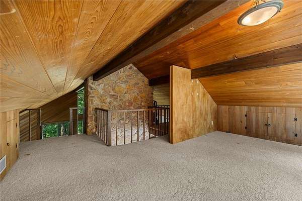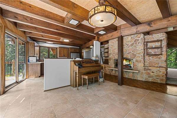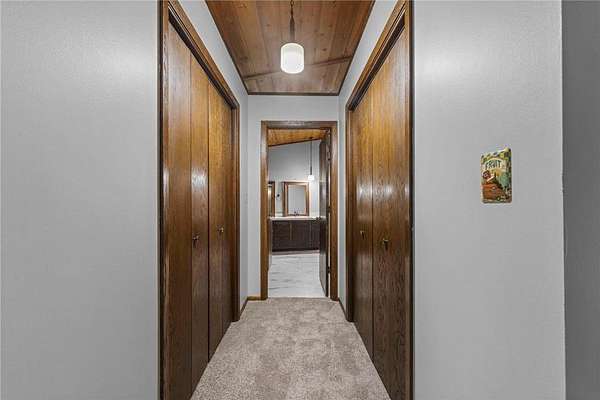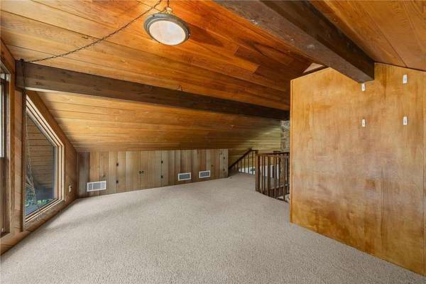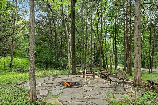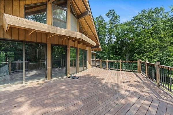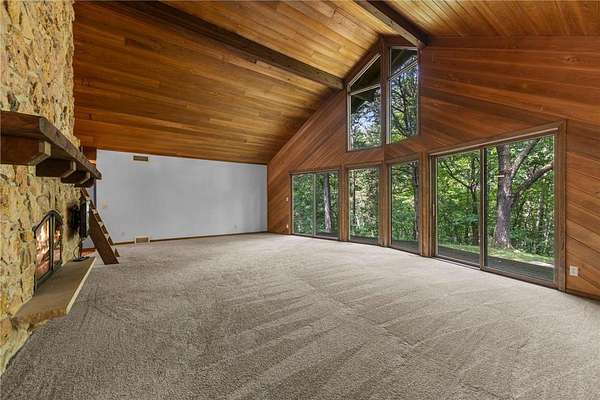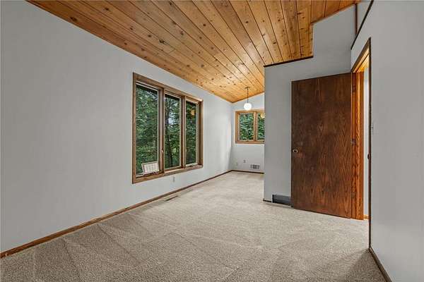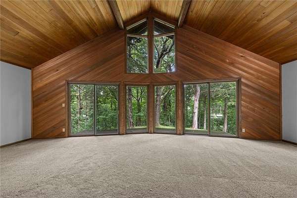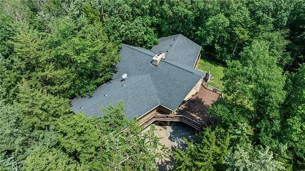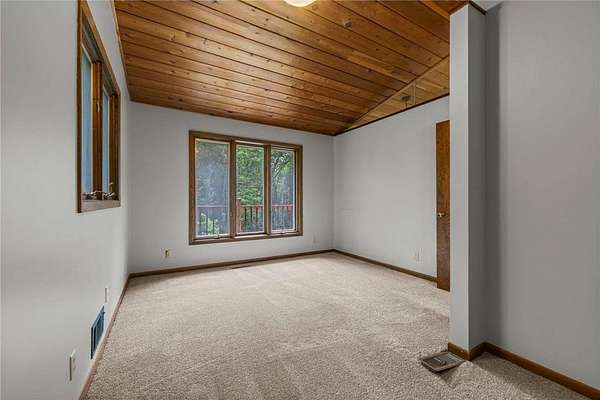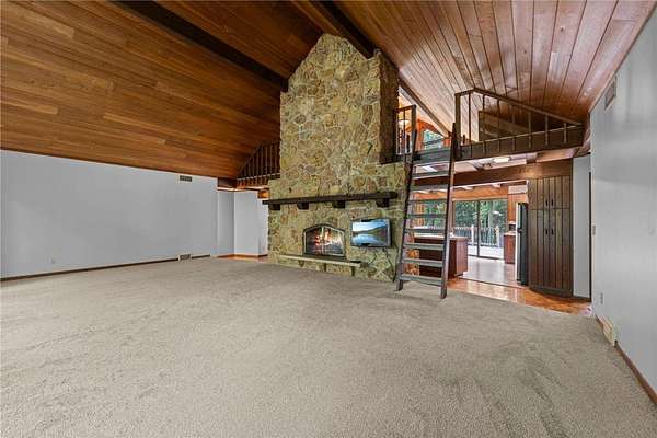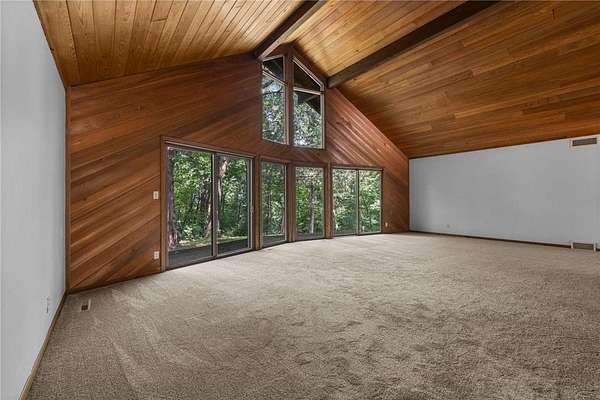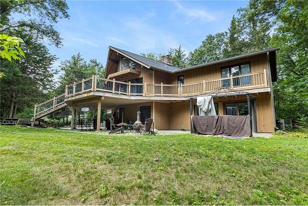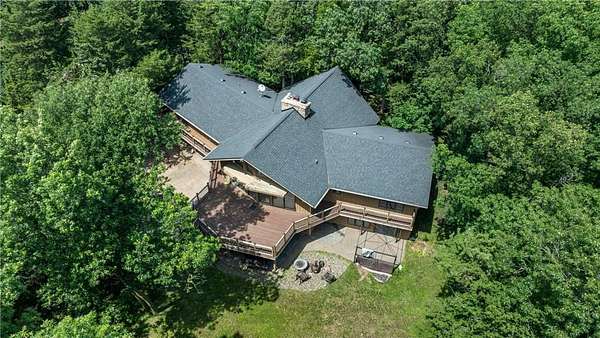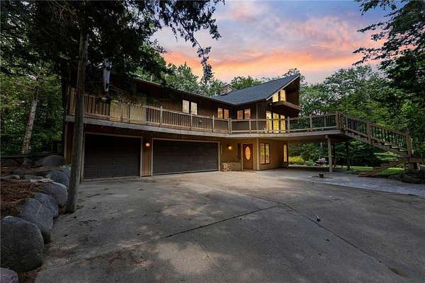 Nestled on over 2.5 wooded acres, this gorgeous high-quality custom-built chalet-style home offers the perfect blend of comfort, privacy, and craftsmanship. The heart of the home is a soaring two-story great room with cedar-lined ceilings and a stunning two-sided stone fireplace--warm and welcoming with expansive windows that bring the outdoors in. The open kitchen and dining area flow seamlessly into the main living space and out to a spacious wraparound deck--perfect for relaxing, grilling, or entertaining among the trees. A newer shared concrete driveway offers a smooth arrival and plenty of parking, complementing the abundant garage space for vehicles, tools, and toys. Three bedrooms are conveniently located on the main level, including a generous primary suite with a private bath. You'll also find main-floor laundry and a bonus loft, ideal for a home office, reading nook, or extra sleeping space. Recent mechanical updates include a new furnace and A/C, offering year-round comfort and peace of mind. NEW septic system being installed soon. The walkout lower level expands your living space with a large family room, additional bedroom and bath, and ample utility and storage space. Just outside, a brand-new patio creates another great spot to gather, leading to a firepit area tucked into the woods. Enjoy the quiet and privacy of life in the woods, with easy access to Hwy 169 and I-35W just minutes away. A truly special property with space to unwind, gather, and enjoy every season.