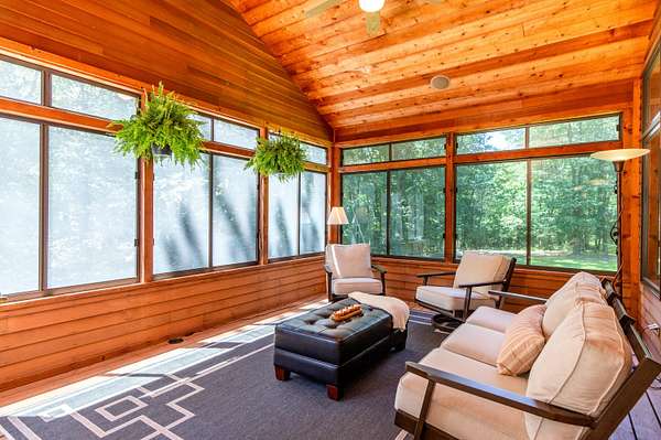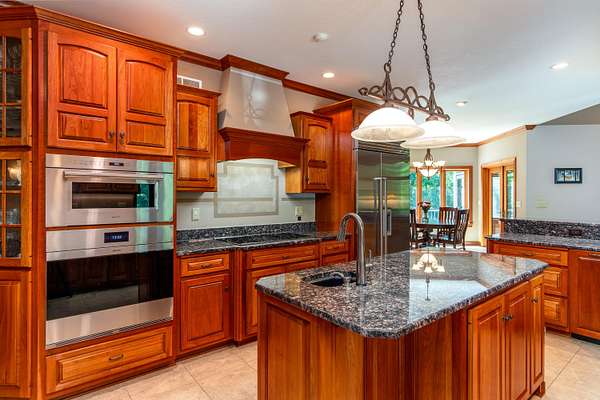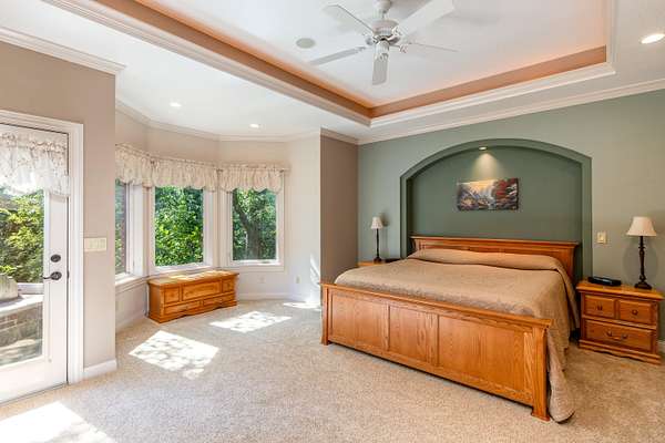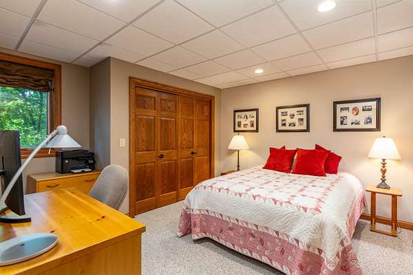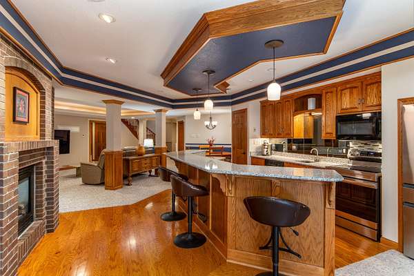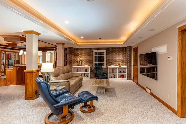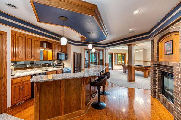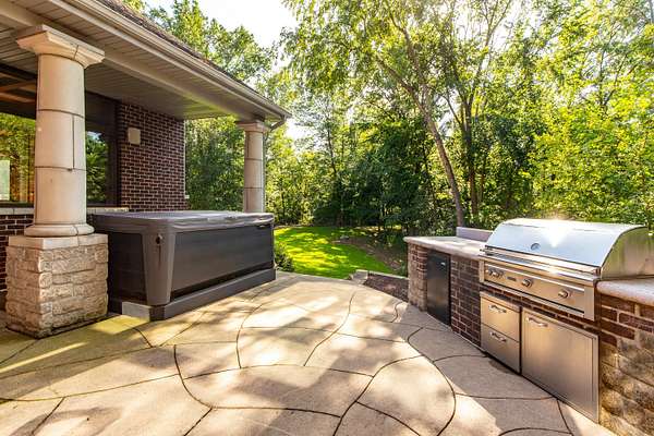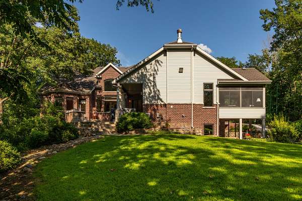 Nestled atop a hill on a 4 acre of private, wooded lot in Copper Cove, 4882 Copperstone Drive offers over 6,000 square feet of meticulously crafted living space. This stately red brick home blends timeless elegance with modern luxury, showcasing custom cherry woodwork, soaring ceilings, and a number of upgrades throughout. The chef's kitchen is a showpiece-equipped with brand new Wolf appliances, a Sub-Zero refrigerator, granite countertops, dual sinks, a walk in pantry, and an expansive island for entertaining. The open-concept living area is adorned with rich coffered ceilings, large windows framing lush views, and a stone fireplace that anchors the room in warmth and sophistication. Retreat to the main-level primary suite with tray ceilings, private patio access, dual walk-in closets, and a spa-like bath featuring dual vanities and a soaking tub. Upstairs, are two generously sized bedrooms connected via a Jack and Jill bathroom, as well as a home office and an open balcony that adds to the home's stylish architecture. The finished lower level delivers the ultimate in recreation and comfort, complete with a fully outfitted kitchenette (oven, range, microwave, full-size fridge), dedicated exercise room, and walk-out access to the serene backyard. Outdoors, enjoy an entertainer's dream space with an outdoor kitchen featuring a built-in Lynx grill and mini fridge-all set against a private, wooded backdrop. Additional features include three furnaces (including one for the heated garage), two AC units, refreshed landscaping, and quality finishes at every turn. This is a rare opportunity to own one of Ames' most distinguished homes-designed for those who appreciate privacy, quality, and luxury in every detail.