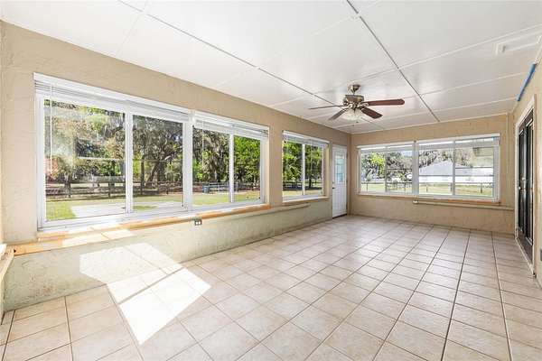 Beautiful mini farm on 3+ acres in Anthony! PEACEFUL & PRIVATE with pretty views from every window! This 3/2/2 concrete block home has almost 2000 ft living space plus an enclosed Florida room. The A-1 zoned property is fully fenced and gated with 3 paddocks, so bring your horses! The home features a large living room with vaulted ceilings and decorative fireplace. All the rooms are spacious with ceramic tile throughout (no carpet)! The kitchen has plenty of counters/cabinets, SS appliances, breakfast bar, pantry, and is open to the dining room. SPLIT PLAN. The primary suite has a walk-in closet and dual sinks in the ensuite bathroom. Both of the guest bedrooms have walk-in closets and the guest bath has dual sinks. The laundry room includes washer/dryer and extra storage. The enclosed Florida room overlooks the pretty property. The back patio is huge and is a great place to entertain family and friends. Easy drive to Ocala, Gainesville, and the World Equestrian Center!