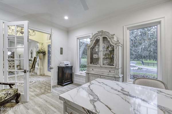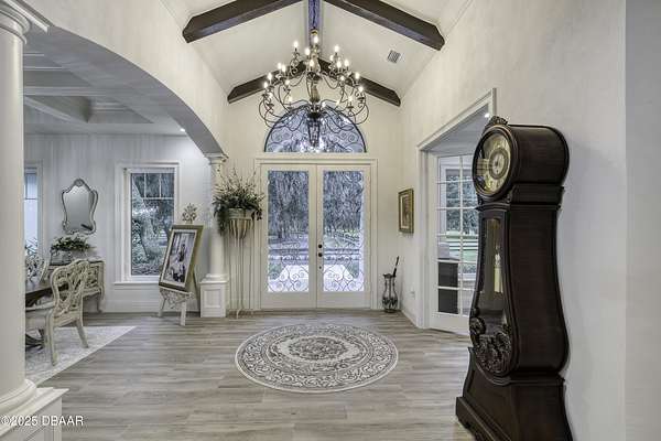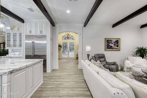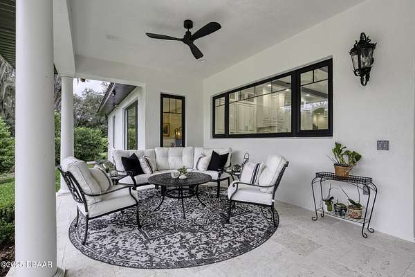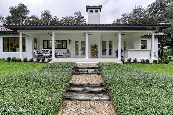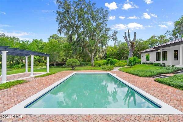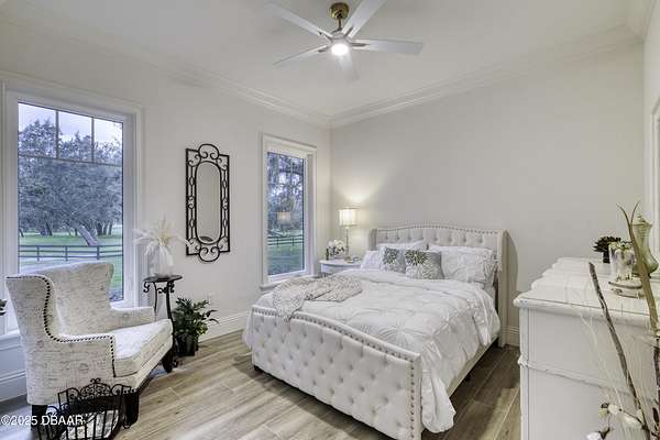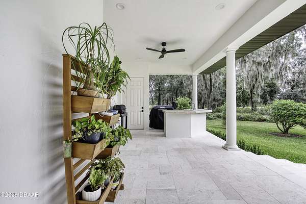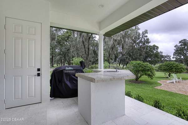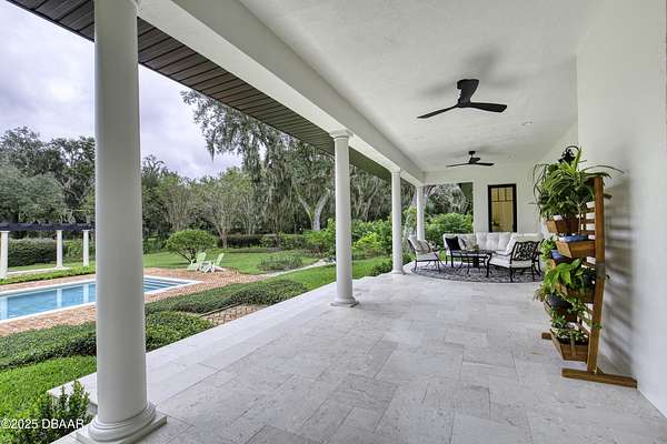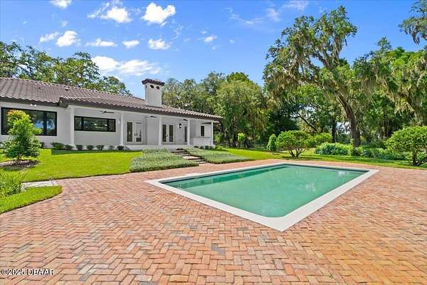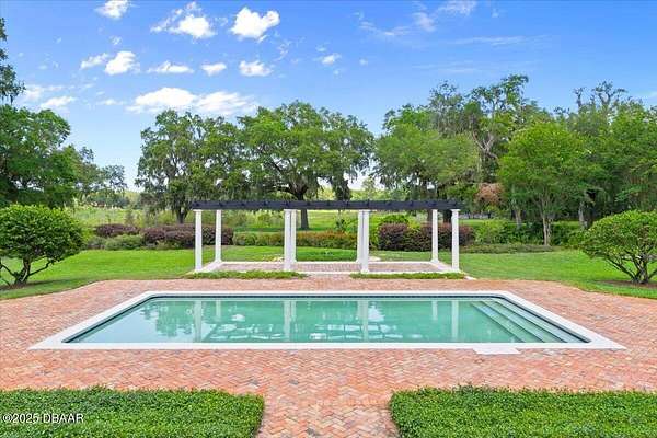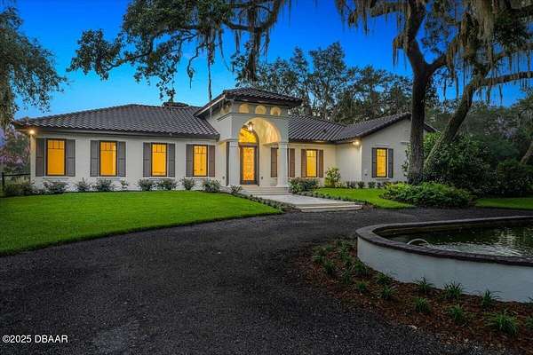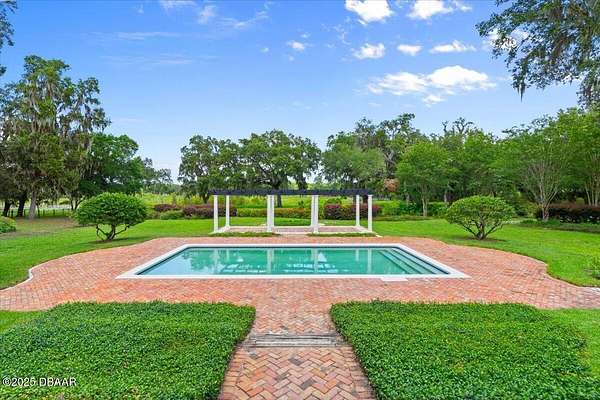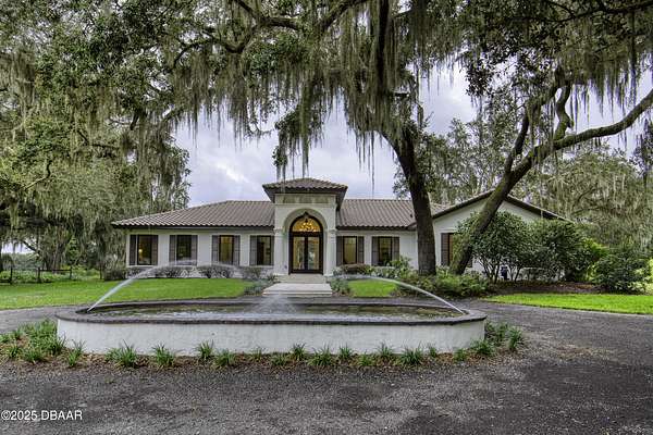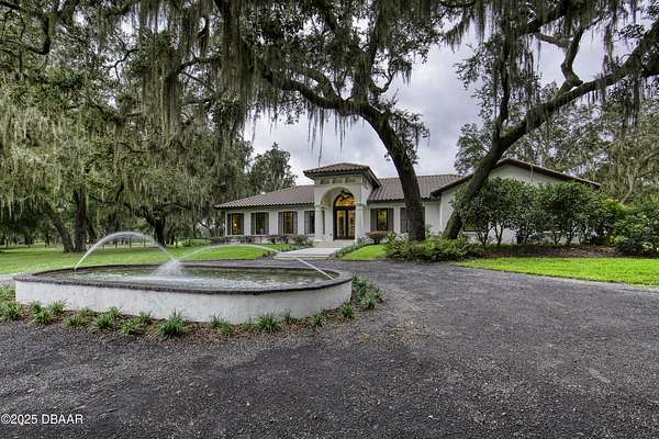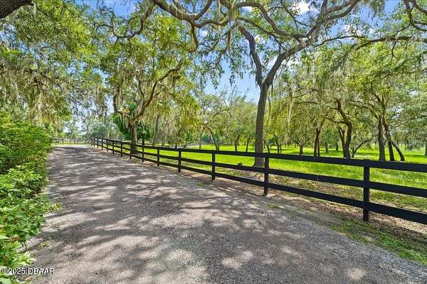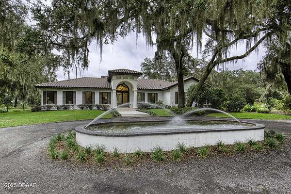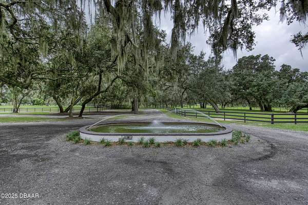 Every so often, a property comes along that is so spectacular and awe-inspiring, words simply can't do it justice. The beauty of this 11.37-acre estate, with its rolling grassy knolls peppered with centuries-old Live Oak trees, gardens of Bottle Brush and Holly trees, and fragrant hedges of night-blooming Jasmine, is a rare find. This is one of those extraordinary places. The home, with 3,310 square feet of conditioned living space, was completely rebuilt from the ground up. The renovation involved stripping the house down to its foundation and solid block walls, then meticulously crafting it with the highest quality materials and construction methods. Every detail, from the architecture to the finishes, exudes elegance and sophistication. Set against this breathtaking landscape, the property features a private in-ground pool, a charming stand-alone pergola, a five-stall barn, four grazing paddocks, and a tranquil pond in the distance-each element contributing to the home's rare appeal. The property is fully gated, with security cameras surrounding the exterior, and is pre-wired for a whole-home generator, offering peace of mind and privacy in a setting of unparalleled tranquility. A long, winding driveway leads to a circular motor court, crowned by an elegant oval fountain. From there, you ascend a set of travertine steps to the double glass and wrought-iron French entry doors, topped by an eyebrow window, and step into a three-bedroom, two-and-a-half-bath masterpiece that seamlessly blends modern design with rustic charm. To the left of the entry foyer, you'll find a home office featuring a two-sided solid quartz desk and a full wall of custom-built cabinetry. To the right, the formal dining room overlooks the fountain and majestic Oak trees, with a coffered ceiling adding a touch of sophistication. Throughout the common areas, wood-grained plank ceramic tiles provide a warm and inviting atmosphere. The bathrooms are finished with large-format porcelain tile, each with decorative tile transitions. The chef's kitchen is a standout, featuring top-of-the-line Monogram Energy Star appliances, ample quartz countertops, and a hidden pantry that will delight any culinary enthusiast. Soft-close drawers and doors, pull-out shelving in the lower cabinets, and 42" tall upper cabinets with a crowning row of glass display shelves add functionality and beauty. The center island is equipped with a prep sink, microwave, under-counter storage, and pop-up electrical outlets. The kitchen also boasts a six-burner gas stove with a griddle, split ovens, and a side-by-side fridge with an automatic ice drawer and always-full filtered water pitcher. The adjacent living room, complete with an electric fireplace, opens onto a back patio adorned with white travertine and offering sweeping views of the pool, brick-paver surround, stand-alone pergola, and the distant pond. A pavered brick walkway leads to a hidden garden tucked away to the south, further enhancing the sense of peace and seclusion. Two interconnecting wells service the home's water supply and the 11 irrigation zones across the property. These are housed in a pump house, which also includes a water purification system and water softener. The primary suite overlooks the private garden and features its own mini-split AC system for personalized comfort. The walk-in closet, fully built-out and spacious, is sure to please even the most discerning fashion lover. The primary bath offers a spa-like retreat with a glassed-in shower complete with overhead rainfall, wall, and handheld spray fixtures, as well as a separate soaking tub for ultimate relaxation. Additional features of this home include a dedicated laundry room with a stacking LG washer and dryer, a craft room for creative pursuits, two new pool pumps, a new 5-ton Bosch HVAC system, a 500-gallon above-ground propane tank, a tankless Rinnai water heater, and programmable Bosch thermostats. This offering comes blueprints and permit to build