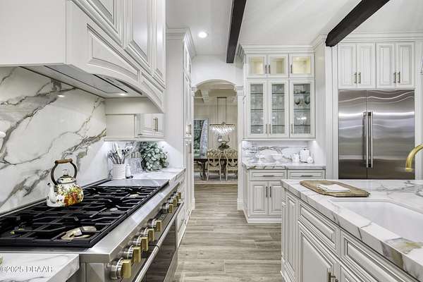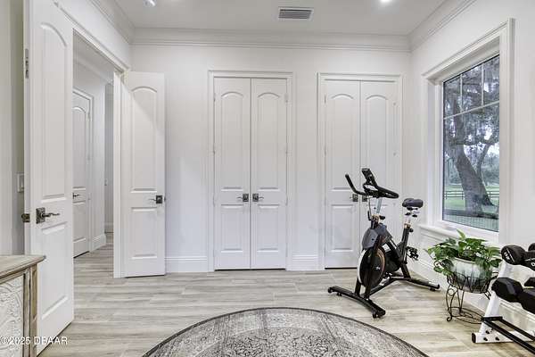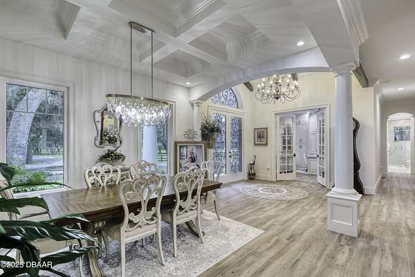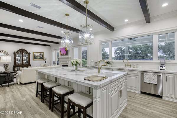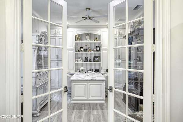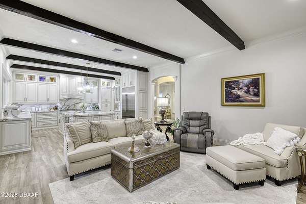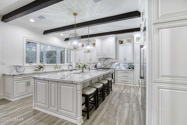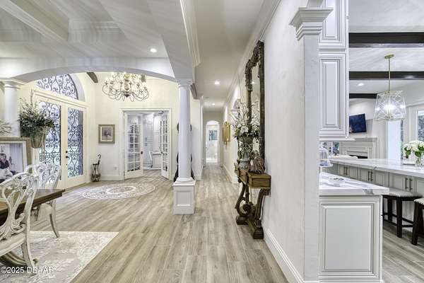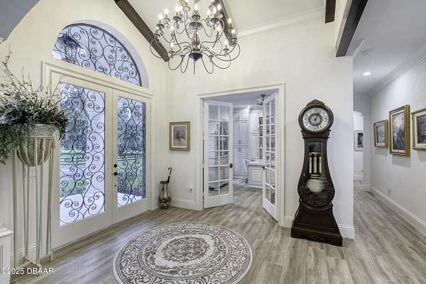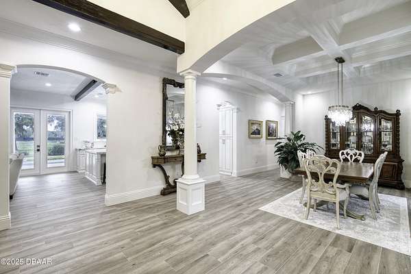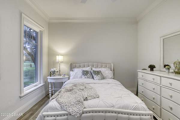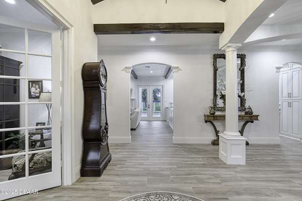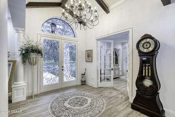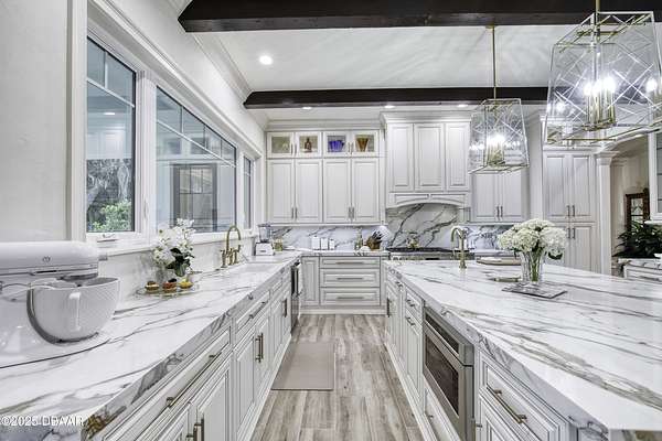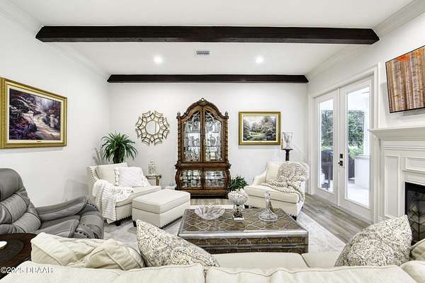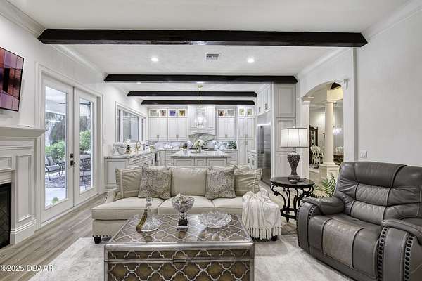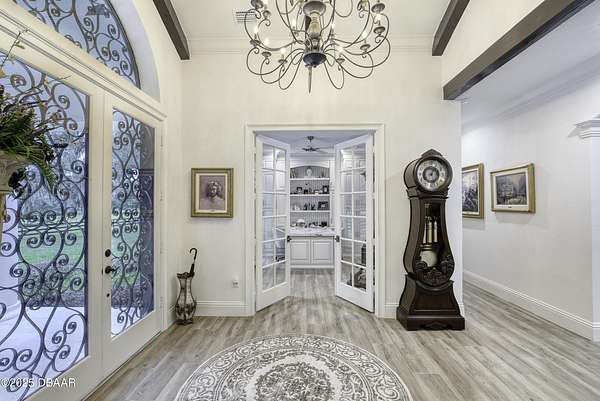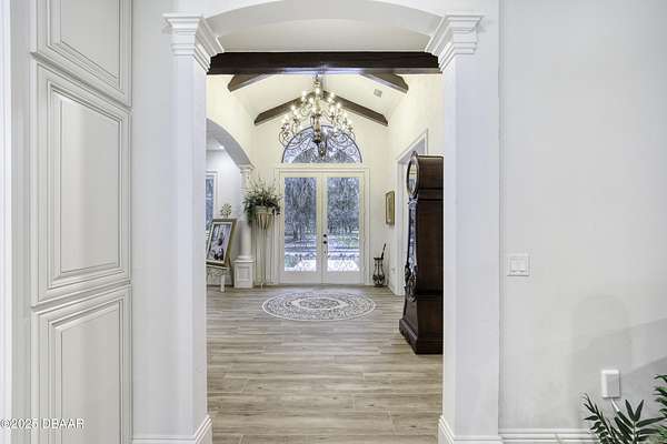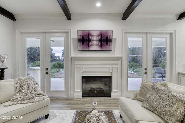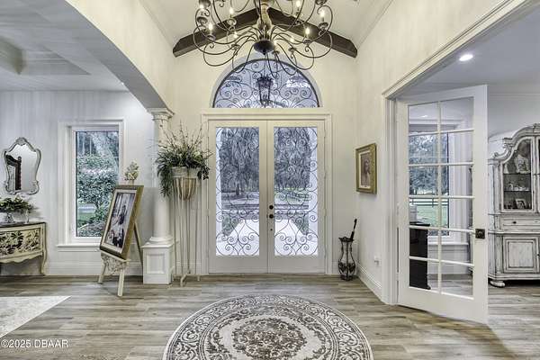 Every so often, a property comes along that is so spectacular and awe-inspiring, words simply can't do it justice. The beauty of this 11.37-acre estate, with its rolling grassy knolls peppered with centuries-old Live Oak trees, gardens of Bottle Brush and Holly trees, and fragrant hedges of night-blooming Jasmine, is a rare find. This is one of those extraordinary places. The home, with 3,310 square feet of conditioned living space, was completely rebuilt from the ground up. The renovation involved stripping the house down to its foundation and solid block walls, then meticulously crafting it with the highest quality materials and construction methods. Every detail, from the architecture to the finishes, exudes elegance and sophistication. Set against this breathtaking landscape, the property features a private in-ground pool, a charming stand-alone pergola, a five-stall barn, four grazing paddocks, and a tranquil pond in the distance-each element contributing to the home's rare appeal. The property is fully gated, with security cameras surrounding the exterior, and is pre-wired for a whole-home generator, offering peace of mind and privacy in a setting of unparalleled tranquility. A long, winding driveway leads to a circular motor court, crowned by an elegant oval fountain. From there, you ascend a set of travertine steps to the double glass and wrought-iron French entry doors, topped by an eyebrow window, and step into a three-bedroom, two-and-a-half-bath masterpiece that seamlessly blends modern design with rustic charm. To the left of the entry foyer, you'll find a home office featuring a two-sided solid quartz desk and a full wall of custom-built cabinetry. To the right, the formal dining room overlooks the fountain and majestic Oak trees, with a coffered ceiling adding a touch of sophistication. Throughout the common areas, wood-grained plank ceramic tiles provide a warm and inviting atmosphere. The bathrooms are finished with large-format porcelain tile, each with decorative tile transitions. The chef's kitchen is a standout, featuring top-of-the-line Monogram Energy Star appliances, ample quartz countertops, and a hidden pantry that will delight any culinary enthusiast. Soft-close drawers and doors, pull-out shelving in the lower cabinets, and 42" tall upper cabinets with a crowning row of glass display shelves add functionality and beauty. The center island is equipped with a prep sink, microwave, under-counter storage, and pop-up electrical outlets. The kitchen also boasts a six-burner gas stove with a griddle, split ovens, and a side-by-side fridge with an automatic ice drawer and always-full filtered water pitcher. The adjacent living room, complete with an electric fireplace, opens onto a back patio adorned with white travertine and offering sweeping views of the pool, brick-paver surround, stand-alone pergola, and the distant pond. A pavered brick walkway leads to a hidden garden tucked away to the south, further enhancing the sense of peace and seclusion. Two interconnecting wells service the home's water supply and the 11 irrigation zones across the property. These are housed in a pump house, which also includes a water purification system and water softener. The primary suite overlooks the private garden and features its own mini-split AC system for personalized comfort. The walk-in closet, fully built-out and spacious, is sure to please even the most discerning fashion lover. The primary bath offers a spa-like retreat with a glassed-in shower complete with overhead rainfall, wall, and handheld spray fixtures, as well as a separate soaking tub for ultimate relaxation. Additional features of this home include a dedicated laundry room with a stacking LG washer and dryer, a craft room for creative pursuits, two new pool pumps, a new 5-ton Bosch HVAC system, a 500-gallon above-ground propane tank, a tankless Rinnai water heater, and programmable Bosch thermostats. This offering comes blueprints and permit to build