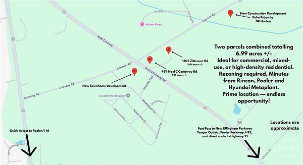 Prime Development Opportunity - 1405 Zittrouer & 489 Noel C. Conaway Rd, Guyton, GA Two adjoining parcels with endless potential in one of Effingham County's fastest-growing corridors! Located just minutes from Rincon, Pooler, and the Hyundai Metaplant, this combined site offers excellent frontage, visibility, and access-perfect for future commercial, mixed-use, or high-density residential development. Surrounded by rapid growth and upcoming commercial expansion, this property sits squarely in the path of progress. Rezoning will be necessary to unlock its full potential-ideal for townhomes, a retail plaza, mini-storage, medical offices, or a build-to-rent community. Whether you're a developer or investor, this is a rare opportunity to shape one of Effingham's most desirable corridors.