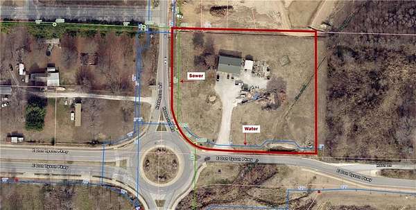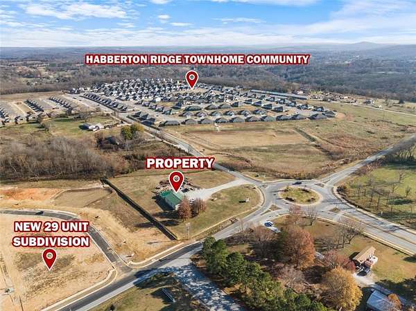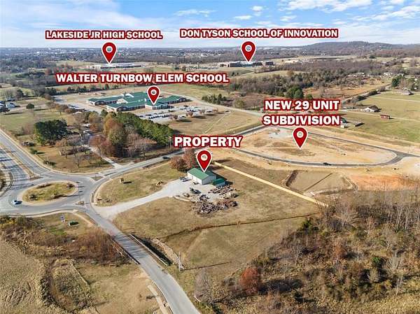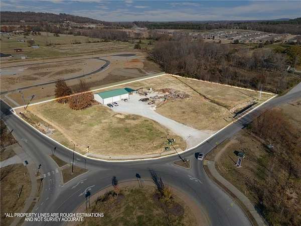 Situated just under a mile from Hwy 412 and directly adjacent to Don Tyson Pkwy, this highly visible corner lot offers endless commercial possibilities. Zoned C-2 General Commercial District, this site allows for a broad range of business uses, including convenience stores, health facilities, offices, hardware stores, auto services, and more! On-site is a versatile 40'x60' warehouse/flex space building, equipped with Red Iron Beam and Trusses, durable concrete flooring, 19 gallon electric water heater, and 3-phase electric with existing 220V outlets. The shop also features copper air lines with pressure regulators and connectors, an insulated 10' overhead door, private office, and a restroom. This property is ideal for business owners seeking expansion or investors looking for a lucrative development opportunity in
