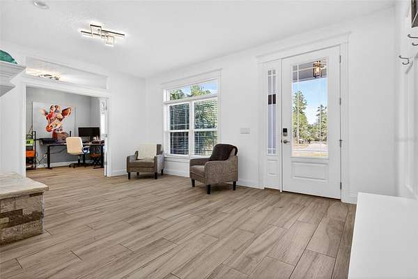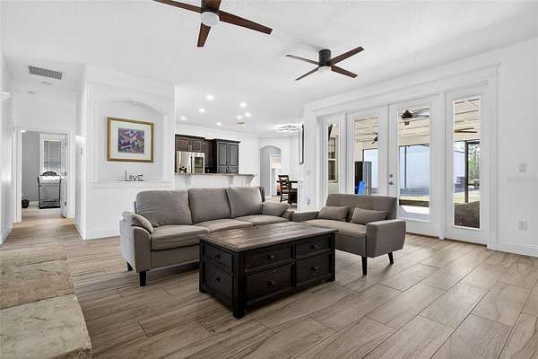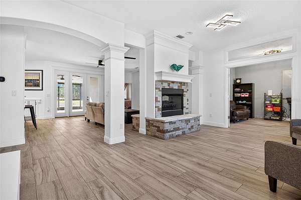 As you drive down the sweeping tree lined driveway and enter the wrought iron gates, you will feel the peacefulness that country living will bring you. As you step into this cozy country home you will feel a sense of belonging! Home offers 4 bedrooms, 3 bath (one bath is a jack and jill) and it has a bonus room/office, as well as a stunning focal point see through gas and stone fireplace that sits gracefully between the living room and family room. Can you picture yourself sitting in front of the cozy fire enjoying some quiet time? The chef's kitchen is equipped with a propane gas range, state of the art touch screen refrigerator, dishwasher, microwave and a hard connected water line for the coffee connoisseur. The sink is in the center island that is designed for gatherings of family and friends. The glass door walk in pantry features lots of shelving with plenty of storage room. Master bath has a large tiled walk in shower with multiple shower heads and a heated mirror, as well as his and hers vanity sinks and separate water closet room for privacy. The spacious master bedroom has his and hers walk in closets with designer closet shelving. The jack and jill bathroom as well as the 3rd bathroom features designer tile with tub/shower combinations. The laundry room features a freezer and a washer/dryer combination for extra room for storage. The newly epoxied floors on the screened lanai has over 400 sq. ft. for your enjoyment and the floor has recently been refinished with epoxy coating. You can watch the deer and turkey from this awesome viewpoint and if you have pets there is a large doggie door from the kitchen. The 3 car garage offers 741 sq. ft. and has two garage doors with garage door openers and plenty of room for your vehicles, it also features a new expoxy floor. Large propane tank supplies gas to the range, fireplace and tankless hot water heater for energy savings. Home is also equipped for StarLink for state of the art internet services. Now let's talk about the outside!