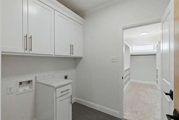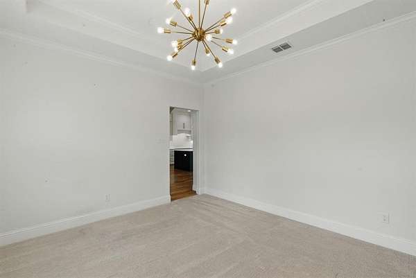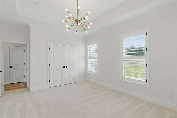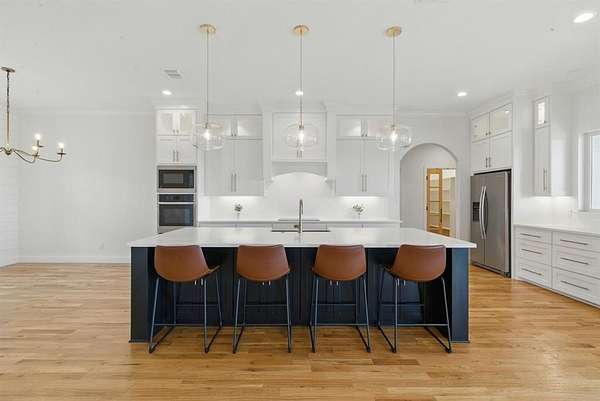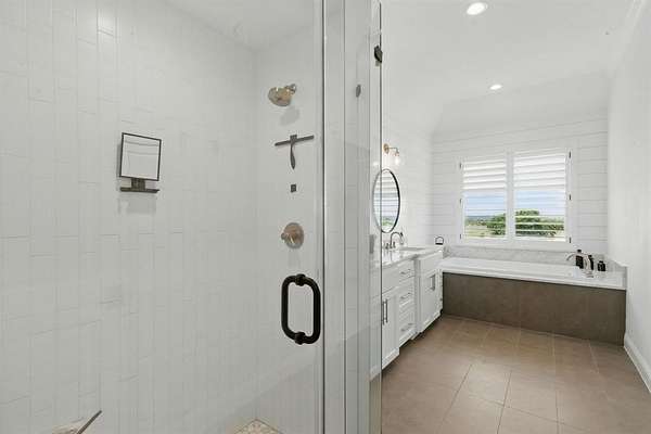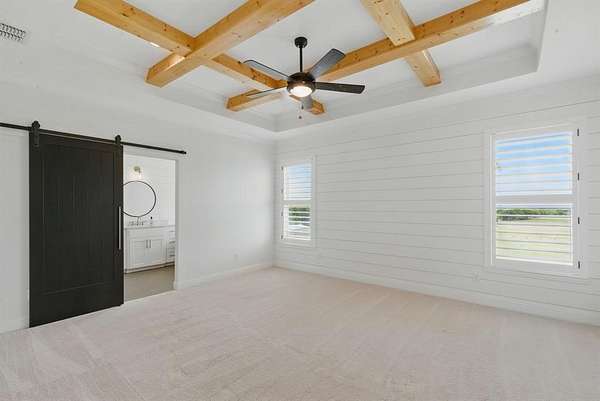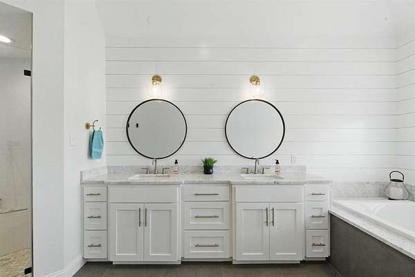 The private owner's suite includes shiplap detailing, marble finishes, a soaking tub, a spacious walk-in closet, and direct access to the laundry room. Two large secondary bedrooms plus a flexible third room provide space for an office, gym, or playroom.