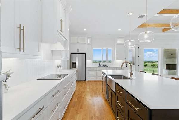 Custom built in 2020 and immaculately maintained, this move-in-ready home offers refined country living on two unrestricted acres with no HOA and sweeping western sunset views. The white painted brick exterior with cedar accents and wood headers delivers timeless curb appeal.