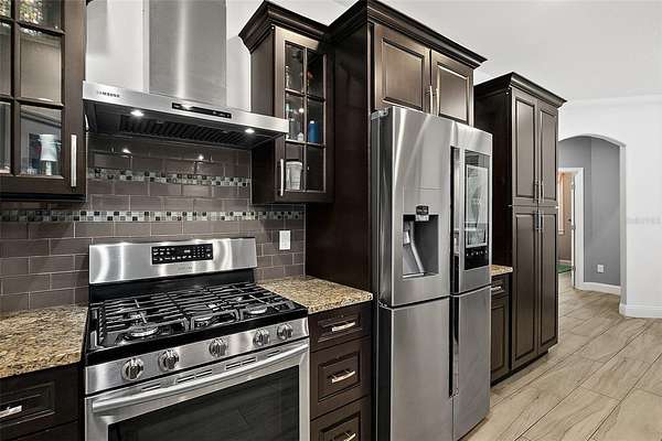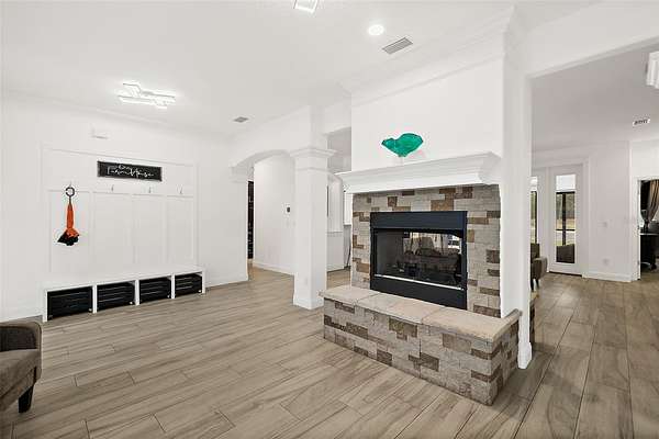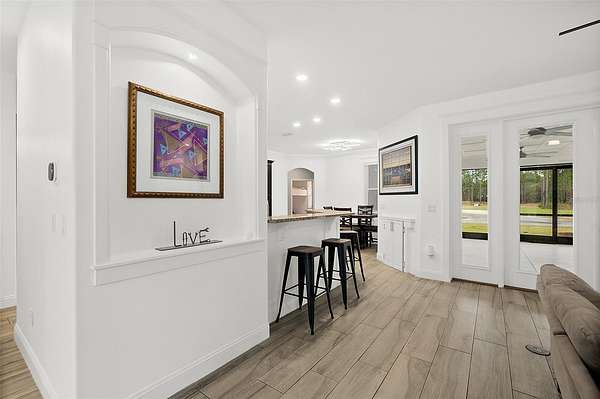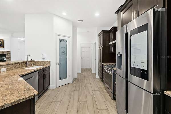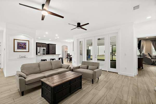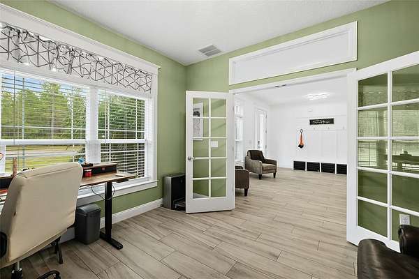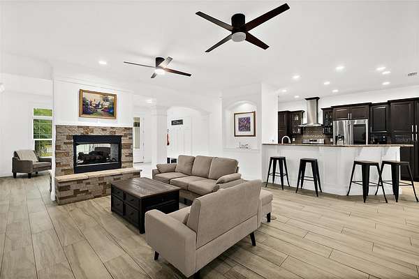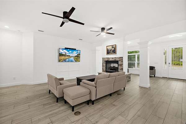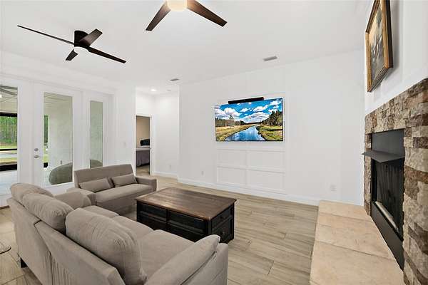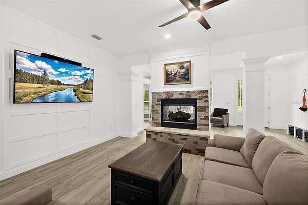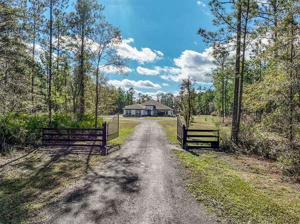 As you drive down the sweeping tree lined driveway and enter the wrought iron gates, you will feel the peacefulness that country living will bring you. As you step into this cozy country home you will feel a sense of belonging! Home offers 4 bedrooms, 3 bath (one bath is a jack and jill) and it has a bonus room/office, as well as a stunning focal point see through gas and stone fireplace that sits gracefully between the living room and family room. Can you picture yourself sitting in front of the cozy fire enjoying some quiet time? The chef's kitchen is equipped with a propane gas range, state of the art touch screen refrigerator, dishwasher, microwave and a hard connected water line for the coffee connoisseur. The sink is in the center island that is designed for gatherings of family and friends. The glass door walk in pantry features lots of shelving with plenty of storage room. Master bath has a large tiled walk in shower with multiple shower heads and a lighted mirror, as well as a large vanity sink and separate water closet room for privacy. The spacious master bedroom has his and hers walk in closets with designer closet shelving. The jack and jill bathroom as well as the 3rd bathroom features designer tile with tub/shower combinations. The laundry room features a washer/dryer combination for extra room for storage. The screened lanai has over 400 sq. ft. for your enjoyment. You can watch the deer and turkey from this awesome viewpoint and if you have pets there is a large doggie door from the kitchen. The 3 car garage offers 741 sq. ft. and has two garage doors with garage door openers and plenty of room for your vehicles. Large propane tank supplies gas to the range, fireplace and tankless hot water heater for energy savings. Now let's talk about the outside!