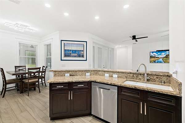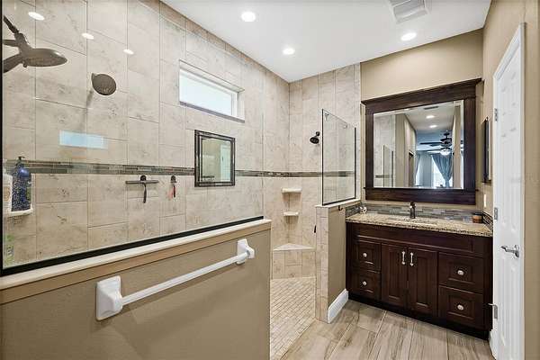 - Ceiling Fans(s), Eat-In Kitchen, High Ceilings, Kitchen/Family Room Combo, Primary Bedroom Main Floor, Solid Surface Counters, Split Bedroom, Walk-In Closet(s), Window Treatments