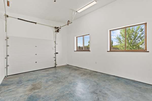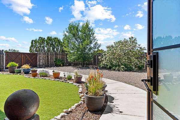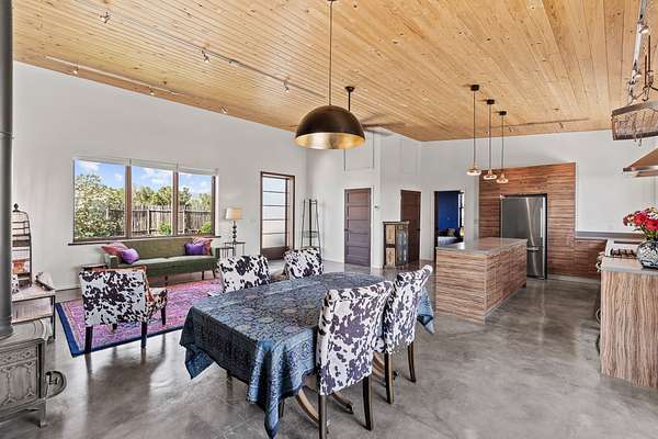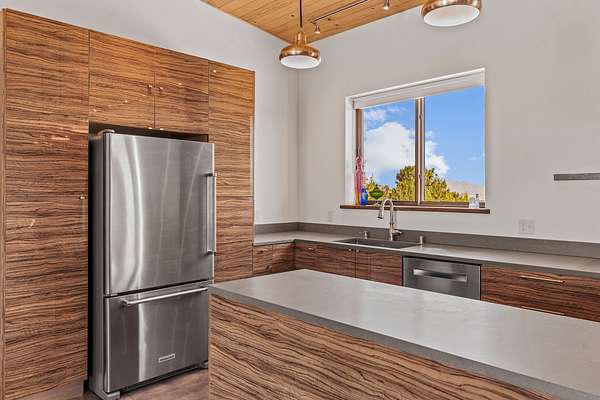 Contemporary style in a high-desert setting with breathtaking mountain views, this home sits on a spacious forty-acre lot in the foothills of the Ortiz Mountains. Fully self-reliant, it boasts utilities provided by solar, wind, and water catchment, with public electric lines available on the street. Thoughtfully designed, the home features high wood plank ceilings, polished concrete floors, and an open, modern kitchen. House is constructed of rastra for energy efficiency and fire safety. Natural light floods the space through glass doors on both the north and south sides of the house. Fenced courtyards delineate landscaped areas, while the remaining acreage remains untouched. The primary suite is cooled by a mini-split, and includes a full bath and conveniently located laundry, while a half bath serves the primary living area. On the opposite side of the house, a large bonus room offers versatility as an office, second bedroom, or art space, and leads to a one-car garage. Both the garage and bonus room are equipped with sinks. The house is warmed by radiant heat in the floors, powered by solar hot water collectors. The property includes a storage shed and shipping container, solar shed, wind generator, 9000 gallons of water storage, as well as hookups for an RV. The locationoffers easy access to town on well-maintained roads within a gated community with no HOA. Located just 21 miles from Santa Fe and near dining and entertainment options in Madrid and Cerrillos, this home provides a perfect retreat without compromising comfort or convenience.