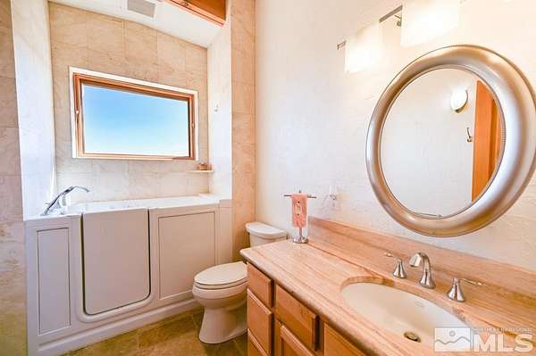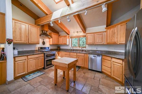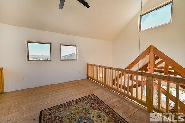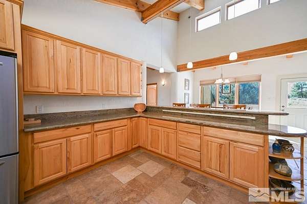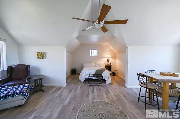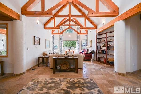 Nestled on a sprawling 10-acre lot in the breathtaking Smith Valley, this nearly 3,500 square foot custom-designed home offers an unparalleled living experience with sweeping mountain and valley views. Every inch of this 3-bedroom, 2-bath home exudes quality craftsmanship and attention to detail. This property is a must-see to truly appreciate the attention to detail and superior craftsmanship. Don't miss the opportunity to own this exceptional piece of paradise in Smith Valley. Step through the large foyer into the heart of the home, where you'll find a grand indoor atrium that invites natural light to flood the living spaces. The expansive open kitchen is a chef's dream, boasting ample counter space, a unique 3-basin sink, and a layout perfect for entertaining. The living room, with its large windows, captures the incredible panoramic views, while the wood-burning stove adds warmth and charm. A loft area above offers additional living space and access to a walk-out deck, perfect for soaking in more of those stunning vistas. The spacious split floor plan provides ultimate privacy, with a luxurious master wing. The entire home features vaulted ceilings adorned with beautiful wood beams. Radiant heat flooring runs throughout the entire home, seamlessly blending comfort with elegance, and the all-travertine tile adds a touch of timeless sophistication. The detached 4-car garage is fully insulated and features a bonus living space with a half bath above, ideal for a guest suite, office, or studio. Outside, the property is a gardener's paradise with a large orchard full of fruit trees, all equipped with a full drip system. The expansive garden area is protected by extra-tall fencing and also features a complete drip irrigation system. The Home is Fire-resistant and has legal Runway access. AGENTS: Please see the custom build features document in the D tab.