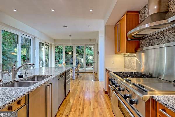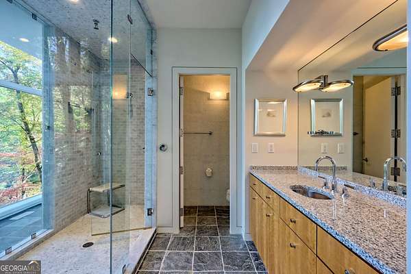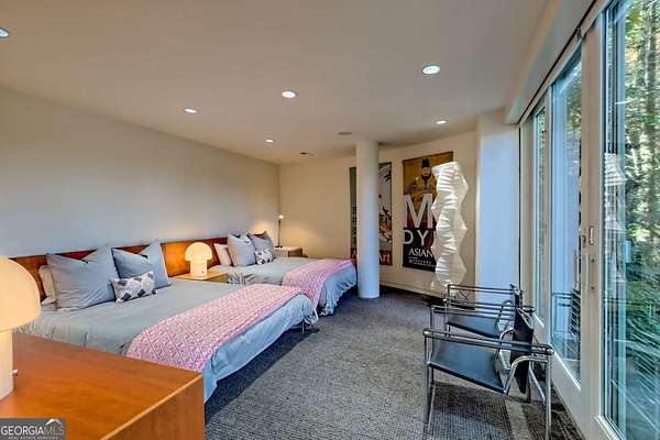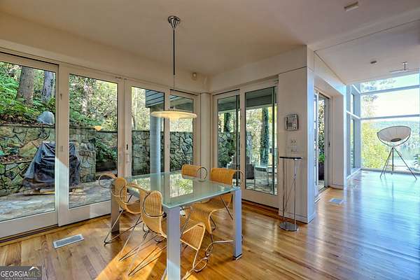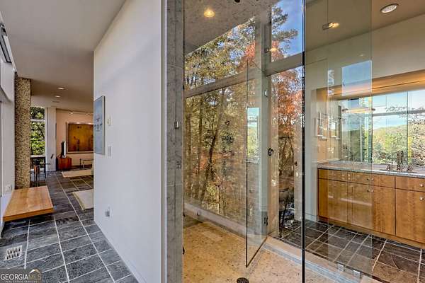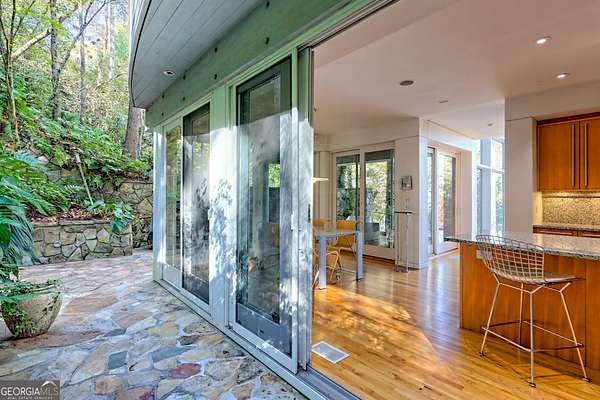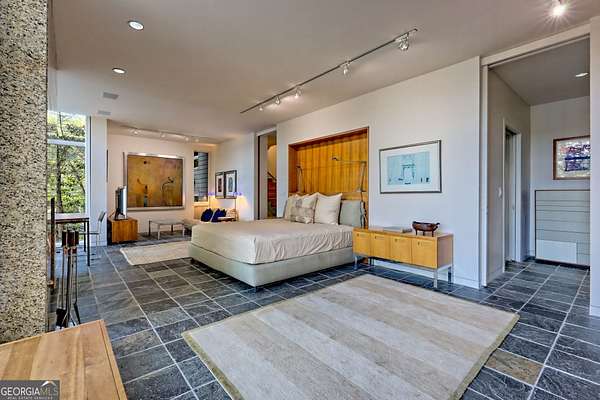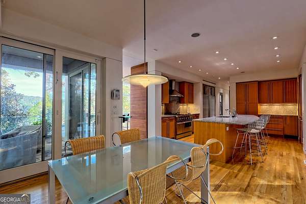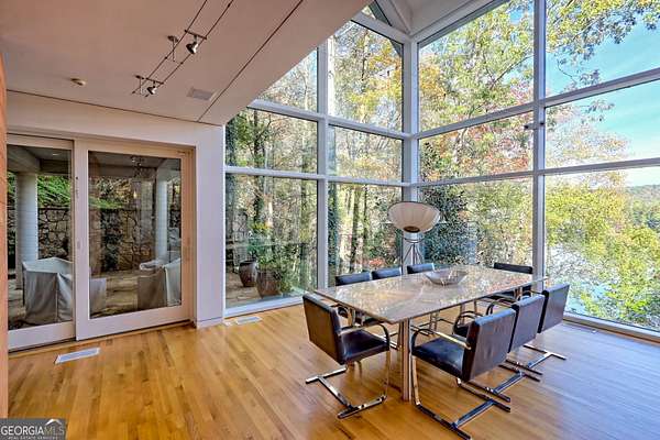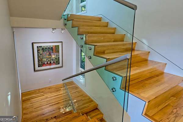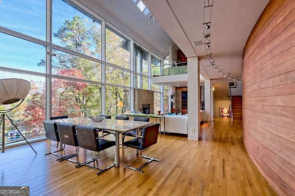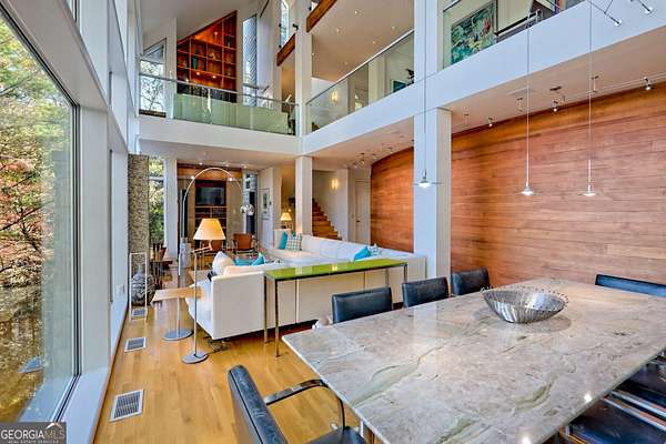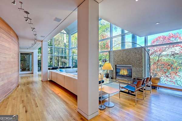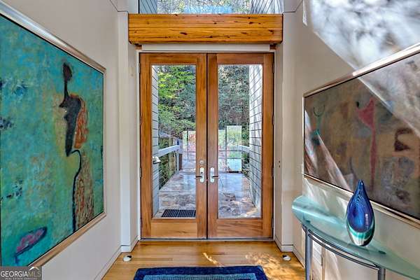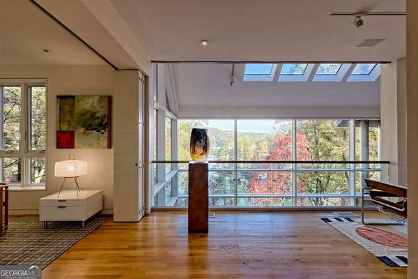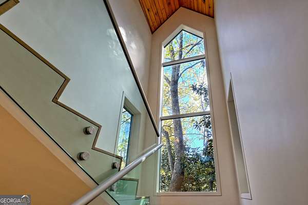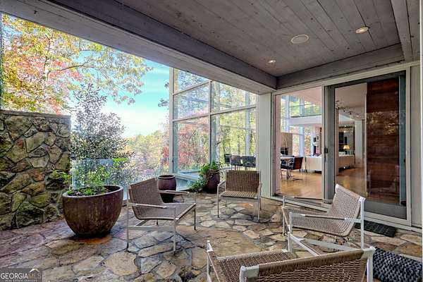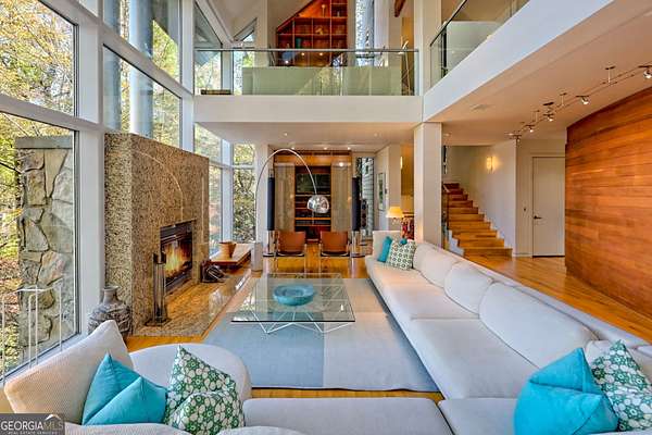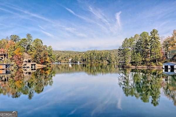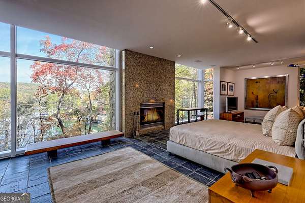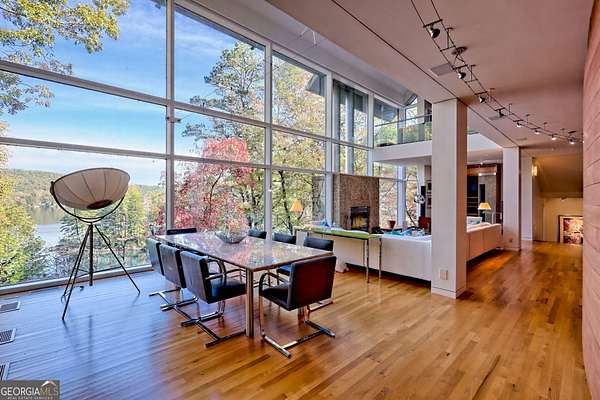 A FEE SIMPLE, 2.4+/- acre architectural masterpiece on the shores of Lake Rabun, this striking 4+ bedroom, 3.2 bathroom contemporary retreat embodies glass, light, and modern design in perfect harmony with its natural surroundings. Designed to maximize panoramic views of the lake and lush organic landscaping, this four-story home is a rare blend of artistry and livability. From the moment you arrive, you're greeted by soaring glass walls that flood every level with natural light and offer breathtaking vistas. Exposed timber beams, sleek lines, and custom finishes define the home's contemporary aesthetic, creating a sanctuary that feels both refined and deeply connected to nature. The entry level welcomes you with a spacious ensuite bedroom, a sunroom that can double as a guest suite, and a cozy TV nook perfect for relaxation. A hallway overlooks the grand living area below, framing the dramatic vertical space and forest views. The heart of the home is an open-concept living and dining area wrapped in floor-to-ceiling windows. A stunning wood-burning fireplace anchors the space, complemented by a dedicated art wall for displaying fine collections. The chef's kitchen is its own showpiece, featuring double Sub-Zero refrigerator/freezers, Thermador appliances, sleek cabinetry, and a generous island and breakfast nook. French doors open to an alfresco porch that invites year-round outdoor dining and entertaining. The primary suite occupies the entire terrace level---your private retreat with a sitting area, spa-inspired bathroom, built-ins throughout, a walk-in closet, and a secondary bedroom ideal for a nursery, study, or fitness room. Two separate water closets and a private porch overlooking the lake complete this serene space. Last but not least, the top floor offers a guest suite with ensuite bath and two impressive office spaces, ideal for remote work, creative pursuits, or reading alcoves---all with inspiring lake views. Outside, the two-story, two-stall boathouse is the ultimate expression of lakeside luxury, designed with contemporary flair and generous space for lounging, entertaining, and launching your water adventures. Finally, a two-car garage provides ample storage and convenience. 49 Richmond Lane is a rare fee simple architectural jewel: a four-story modern masterpiece on 2.4+/- acres that captures the essence of mountain-lake living through design, proportion, and light. Do not miss this one-of-a-kind opportunity for the ultimate in luxury and uniqueness on one of Georgia's most coveted lakefronts!