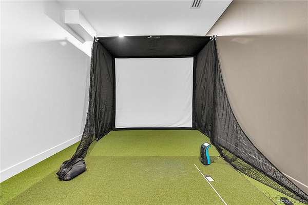 The lower level is dedicated to recreation and relaxation, featuring a full bar, home theater, and golf simulator. Outdoors, a true resort-style oasis awaits with a pool and jacuzzi, sport court, golf practice area, and multiple outdoor living spaces—all completely shielded from neighboring views.