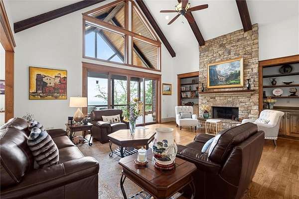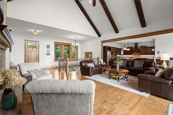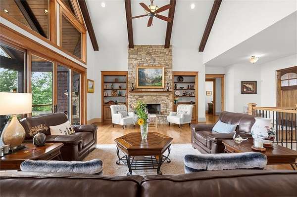 Step inside to discover a Great Room featuring soaring cathedral ceilings with exposed beams, a beautiful stone fireplace with gas logs, and custom built-ins--perfect for cozy evenings or entertaining. The Chef's Kitchen is a dream, boasting exquisite custom cabinetry, double ovens, and an oversized granite island, all open to the spacious Dining and Great Rooms for seamless entertaining.