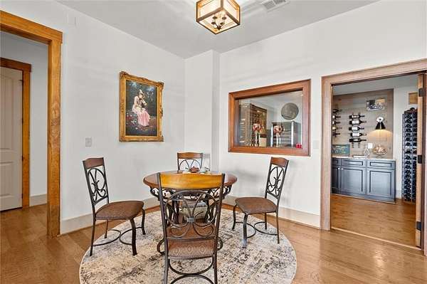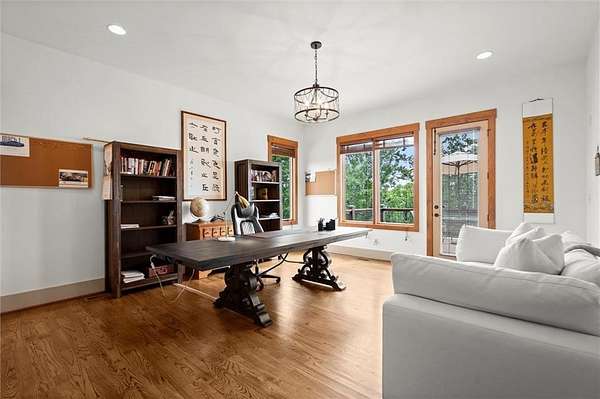 The main level showcases site-finished hardwood floors, soaring 10'+ ceilings, a spacious Primary Suite with a floor-heated spa-style bathroom, and a dedicated Office/Guest Bedroom--each detail reflecting top-tier craftsmanship and thoughtful design. A secondary suite on the opposite side of the home offers ideal accommodations for guests or serves perfectly as a private professional workspace.