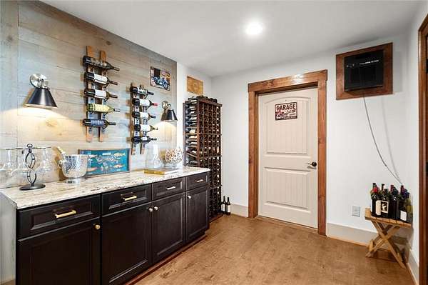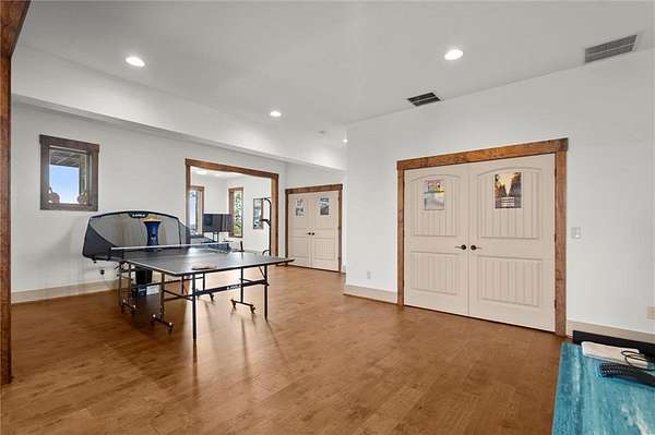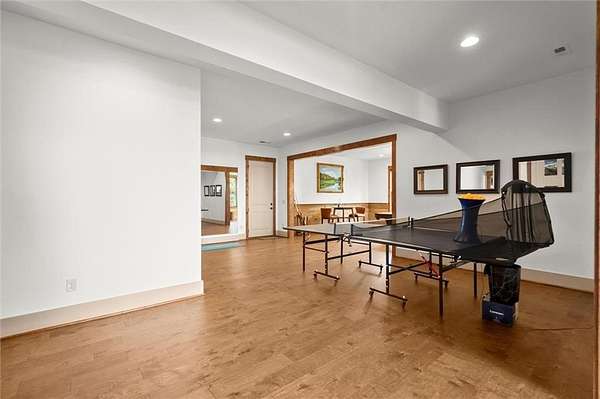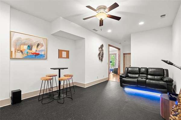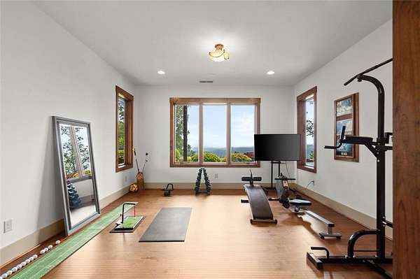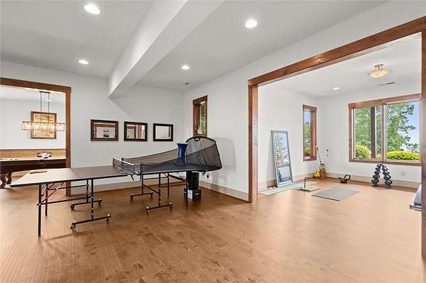 Downstairs, the terrace level is ideal for entertaining, with a spacious Family Room, a dedicated temperature control Wine Storage Room, two additional Bedrooms, and a full Bath with exterior pool access. A cozy home theater and sleek, modern-style open bar set the stage for unforgettable family movie nights and lively gatherings with friends. There's also a fully finished personal gym, offering flexible space for fitness, hobbies, or recreation. An extra plumbing system is already in place for an additional full bathroom, providing further potential for customization.