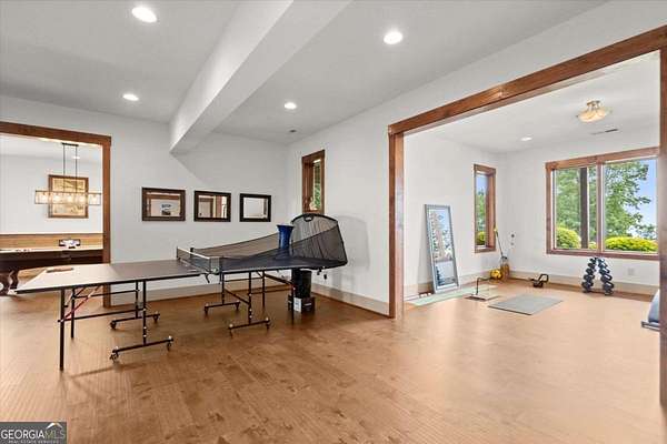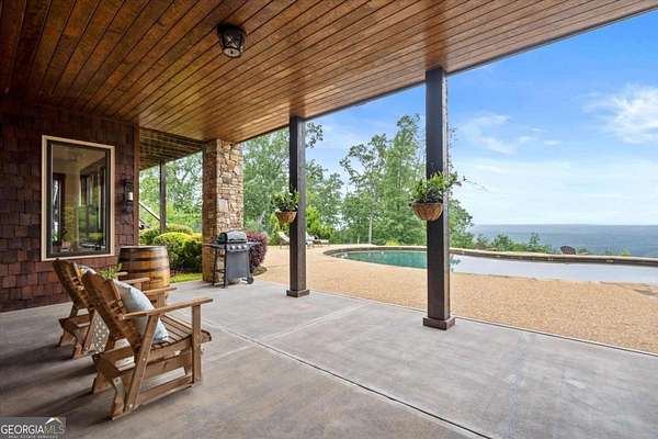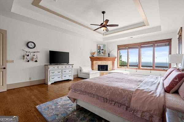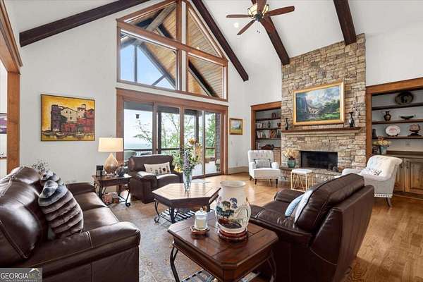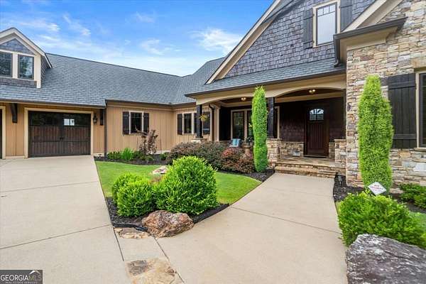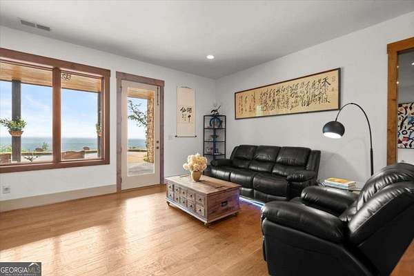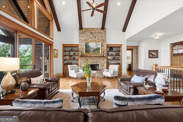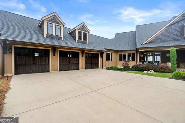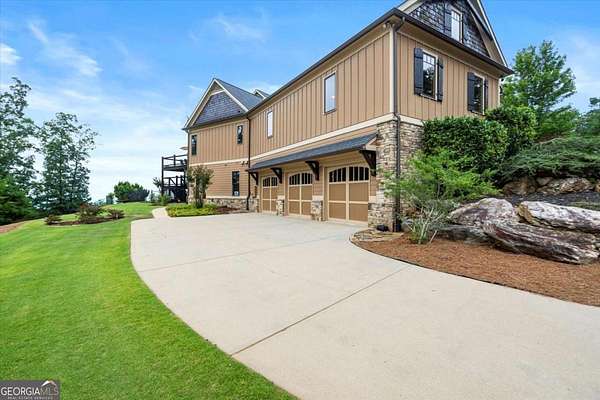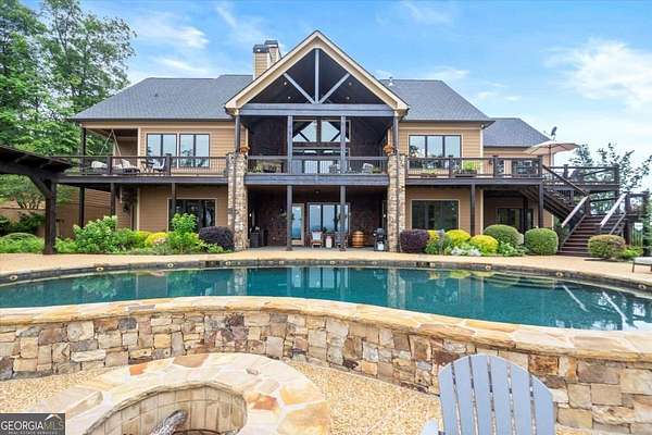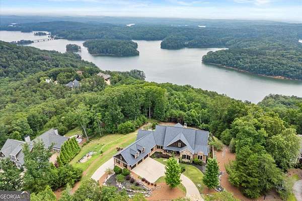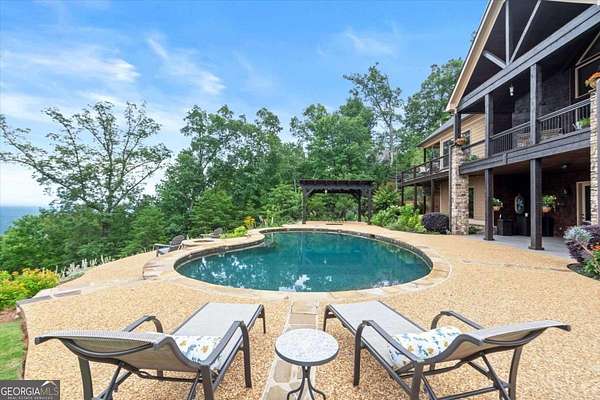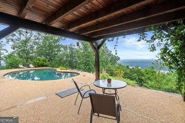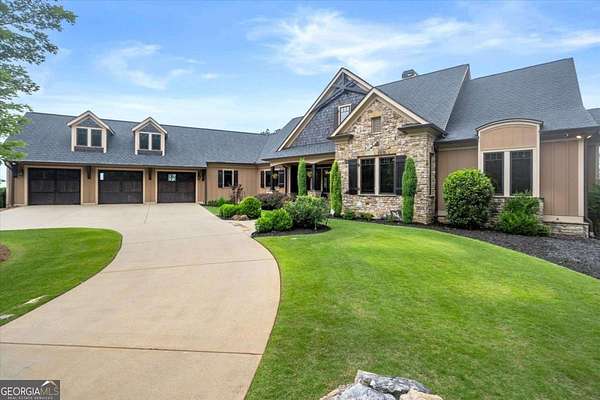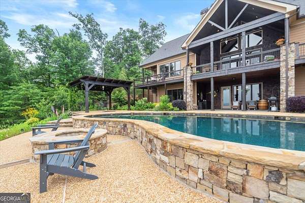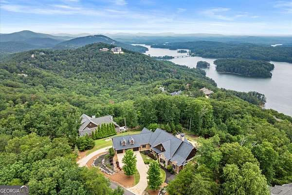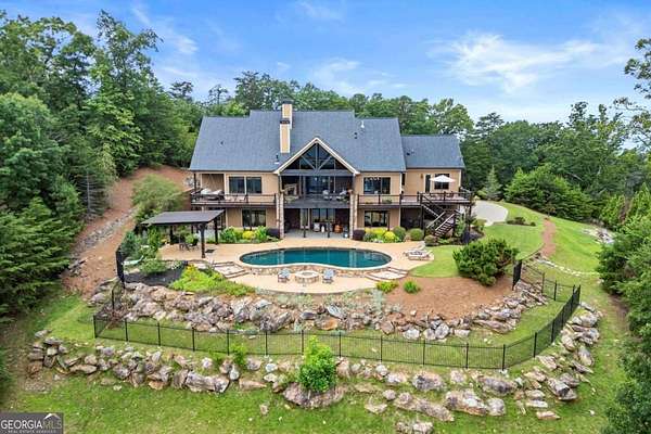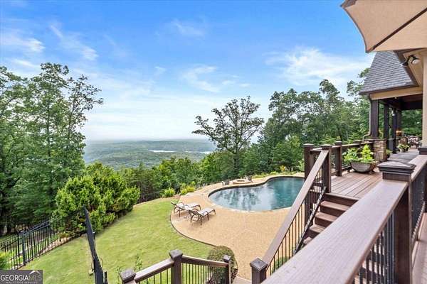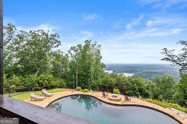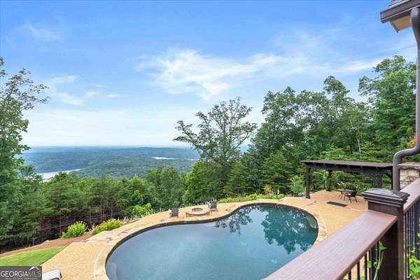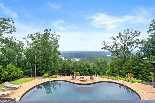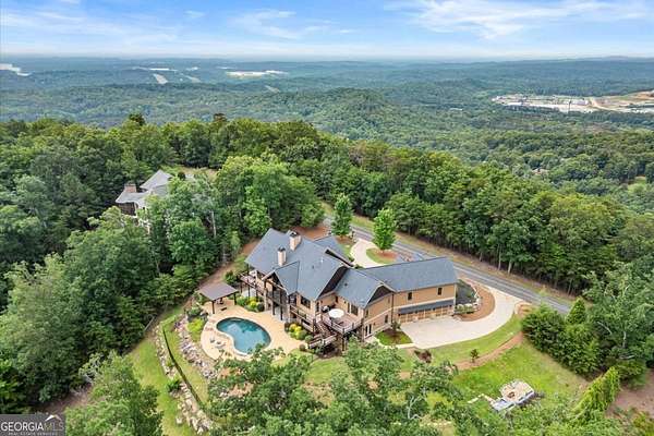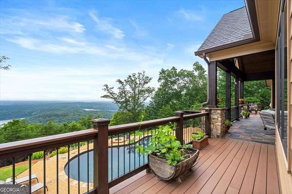 Stunning Custom-Built Craftsman Home Nestled in an exclusive gated community with Breathtaking Panoramic Lake & Mountain Views from nearly every room. From the expansive Trex deck that stretches across the back of the home, to the terrace-level porch and main living spaces, the outdoors is always in view. Step inside to discover a Great Room featuring soaring cathedral ceilings with exposed beams, a beautiful stone fireplace with gas logs, and custom built-ins-perfect for cozy evenings or entertaining. The Chef's Kitchen is a dream, boasting exquisite custom cabinetry, double ovens, and an oversized granite island, all open to the spacious Dining and Great Rooms for seamless entertaining. The main level showcases site-finished hardwood floors, soaring 10'+ ceilings, a spacious Primary Suite with a floor-heated spa-style bathroom, and a dedicated Office/Guest Bedroom-each detail reflecting top-tier craftsmanship and thoughtful design. A secondary suite on the opposite side of the home offers ideal accommodations for guests or serves perfectly as a private professional workspace. Downstairs, the terrace level is ideal for entertaining, with a spacious Family Room, a dedicated temperature control Wine Storage Room, two additional Bedrooms, and a full Bath with exterior pool access. A cozy home theater and sleek, modern-style open bar set the stage for unforgettable family movie nights and lively gatherings with friends. There's also a fully finished personal gym, offering flexible space for fitness, hobbies, or recreation. An extra plumbing system is already in place for an additional full bathroom, providing further potential for customization. Enjoy the outdoors in your Pebble Tec, heated, saltwater pool or unwind by the firepit as you take in the extraordinary views. With six spacious garage bays, there's room for everything-from cars to boats, from living, work to hobbies. This home is elevator-ready, adding future convenience. The community offers resort-style amenities including a clubhouse, pool, and tennis courts, and it's just minutes from I-75, express lanes, and Hwy 41 for easy access to shopping, dining, and travel. Come experience luxury, comfort, and unforgettable views-this is your forever home!