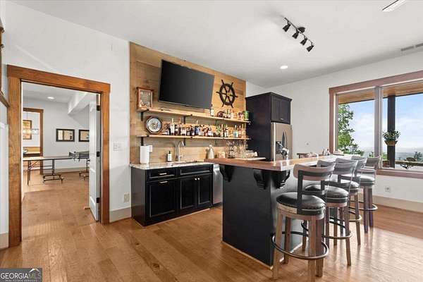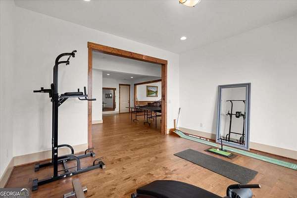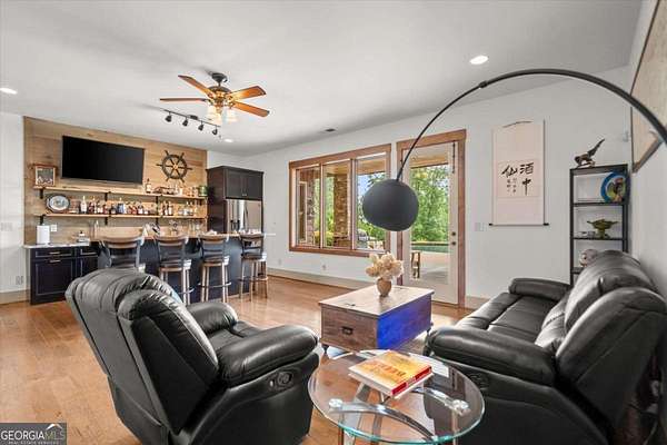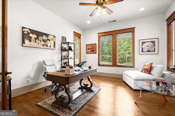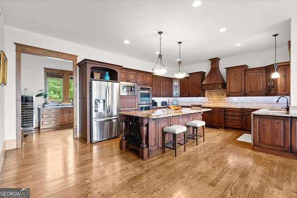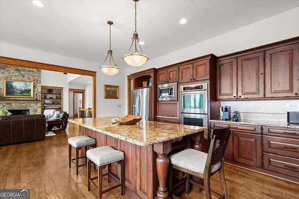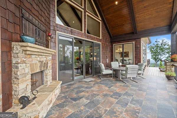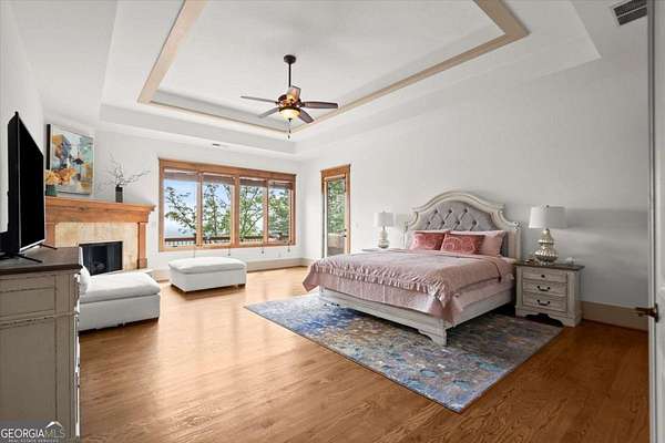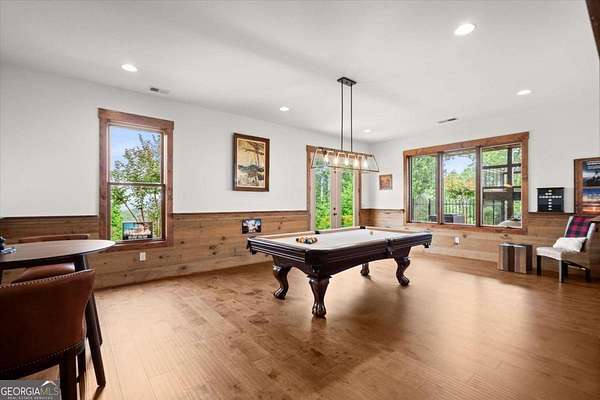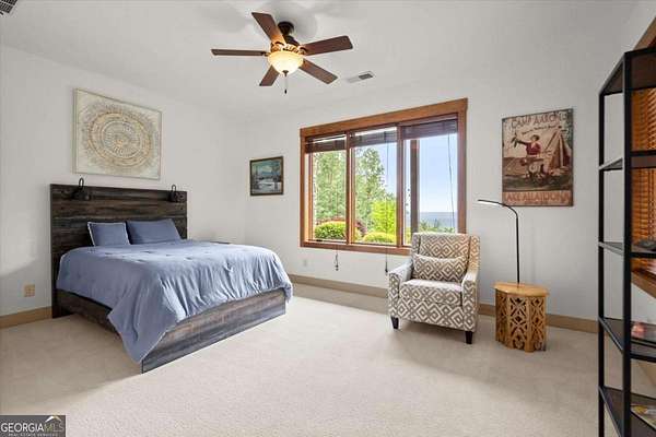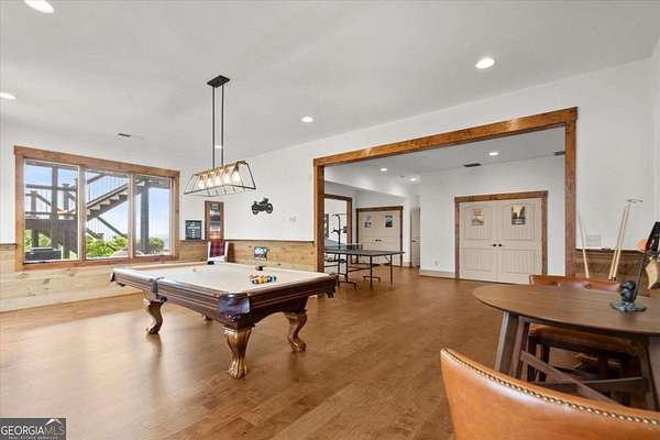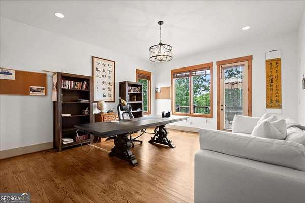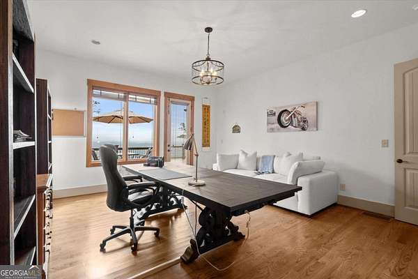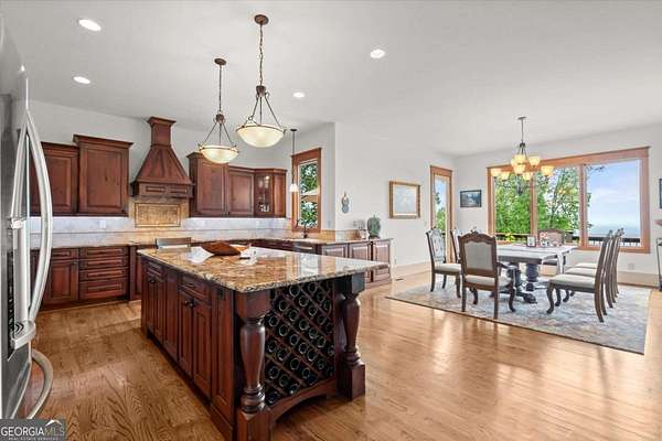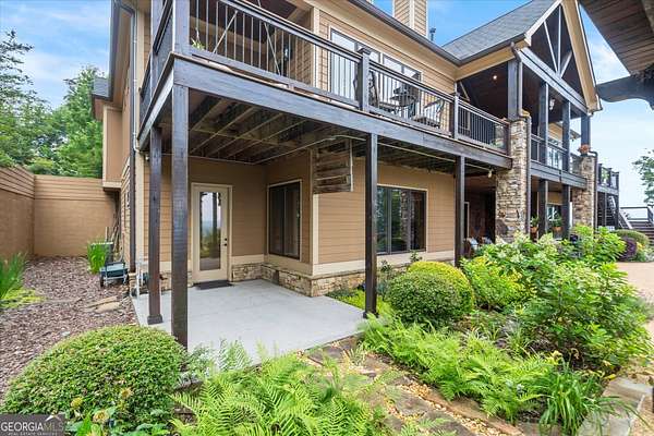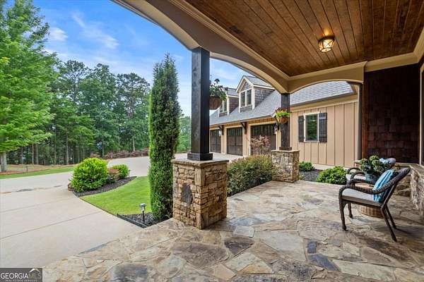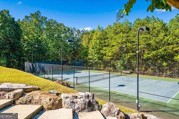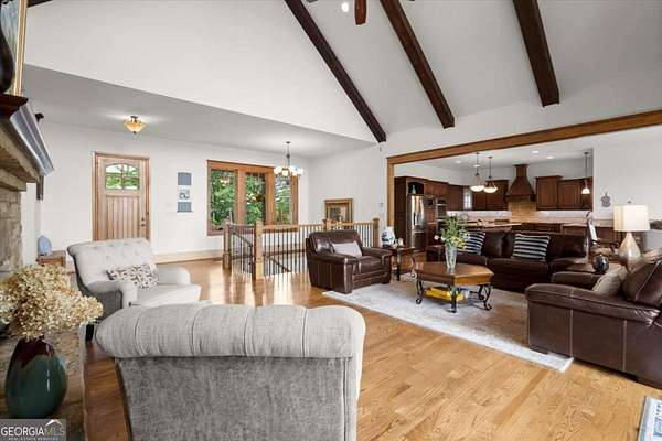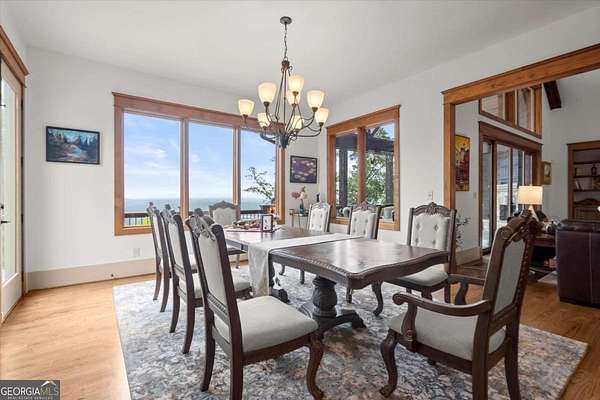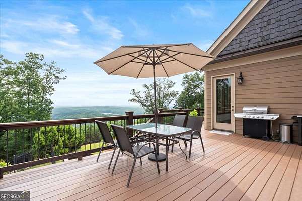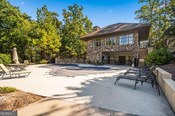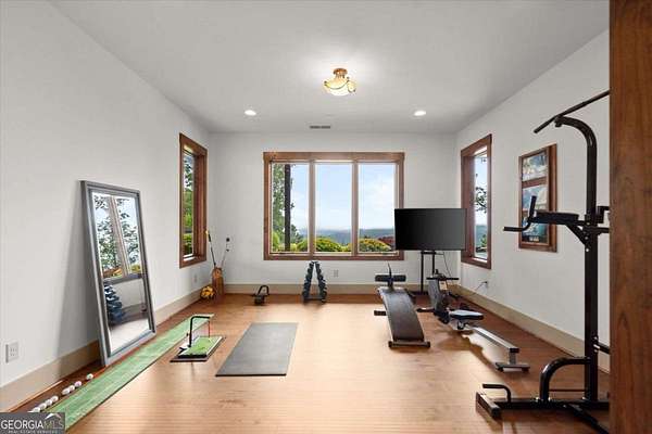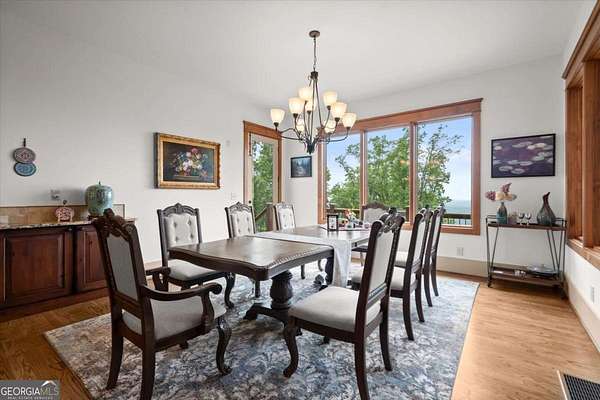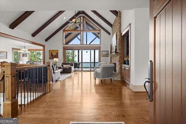 Stunning Custom-Built Craftsman Home Nestled in an exclusive gated community with Breathtaking Panoramic Lake & Mountain Views from nearly every room. From the expansive Trex deck that stretches across the back of the home, to the terrace-level porch and main living spaces, the outdoors is always in view. Step inside to discover a Great Room featuring soaring cathedral ceilings with exposed beams, a beautiful stone fireplace with gas logs, and custom built-ins-perfect for cozy evenings or entertaining. The Chef's Kitchen is a dream, boasting exquisite custom cabinetry, double ovens, and an oversized granite island, all open to the spacious Dining and Great Rooms for seamless entertaining. The main level showcases site-finished hardwood floors, soaring 10'+ ceilings, a spacious Primary Suite with a floor-heated spa-style bathroom, and a dedicated Office/Guest Bedroom-each detail reflecting top-tier craftsmanship and thoughtful design. A secondary suite on the opposite side of the home offers ideal accommodations for guests or serves perfectly as a private professional workspace. Downstairs, the terrace level is ideal for entertaining, with a spacious Family Room, a dedicated temperature control Wine Storage Room, two additional Bedrooms, and a full Bath with exterior pool access. A cozy home theater and sleek, modern-style open bar set the stage for unforgettable family movie nights and lively gatherings with friends. There's also a fully finished personal gym, offering flexible space for fitness, hobbies, or recreation. An extra plumbing system is already in place for an additional full bathroom, providing further potential for customization. Enjoy the outdoors in your Pebble Tec, heated, saltwater pool or unwind by the firepit as you take in the extraordinary views. With six spacious garage bays, there's room for everything-from cars to boats, from living, work to hobbies. This home is elevator-ready, adding future convenience. The community offers resort-style amenities including a clubhouse, pool, and tennis courts, and it's just minutes from I-75, express lanes, and Hwy 41 for easy access to shopping, dining, and travel. Come experience luxury, comfort, and unforgettable views-this is your forever home!