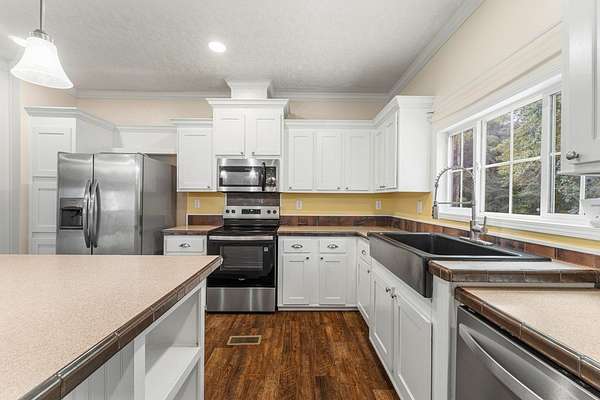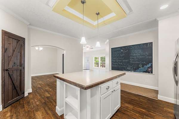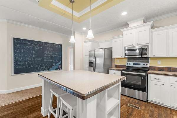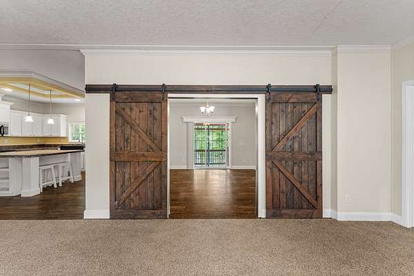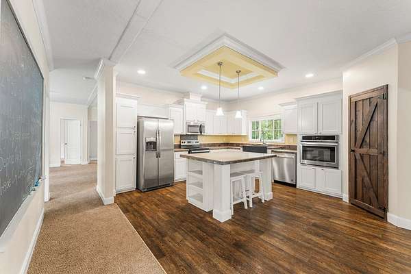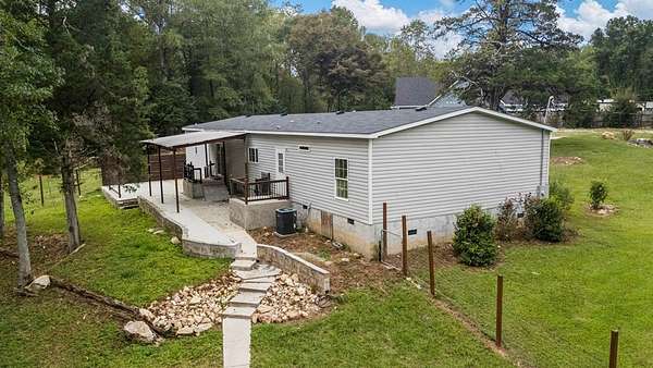 Welcome to 490 Barnes Mill Road, a Charming 3 Acre Country Retreat in Harris County! Built in 2020, this beautifully updated manufactured home is conveniently located just outside Hamilton city limits, offering the privacy of county living with quick access to town. Mostly cleared and partially wooded, The 3 acres is beautifully landscaped, fully fenced and bordered by Palmetto creek. There is so much to enjoy including 4-wheeler trails, a fire pit, raised bed garden, tiered back patio with a expansive view of the entire back property. There is even the frame for a projector screen outside to watch the game or your favorite movie. This home blends peaceful outdoor living with stylish modern features, making it the perfect escape while still being close to conveniences. Step inside to find a spacious 4 bed, 2 bath, 2,432 sq/ft home with all the upgrades including high-quality carpet, drywall, and 9' specialty ceilings. The kitchen is a showstopper with white cabinets, a large island, TWO ovens, new appliances, a farmhouse-style ceramic sink, and even a built-in chalkboard wall for family notes. The adjoining dining room is separated by wooden barn doors that open to the living room. There is an additional family room with a modern electric fireplace and mantel making it perfect for entertaining! The primary suite offers a jaw dropping bathroom, including a huge walk-in closet with specialty shelving, a double vanity, a soaking tub for relaxation and an oversized walk-in shower. Each additional bedroom offers generous closet space, natural light, and cozy carpeting. The laundry/mudroom is built for busy families with a sink, storage, and cubbies for coats, shoes, and backpacks. This home is move-in ready, beautifully landscaped and ready to be your new home. Call for your showing today!