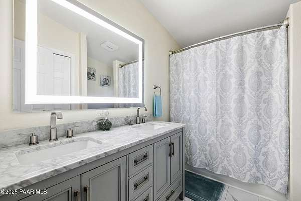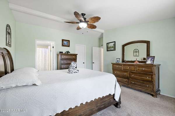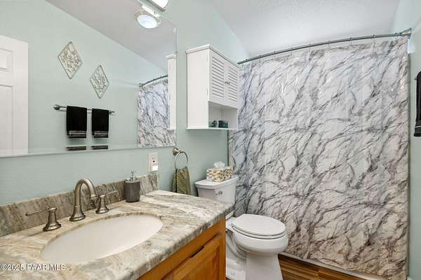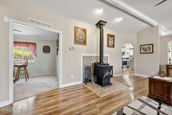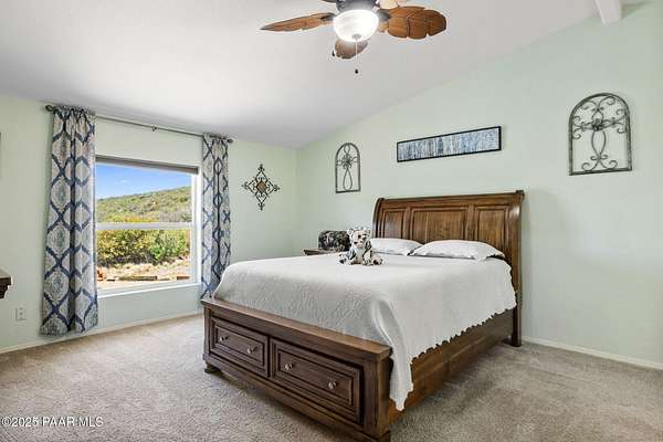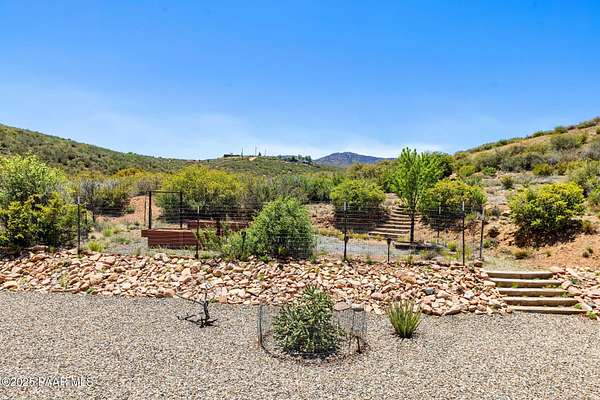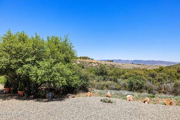 Welcome to your ultimate private sanctuary nestled on over 7 acres of vegetated picturesque land. Surrounded by rolling hills and panoramic views of Mingus Mountain. This immaculately keep property is warm and inviting and offers 2 spacious bedrooms with an added office/potential 3rd bedroom. Oversized detached 3 car garage that includes an additional hobby room, office or guest quarters. This rare gem is located approx. 1/3 of a mile off of paved roads and boast a generous living space, a wood burning stove, engineered hard wood flooring and has been beautifully updated. The spacious kitchen shines with new cabinetry, new granite counter tops, large 8' island, stainless steel appliances and a separate dining room for formal dining. The generous primary bedroom with walk in closet also has a nicely updated primary bath with new flooring, cabinetry, shower surround and linen closet. The added flex room above garage is equipped with a ductless heating/cooling system and offers the opportunity for added guest space, home office or the perfect hobby space. Insulated detached garage is an inviting work space with extra room for work bench, storage and provides 10'+ ceilings. PLUS, RV Parking is also available with convenient 50 amp charging and an RV dump. Large storage shed to accommodate additional storage and organizational needs. Step out onto the expansive 12 x 40 trex deck to enjoy panoramic views and summer evening stars. Low maintenance hardscape, mature fruit and almond trees and a fenced garden. Perfect for homeowners looking too create their dream mini ranch or equestrian homestead. Country setting with the conveniences of shopping, entertainment and medical just 15 minutes away. Indulge yourself with a life style of peaceful rural living.New Roof 2018, Prior Well inspection 2020 10+ gpm, Whole house water filter and soft water system installed, Whole house surge protector installed. Newly Graded & Chip Sealed Driveway improvement added to property July 2025.